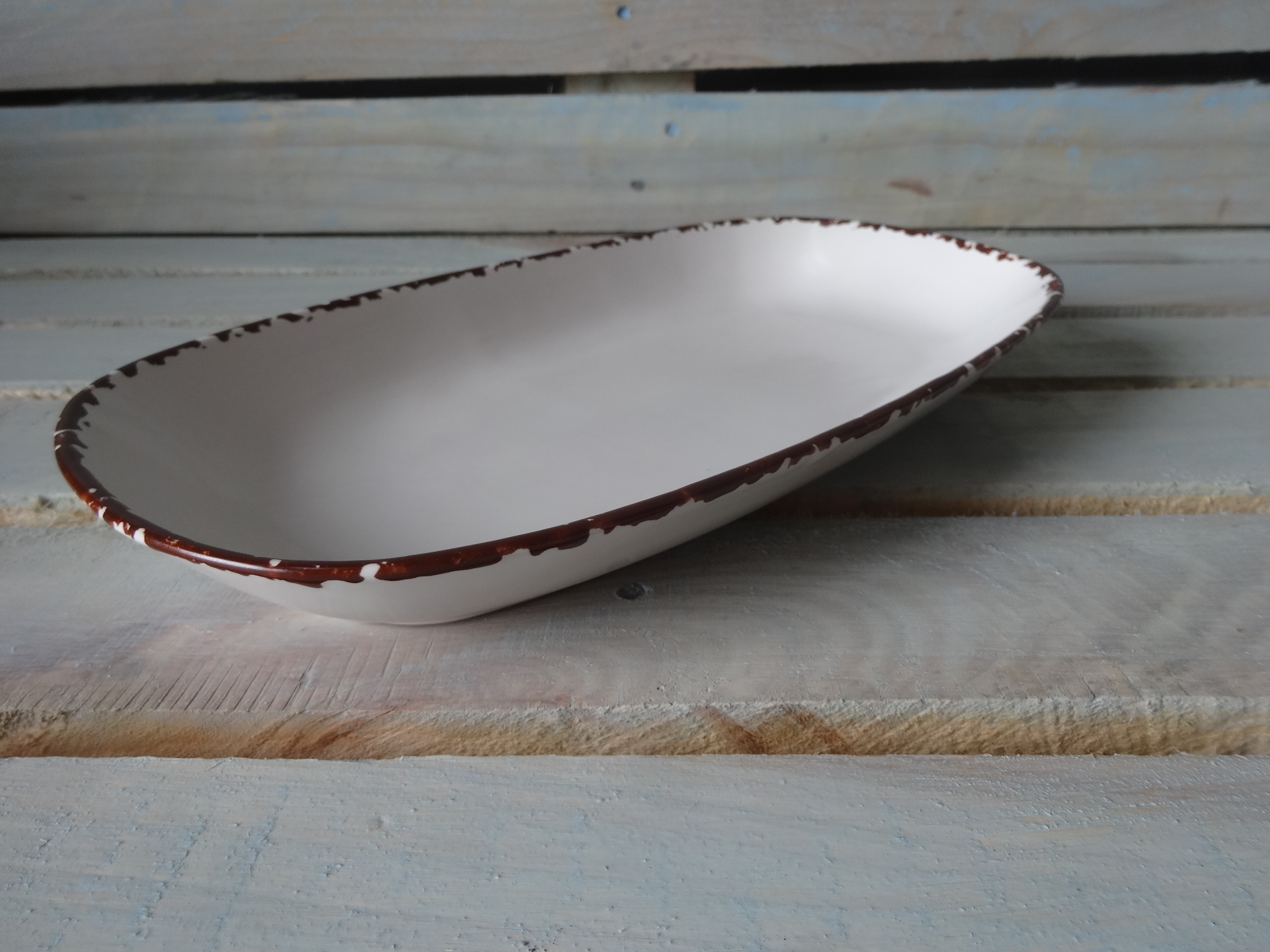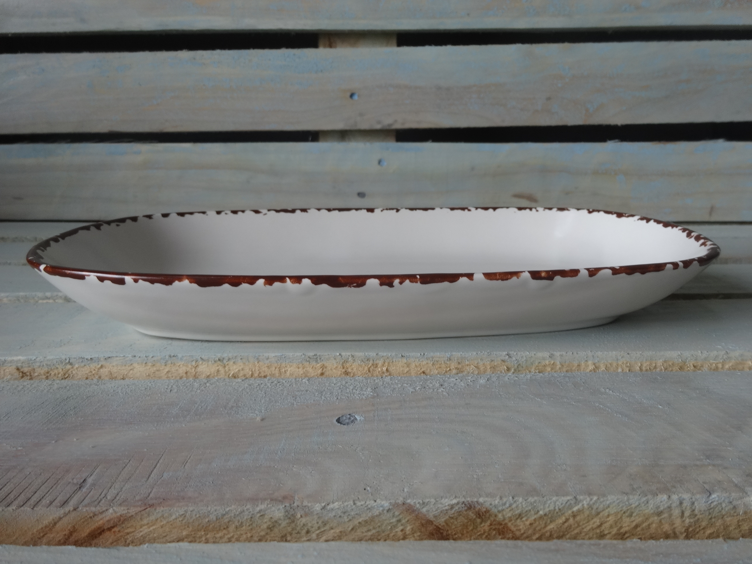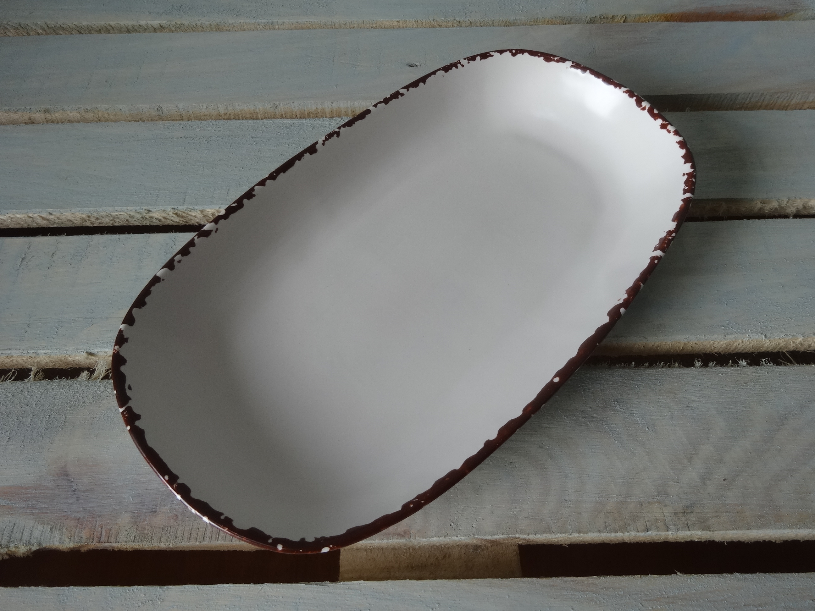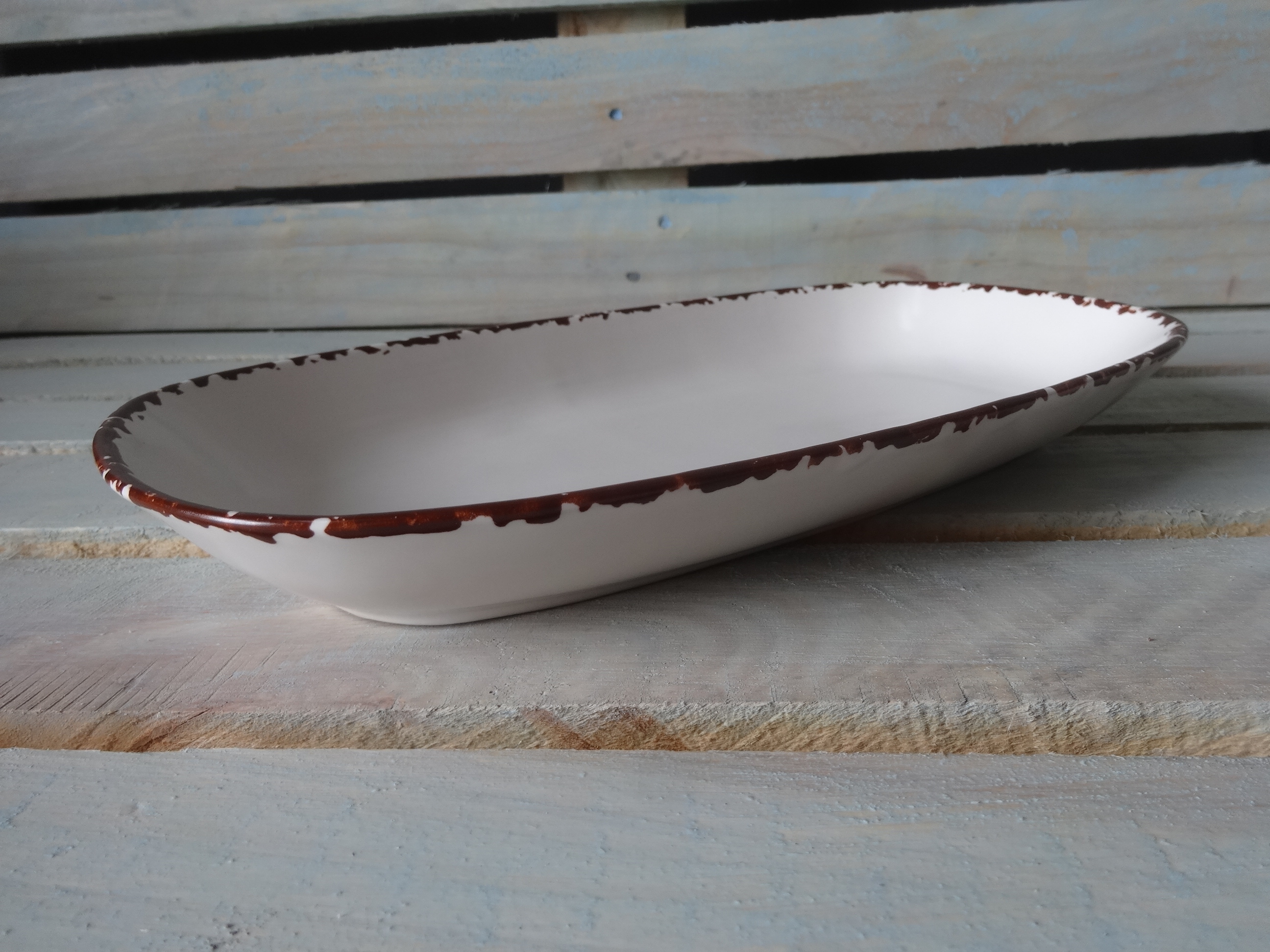 Большое блюдо овально-прямоугольной формы с высокими бортиками. Оригинальная подача в таком блюде гарантирована. Матовая поверхность.