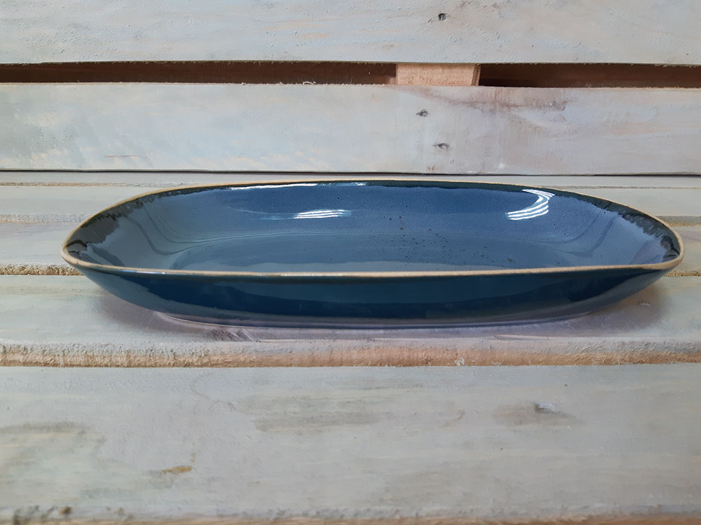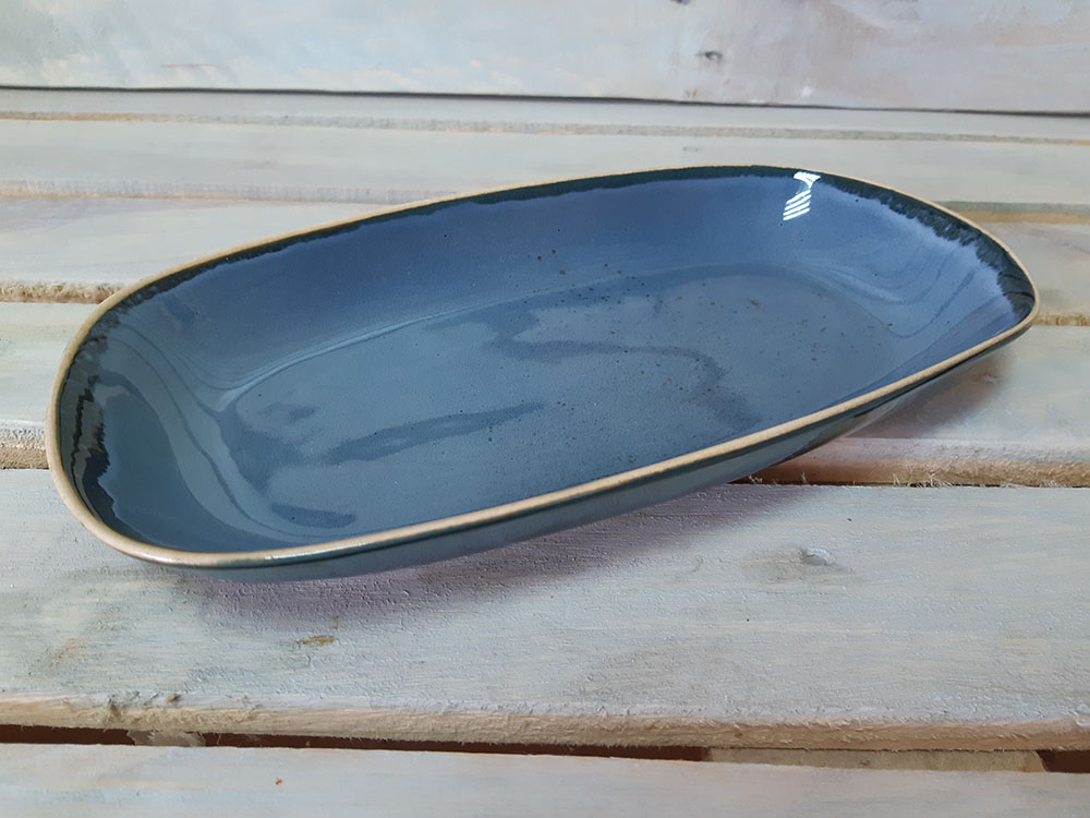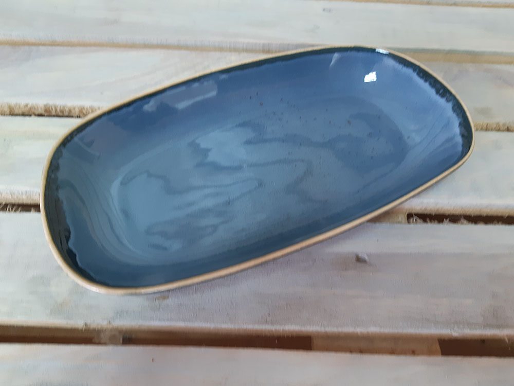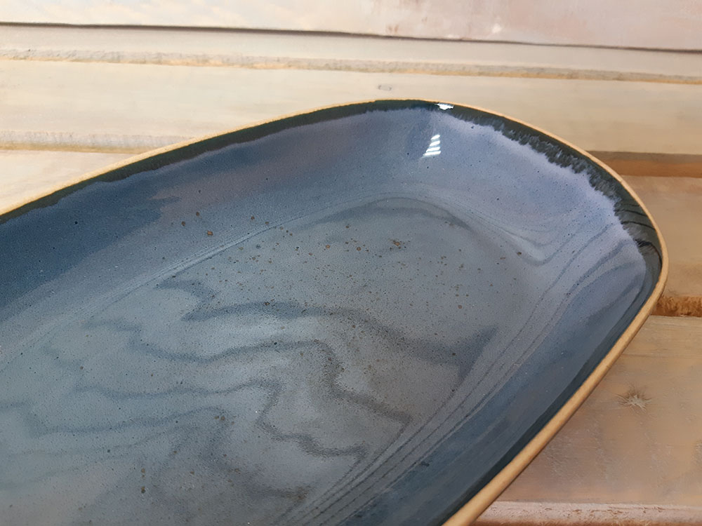Большое блюдо moderno ovale имеет овально-прямоугольную форму с высокими бортиками. На таком блюде удобно подавать как холодные закуски, так и горячие угощения, накладывать салат, фрукты и даже сладости. Оригинальная подача в таком блюде гарантирована. Зеркальная глянцевая поверхность с сине - голубыми загадочными разводами, бликами и чёрными крапинами.