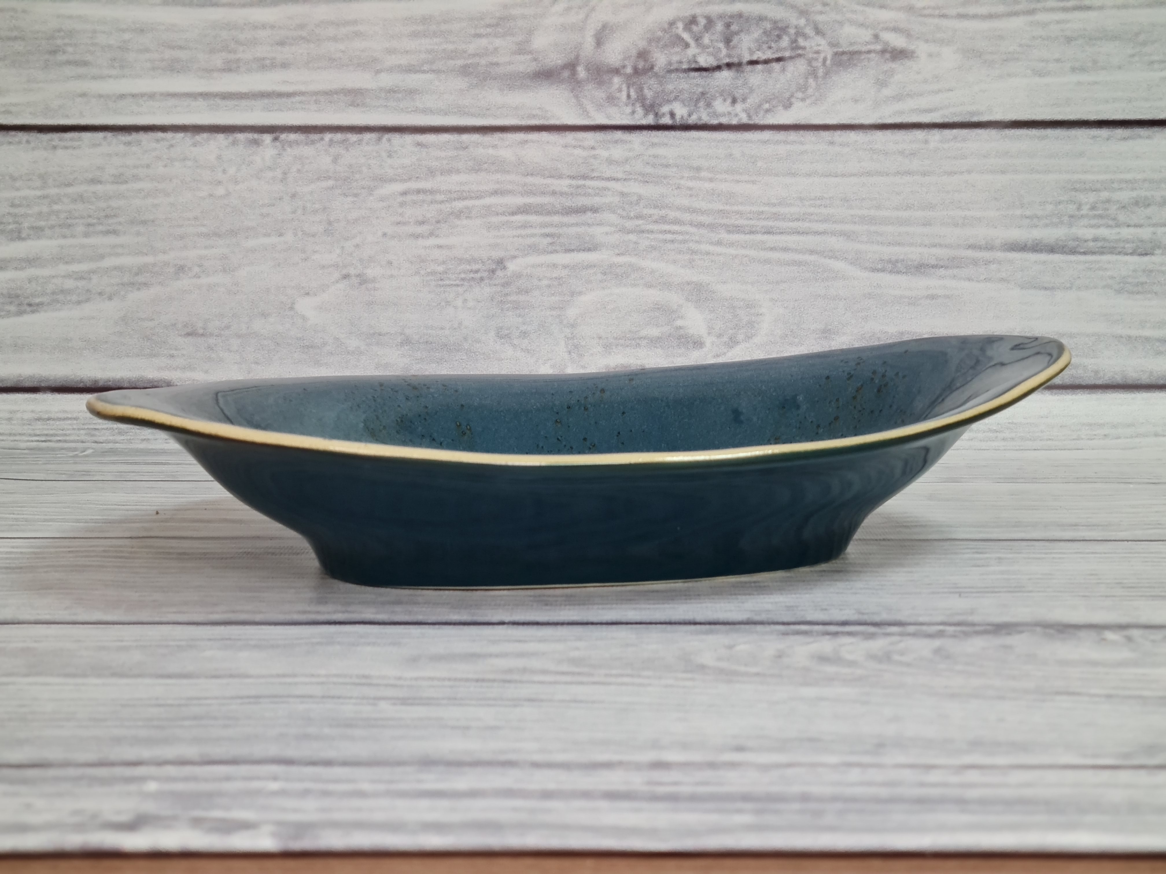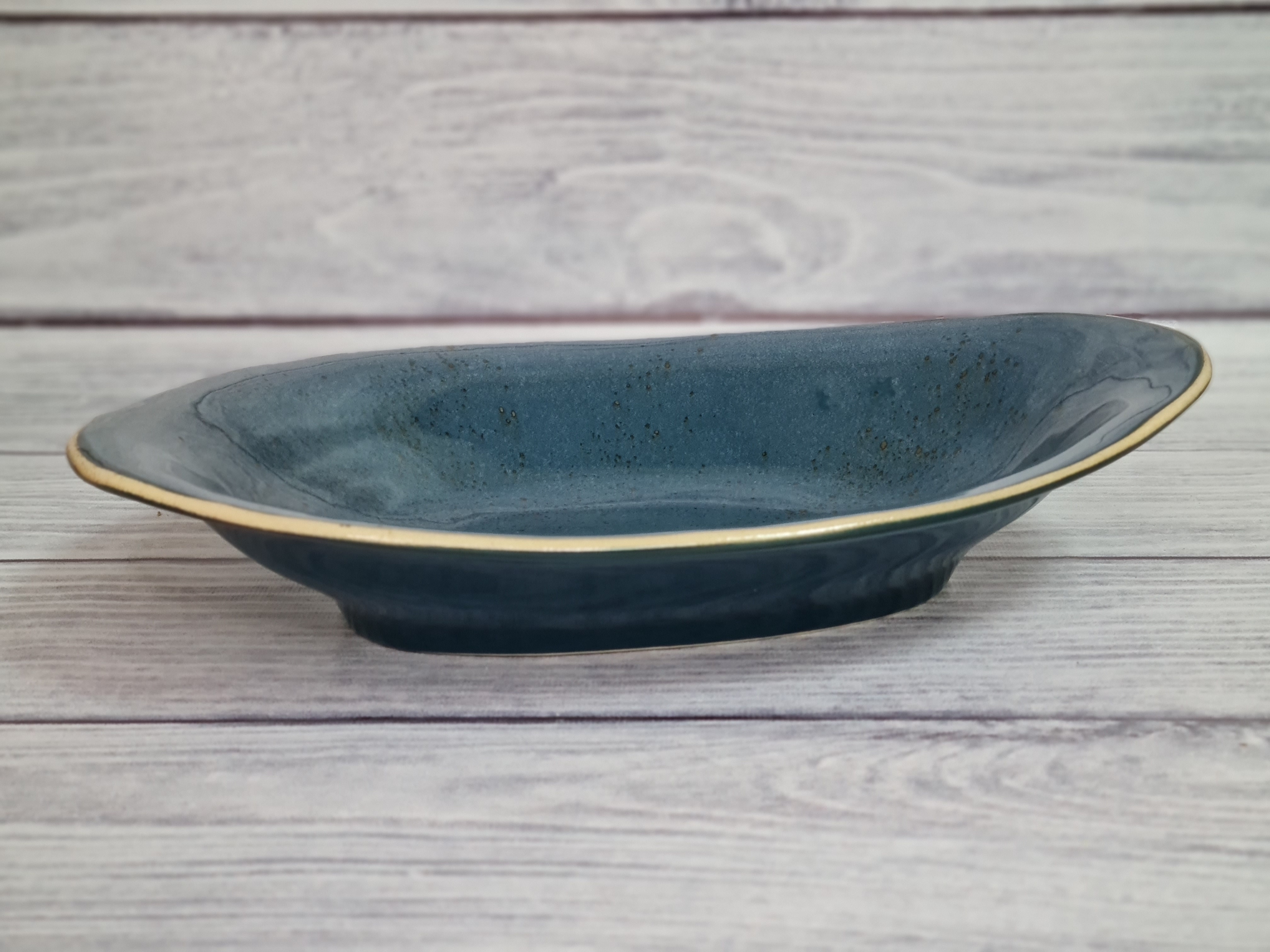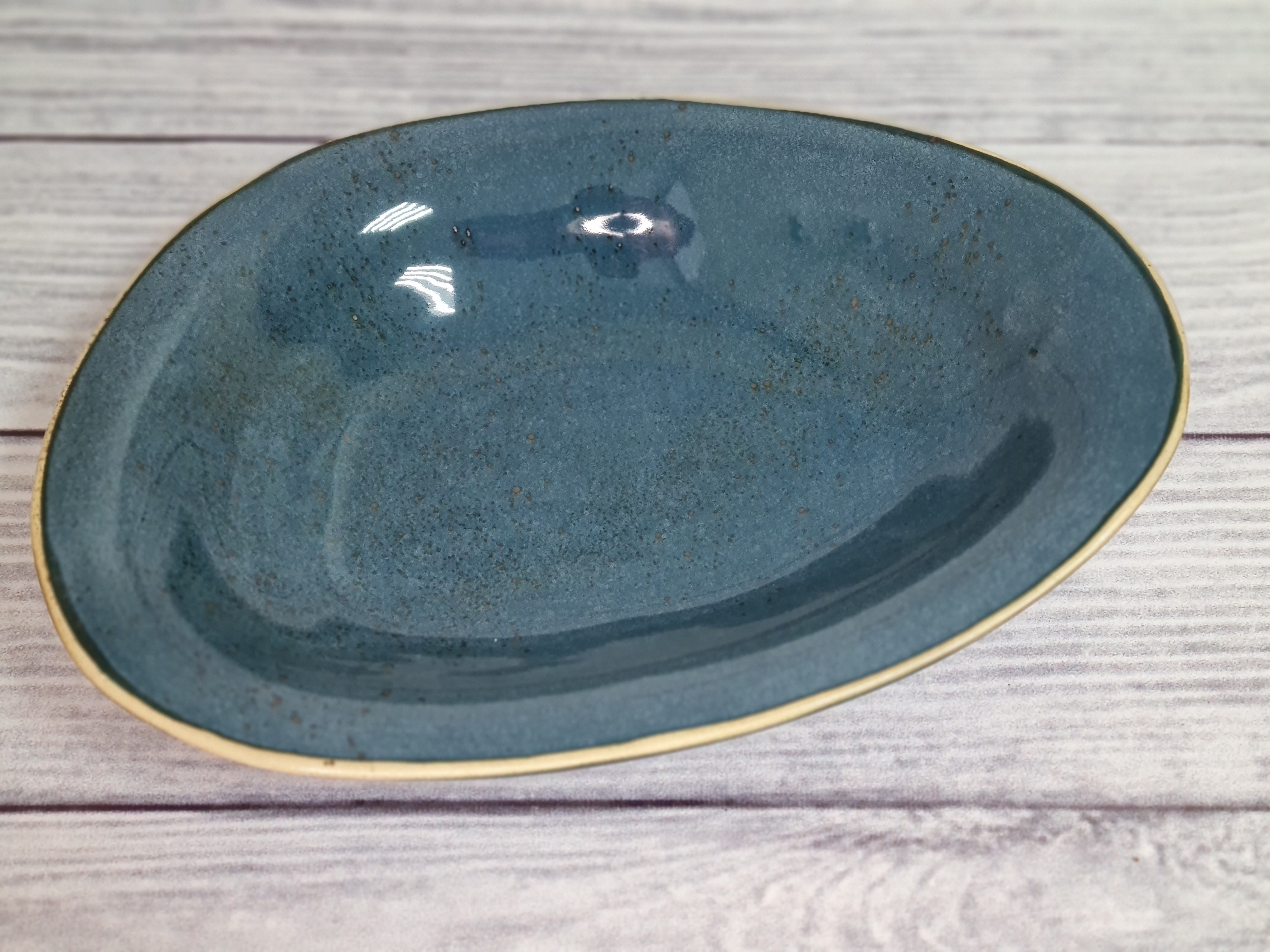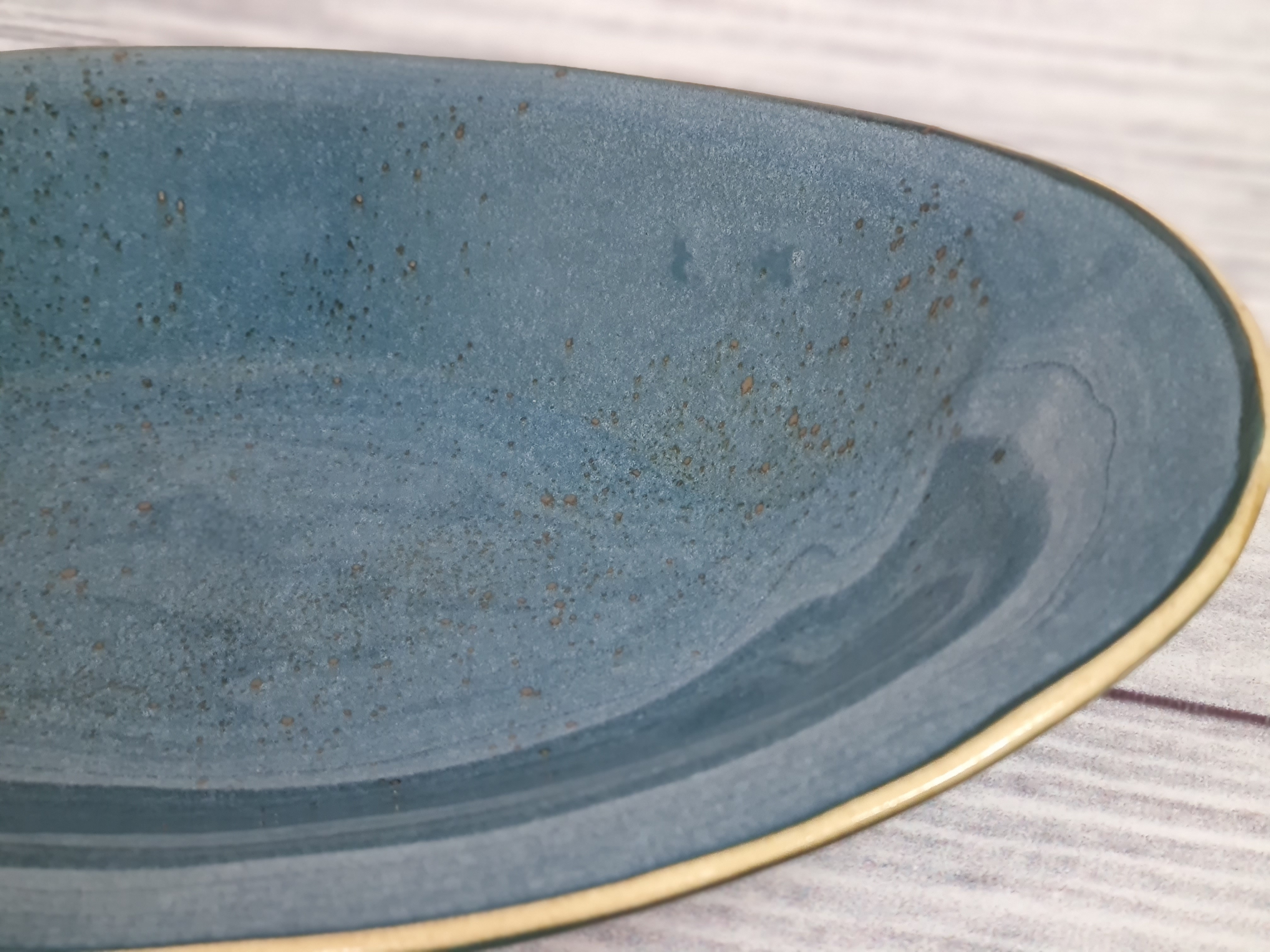 Тарелка неправильной формы. Грациозное и вместительное изделие будет настоящим украшением стола. Отличная идея для необычной подачи салатов или первых блюд. Является дополнением к тарелке barchetta. Тарелка пригодна для использования в микроволновой печи и посудомоечной машине. Зеркальная глянцевая поверхность с сине-голубыми с загадочными разводами, бликами и черными крапинами.