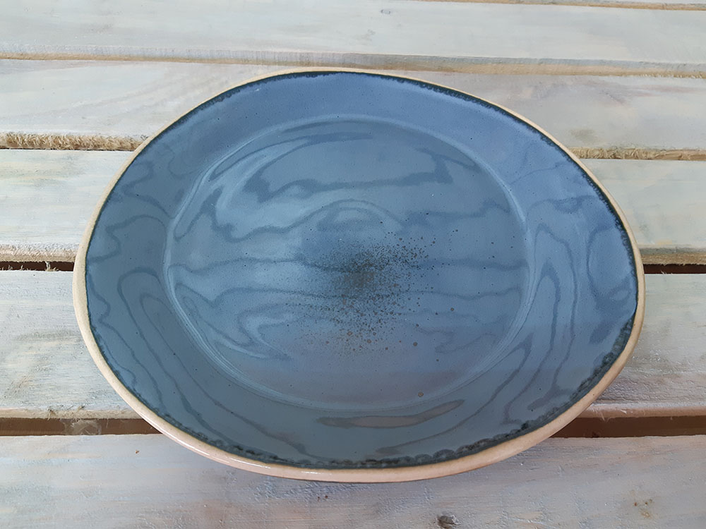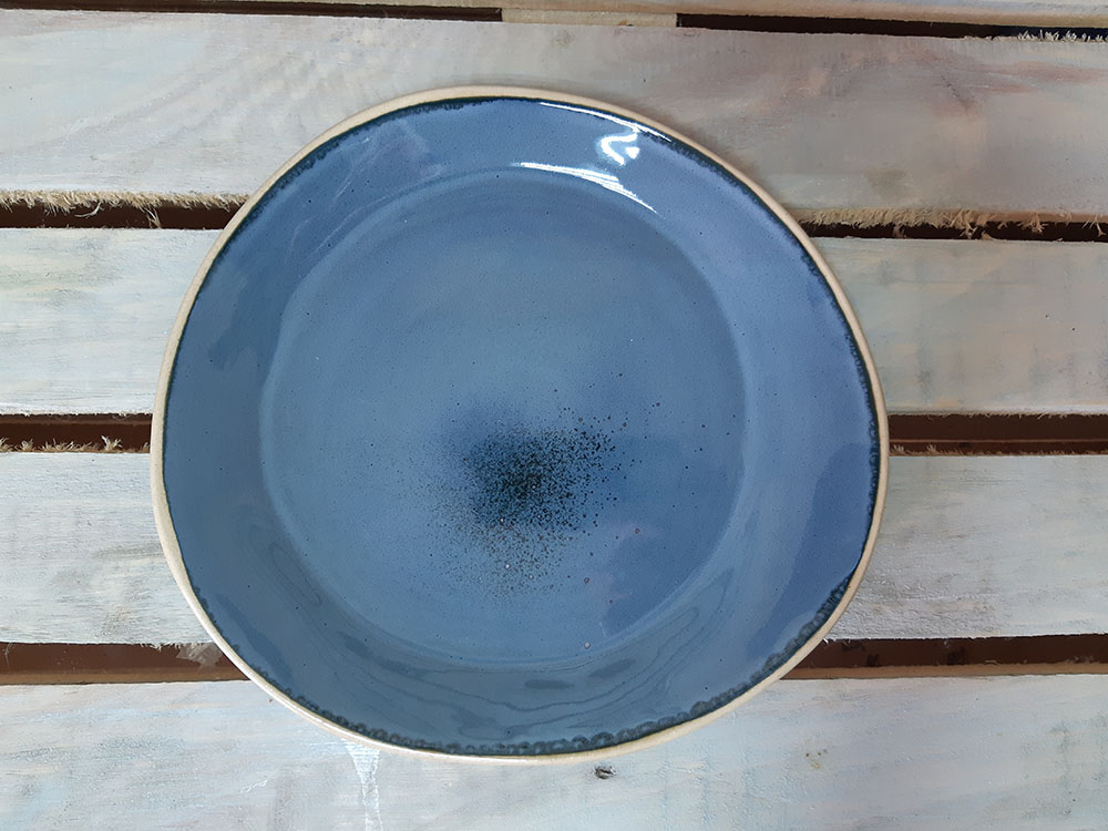 Тарелка неправильной формы. Оригинальный дизайн позволяет сделать красивую выкладку блюда в соответствии с замыслом шеф-повара. Как говорится – ничего лишнего – поданное на такой тарелке блюдо будет выглядеть необычно и вкусно. Зеркальная глянцевая поверхность с сине - голубыми загадочными разводами, бликами и чёрными крапинами.