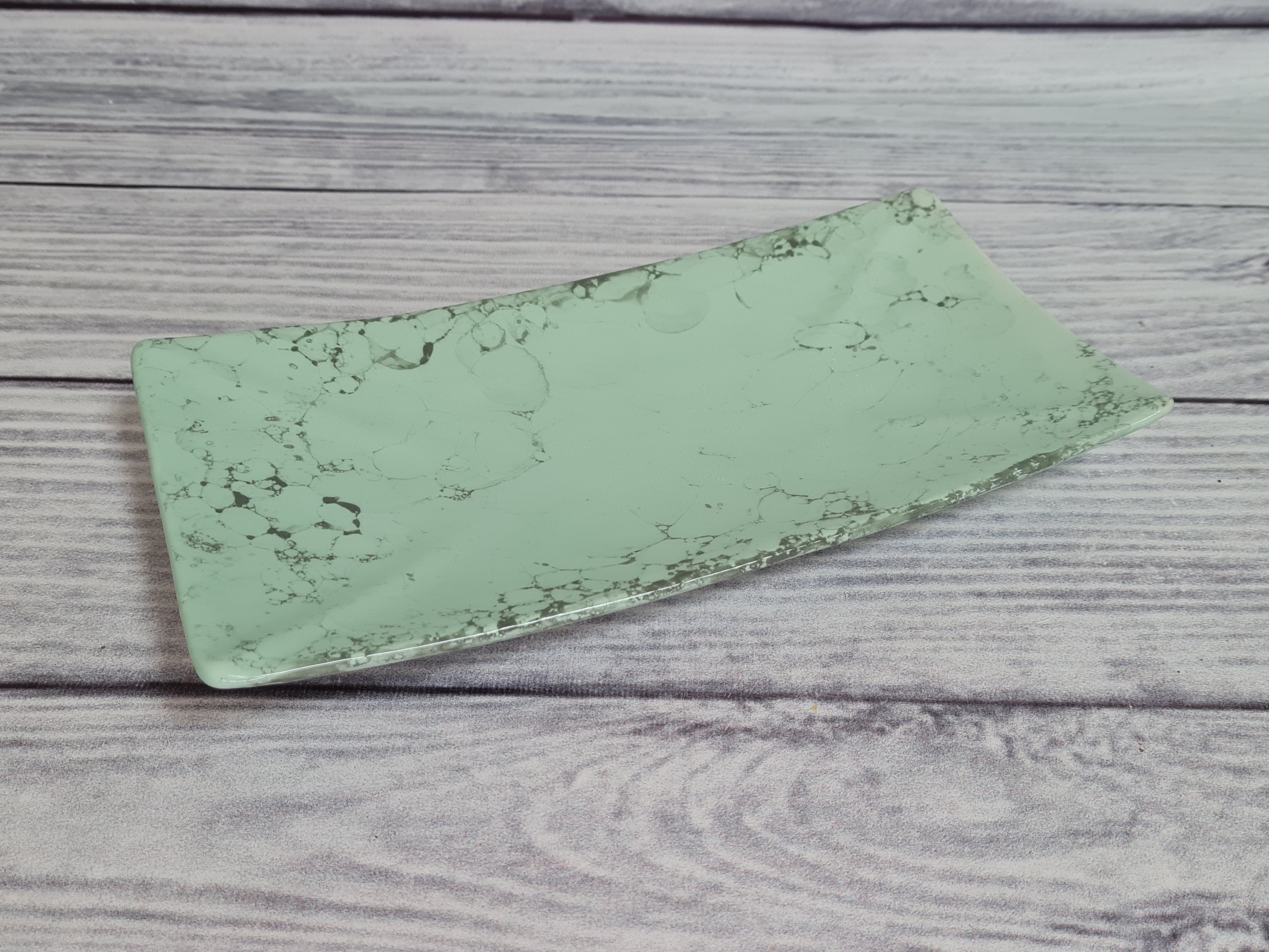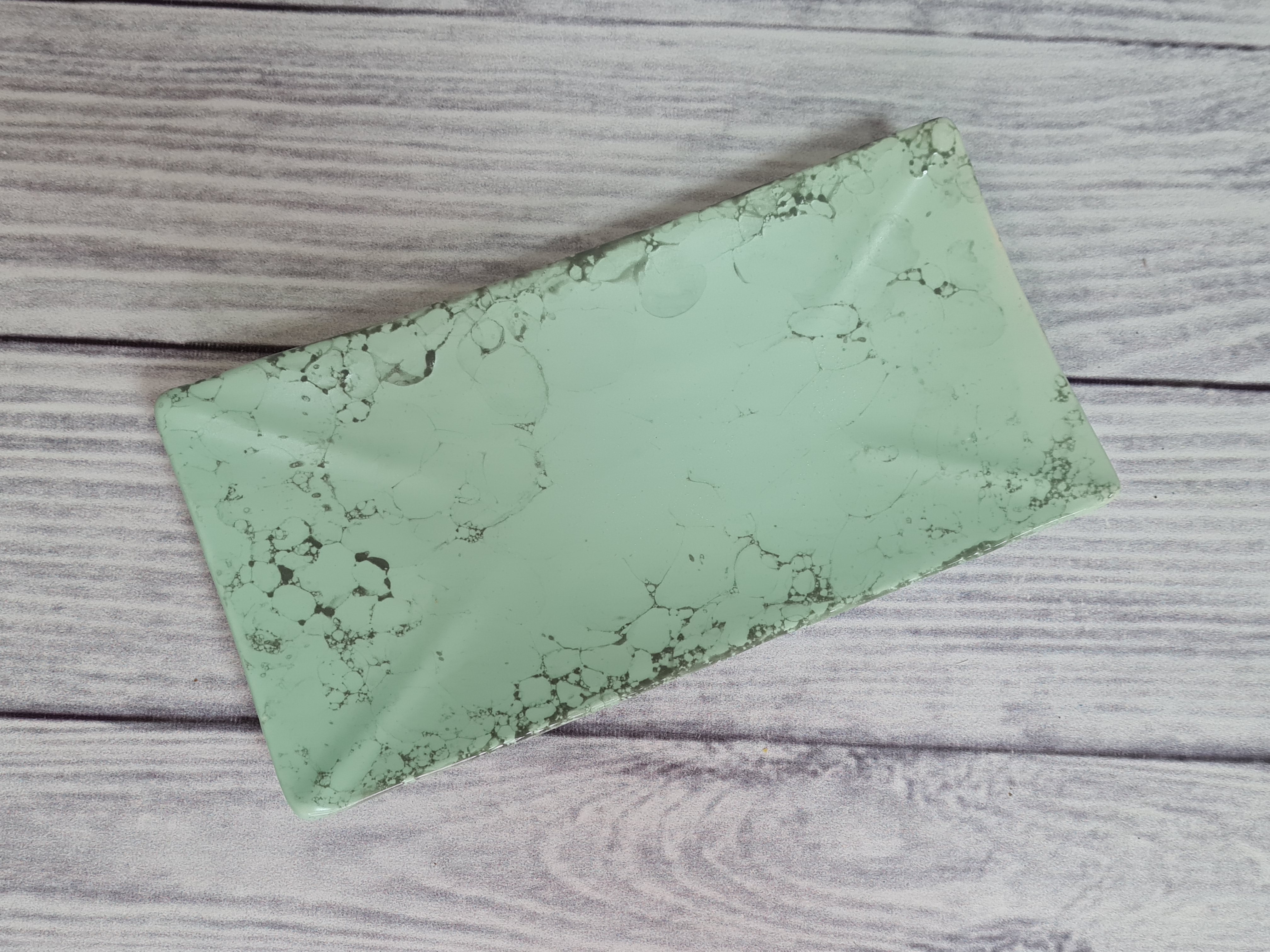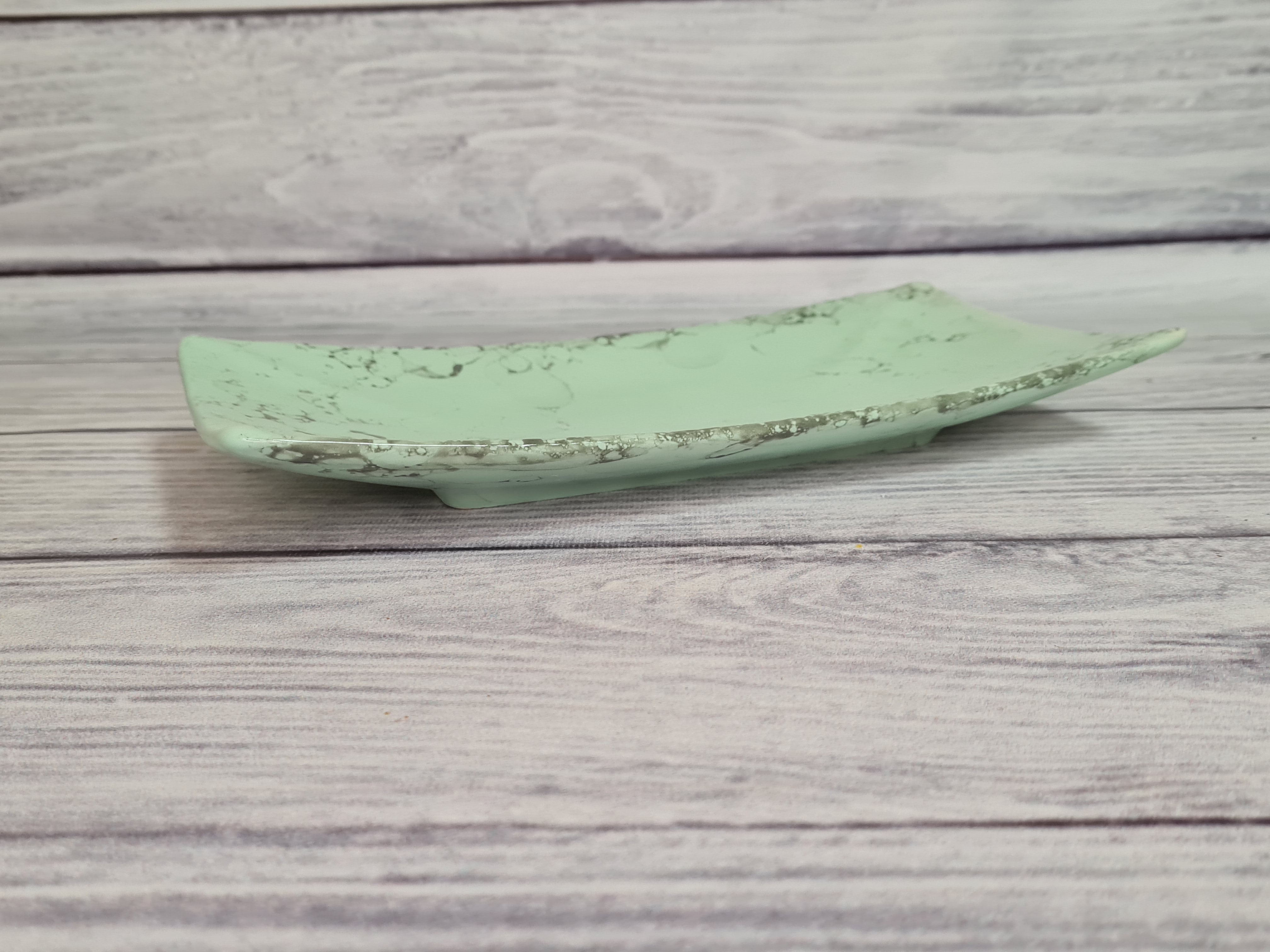 Фарфоровое блюдо для суши прямоугольной формы с приподнятыми краями. Очень практично в использовании и хранении, занимает мало места. Элегантный дизайн придает блюду утонченность и изысканность. Отличная идея для красивой подачи суши и роллов. Матовая поверхность мятного цвета с серыми разводами.