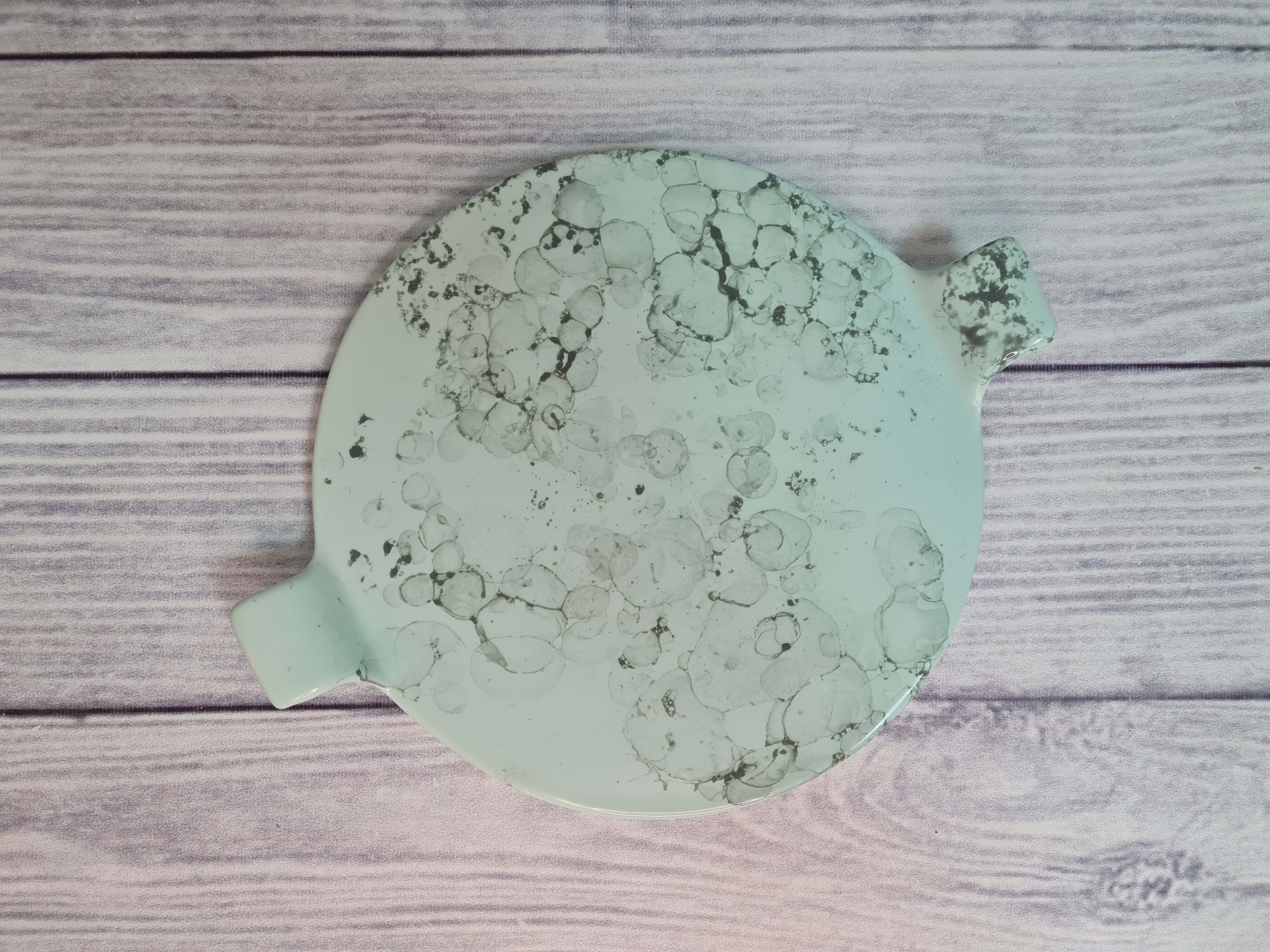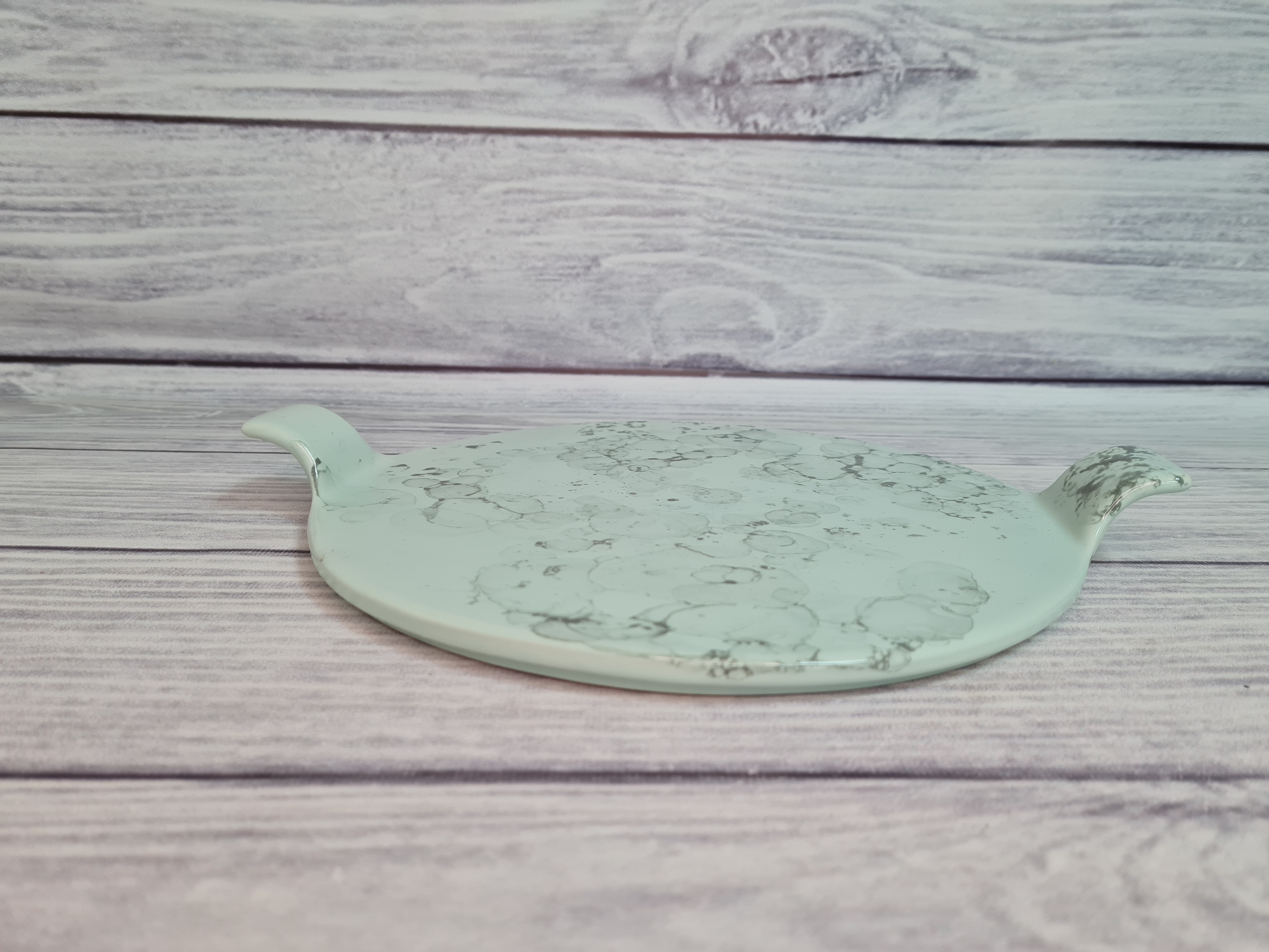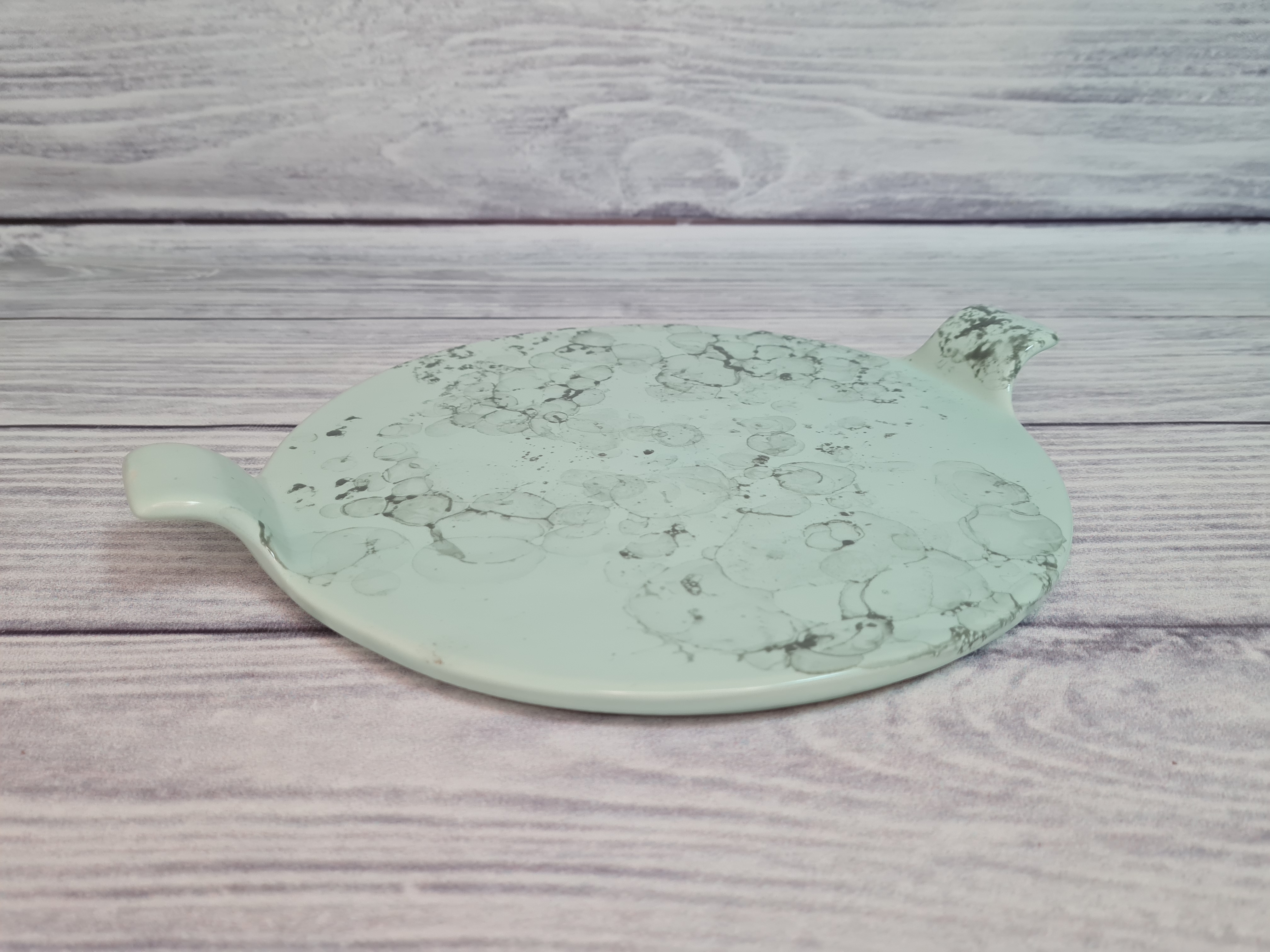 Фарфоровое блюдо для подачи сыра или другой нарезки. Стильное, удобное. Диаметр блюда без ручек - 25 см. Это довольно большая поверхность, на которой можно красиво разместить продукты. Пригодна для использования в посудомоечной машине и микроволновой печи. Матовая поверхность мятного цвета с серыми разводами.
