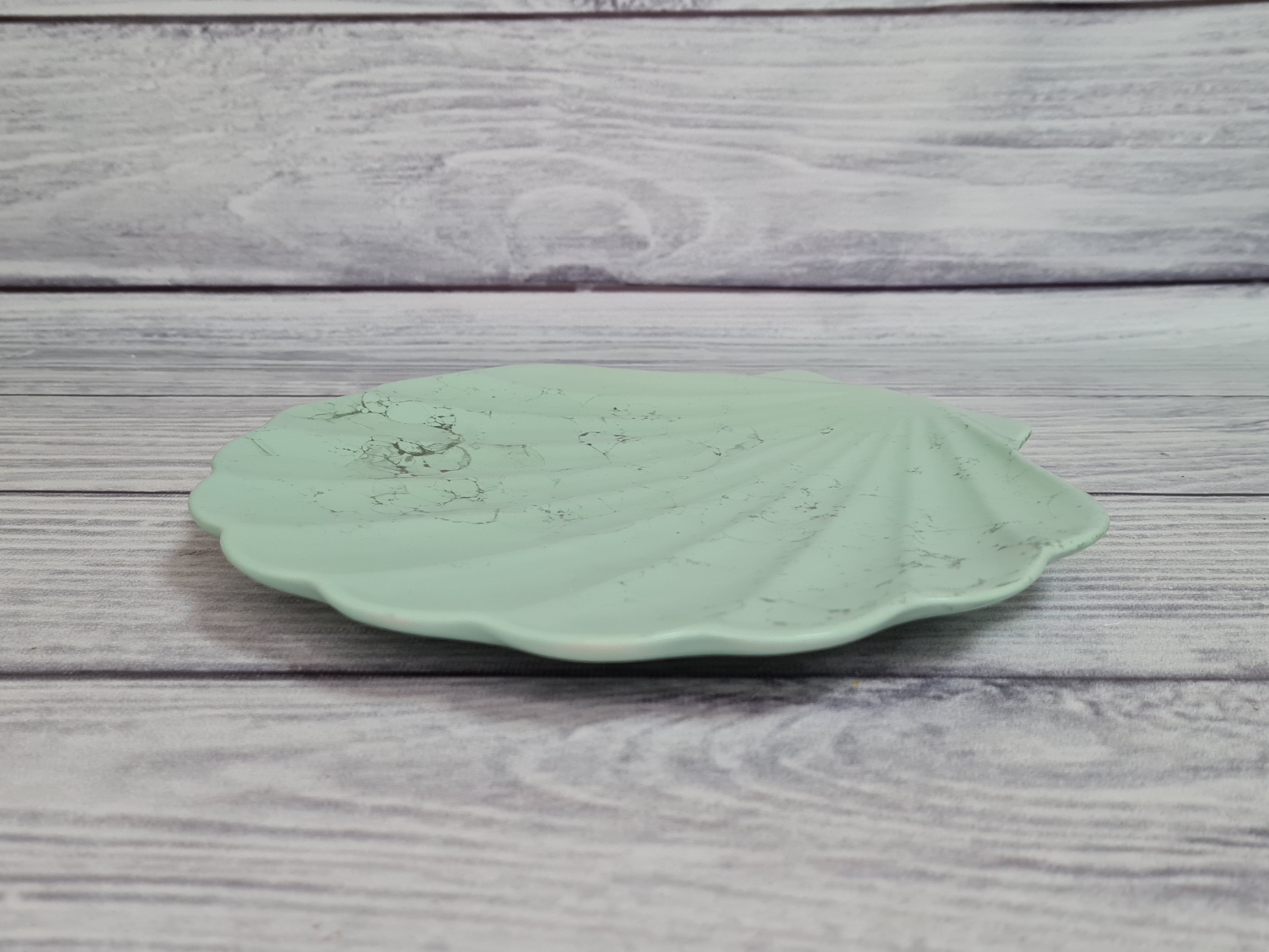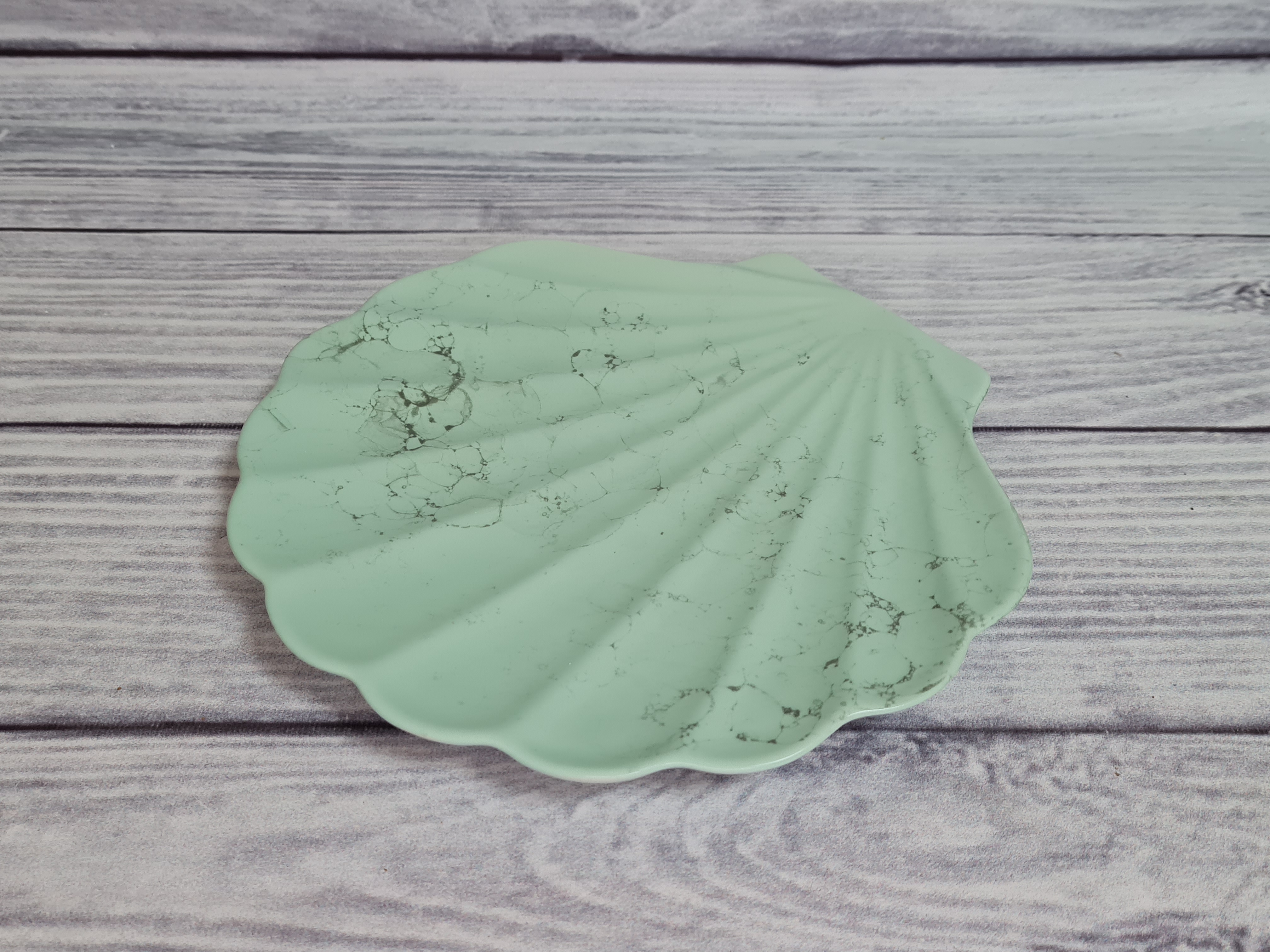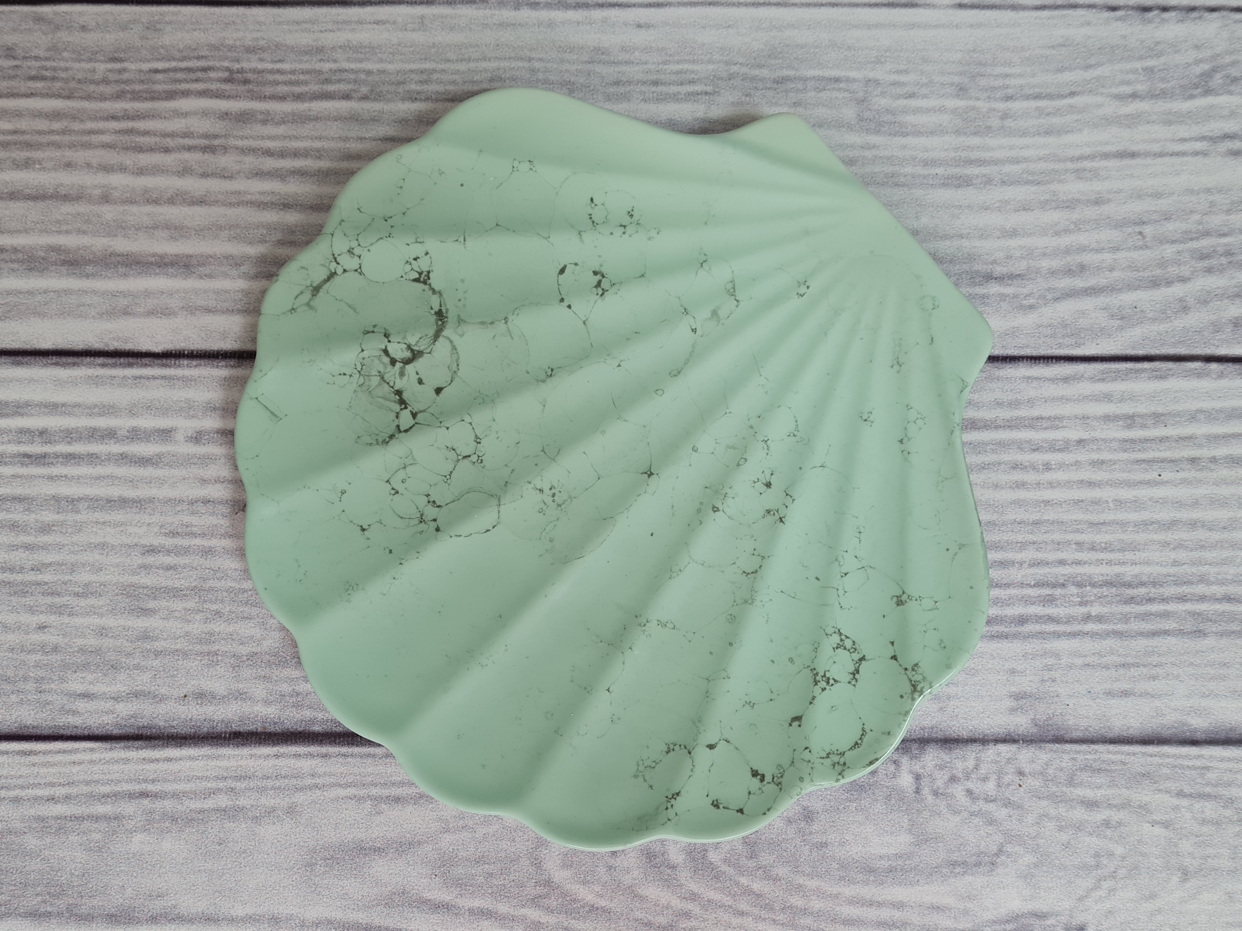 Блюдо marittimo grande - станет отличным решением для сервировки стола в морском стиле, для подачи рыбной нарезки и морских деликатесов. В наши дни морская тематика в сервировке стола становится всё популярней. Особенно актуальна морская сервировка для летнего интерьера. Украсить же стол, придав сервировке морского настроения, совсем не сложно. Сначала нужно подобрать скатерть голубого или белого цвета. Добавьте на стол свечи и цветы. И, конечно, при создании композиции в морском стиле не обойтись без морских раковин, звезд и кораллов. А главной изюминкой бесспорно станет наше блюдо marittimo grande. Блюдо – ракушка напоминает половинку морской раковины. Матовая поверхность мятного цвета с серыми разводами.