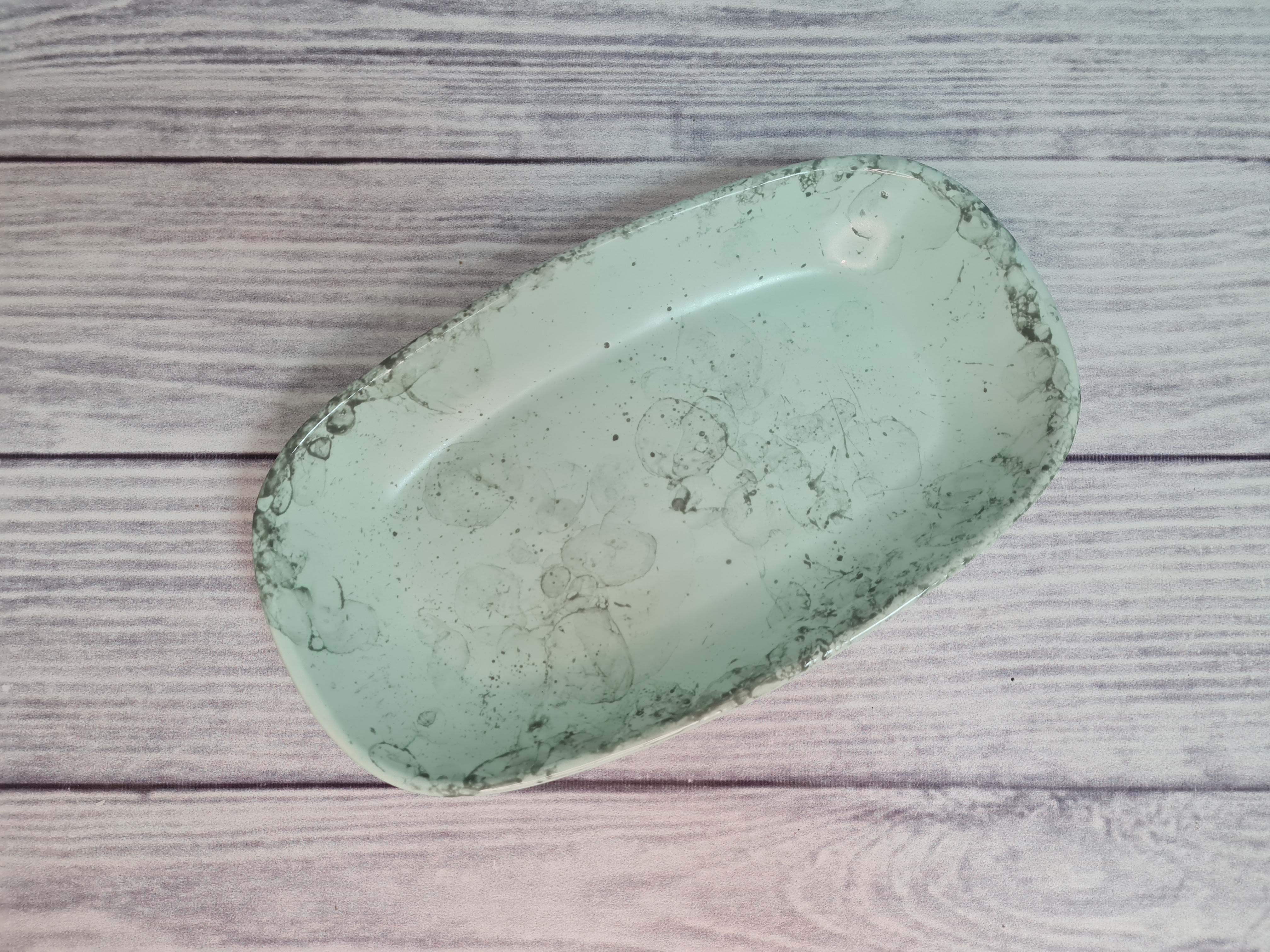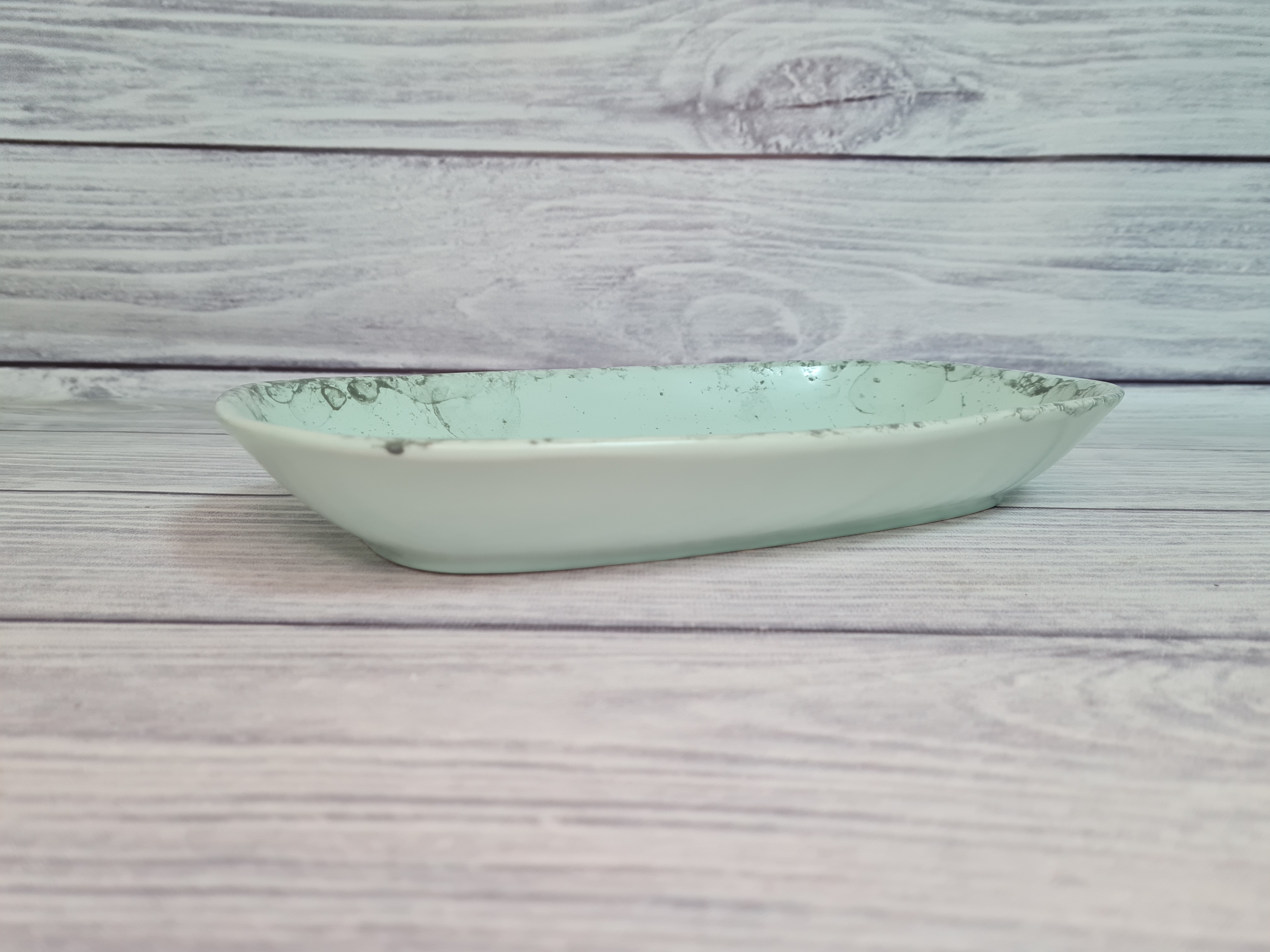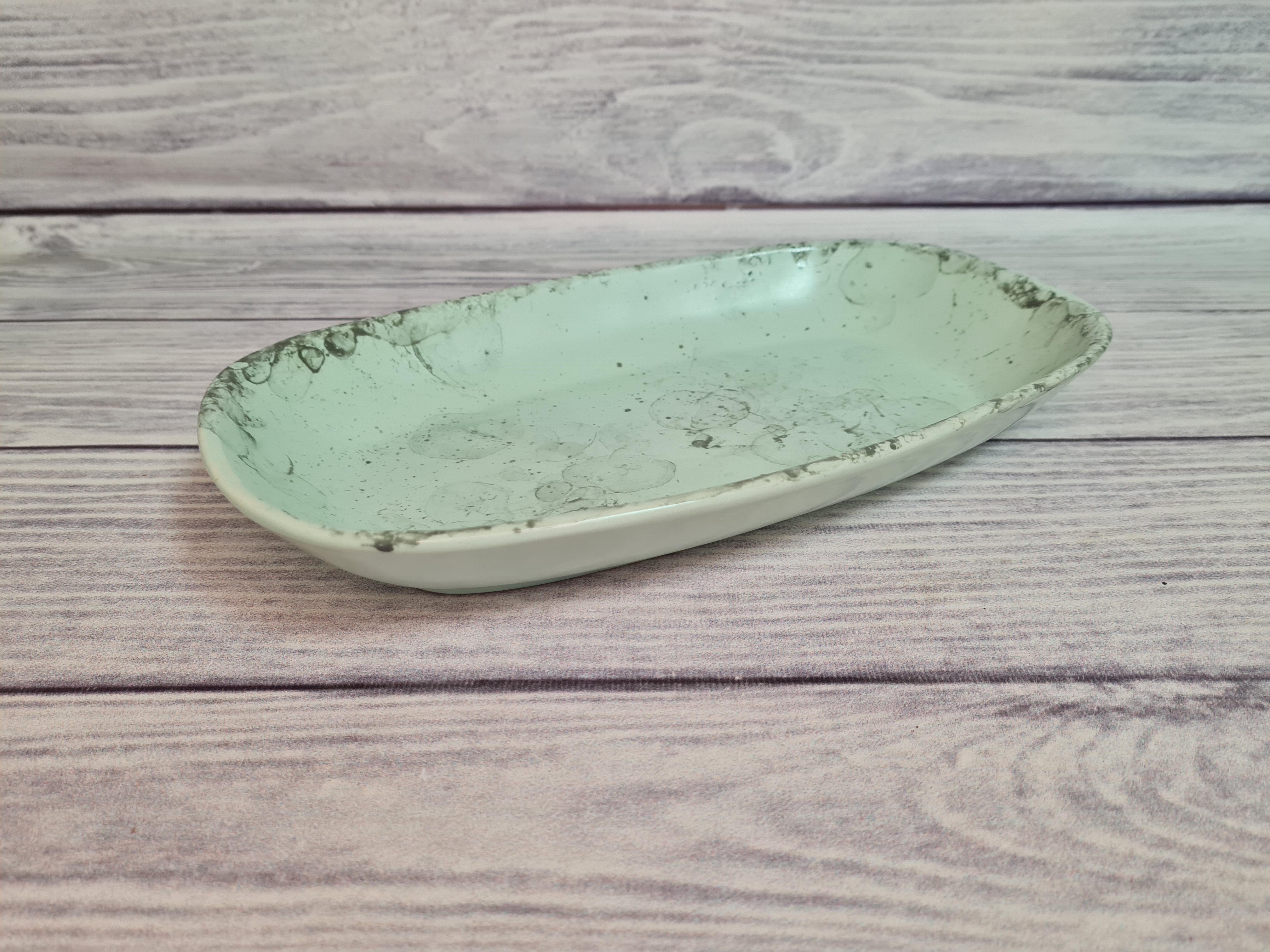 Большое блюдо moderno ovale имеет овально-прямоугольную форму с высокими бортиками. На таком блюде удобно подавать как холодные закуски, так и горячие угощения, накладывать салат, фрукты и даже сладости. Оригинальная подача в таком блюде гарантирована. Матовая поверхность мятного цвета с серыми разводами.