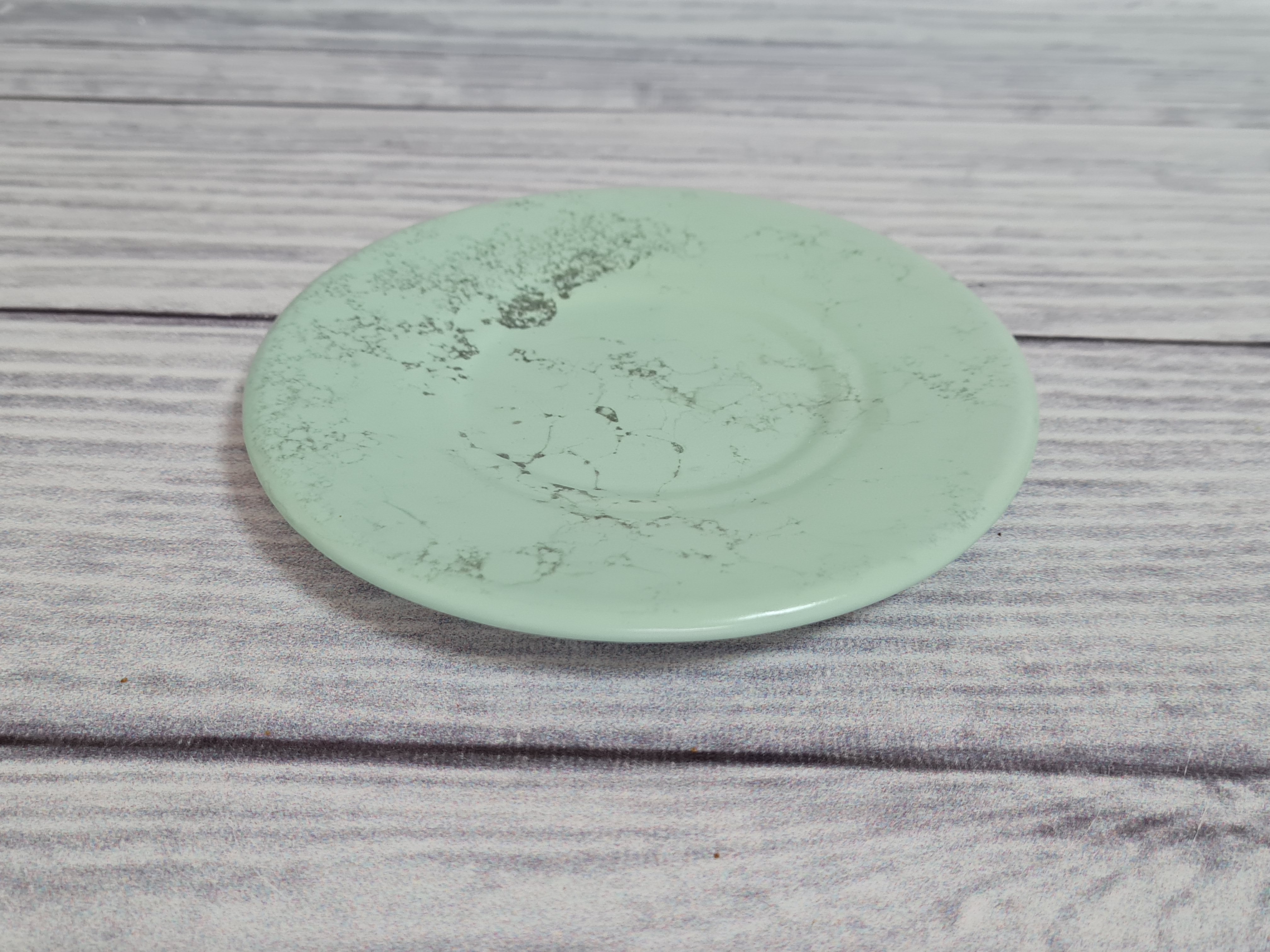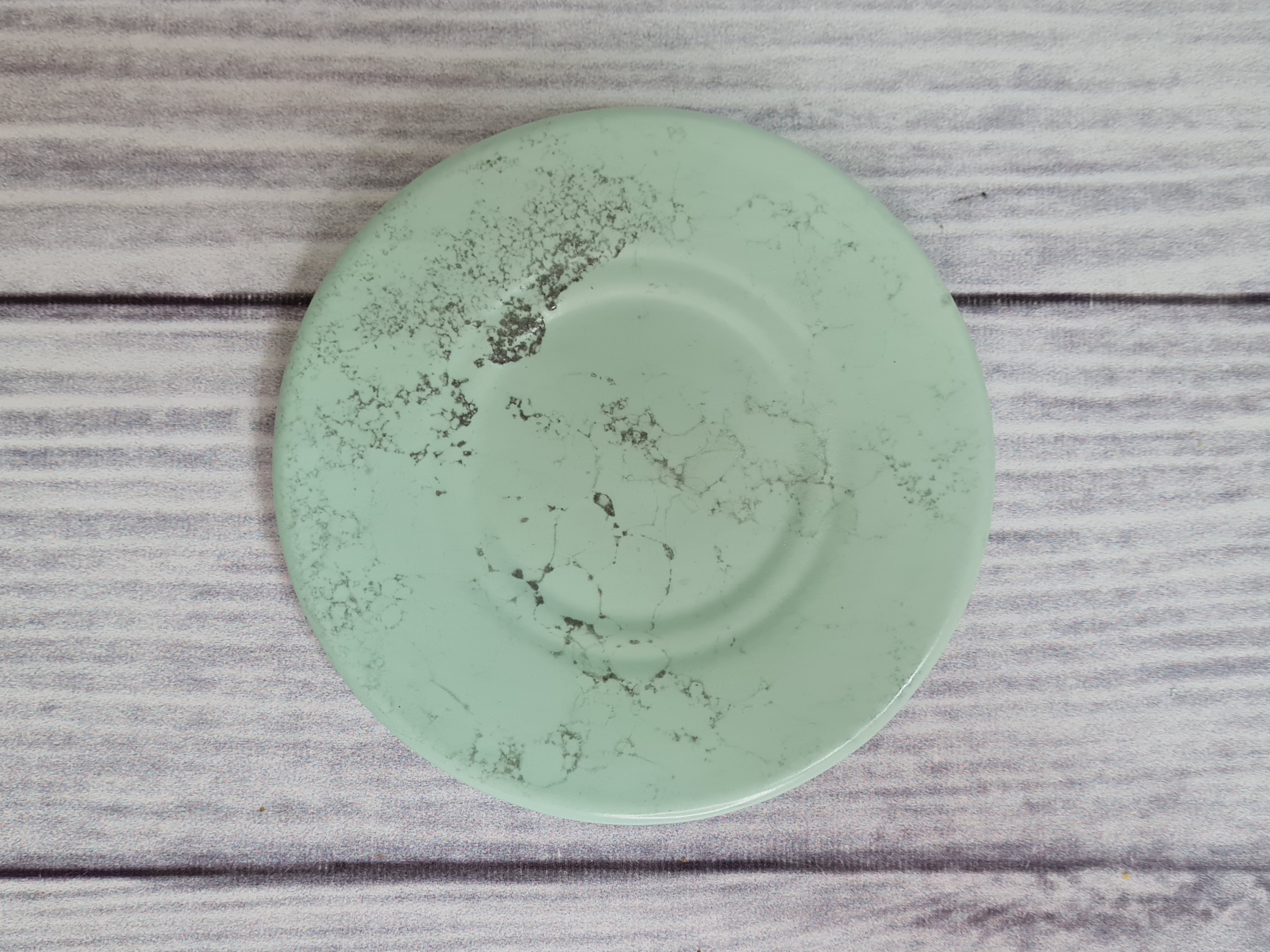 Универсальное малое блюдце для сервировки, может использоваться как подставка под чашку. Специальные бортики предотвращают соскальзывание чашки. Кроме того, эти маленькие тарелочки прекрасно украсят ваш стол. Матовая поверхность мятного цвета с серыми разводами.