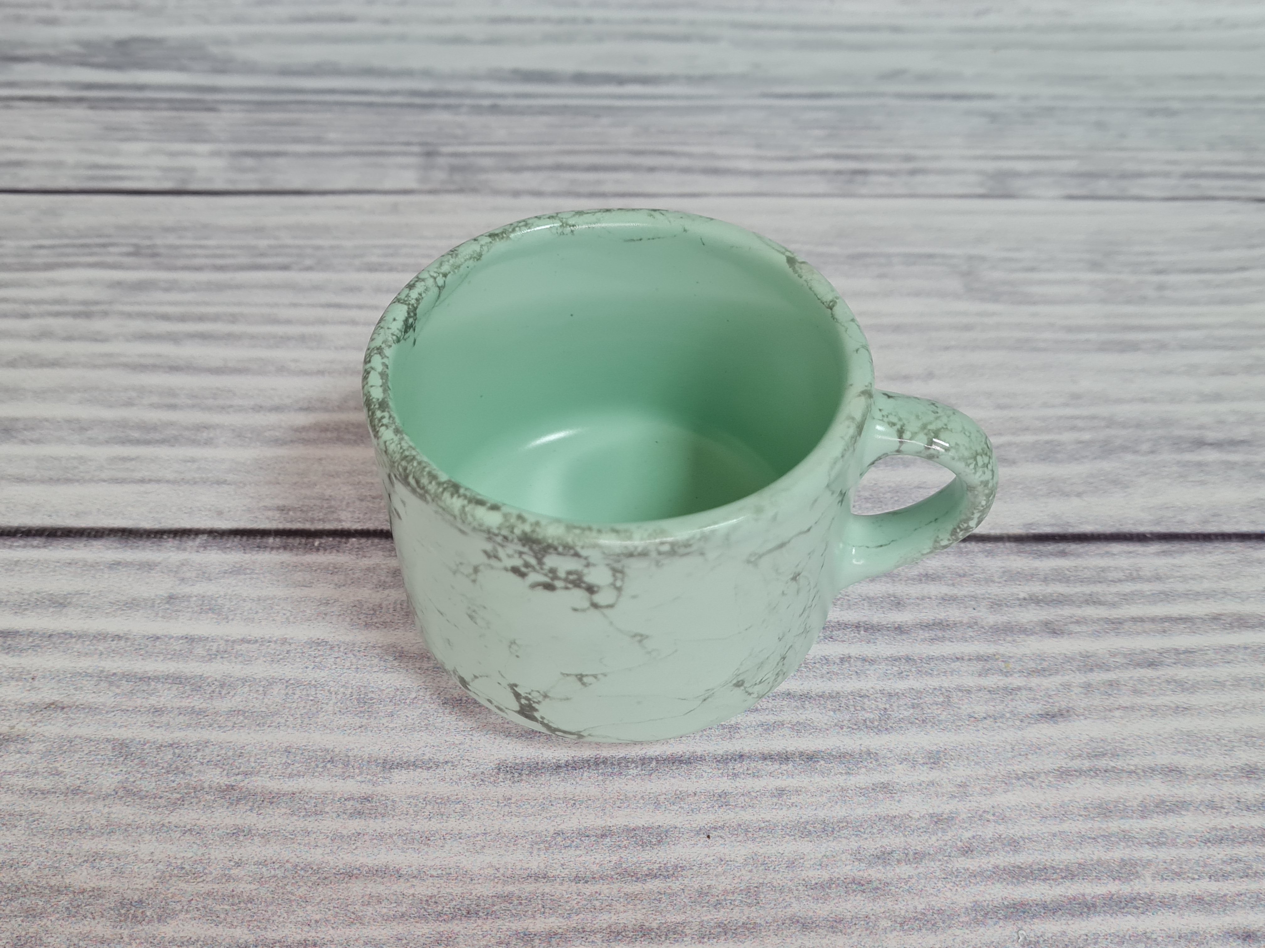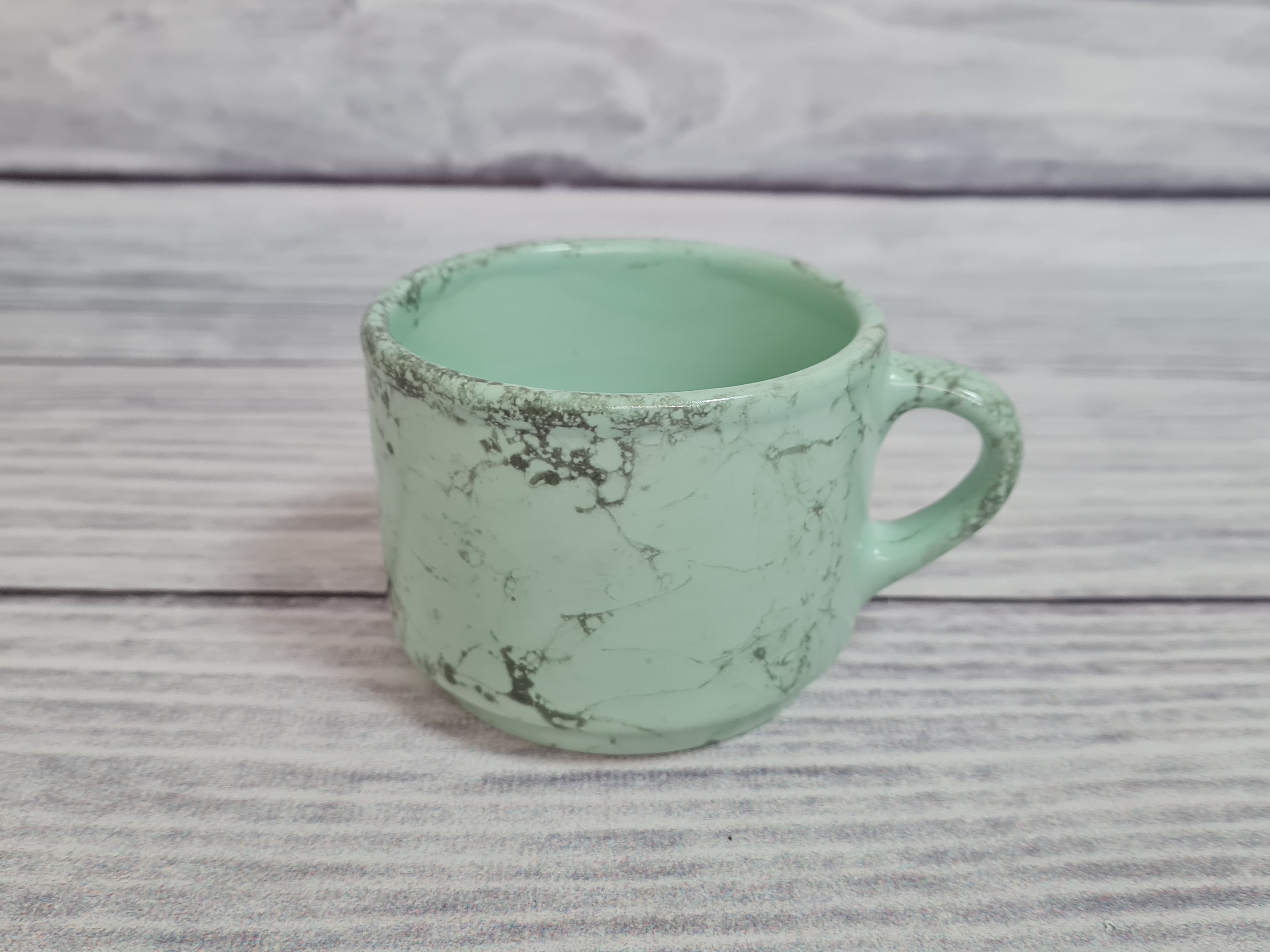 Оригинальная штабелируемая чашка. Идеально подойдет для подачи как эспрессо, так и чая. Штабелируется и экономит место. Пригодна для использования в посудомоечной машине и микроволновой печи. Матовая поверхность мятного цвета с серыми разводами.
