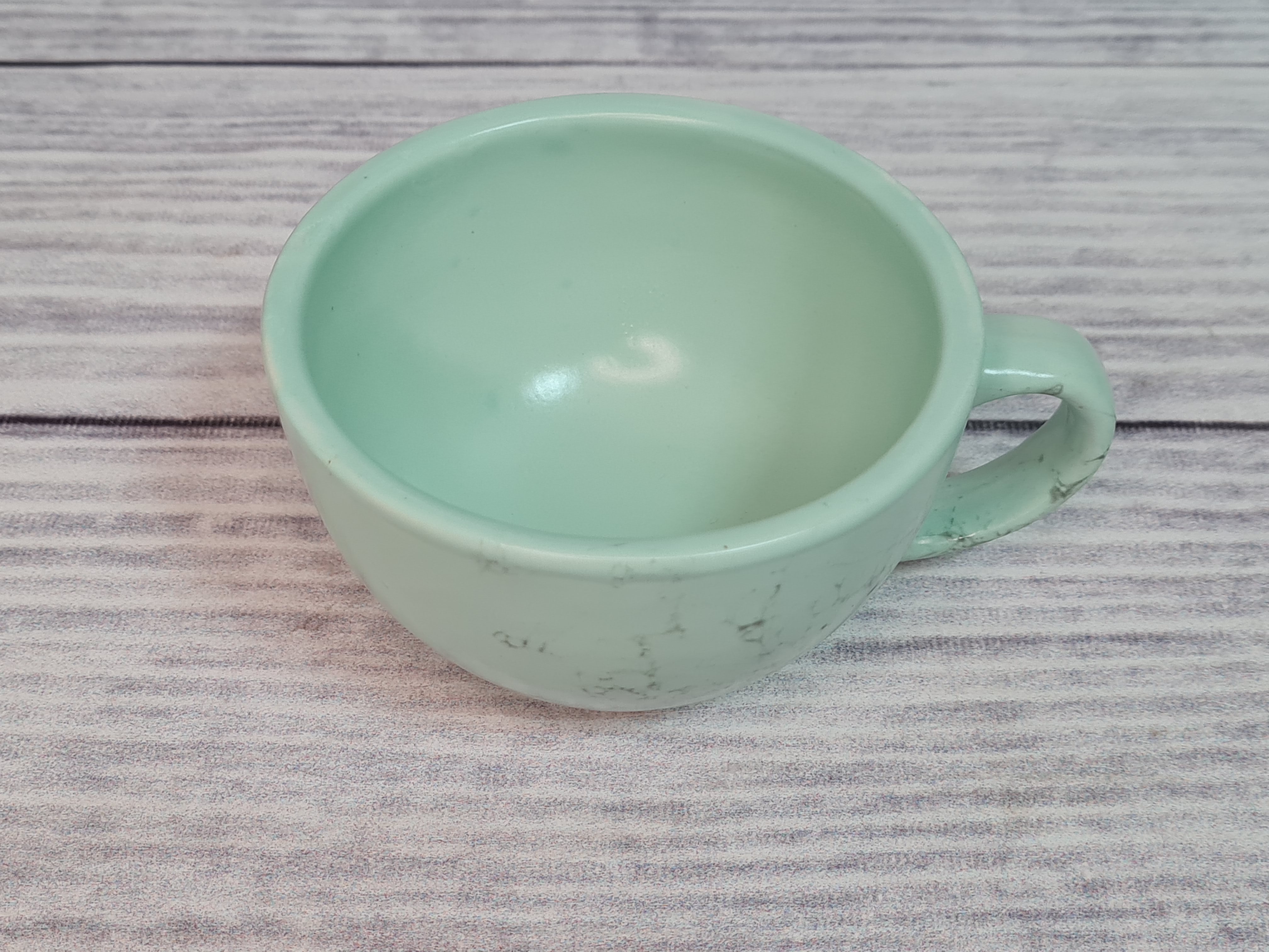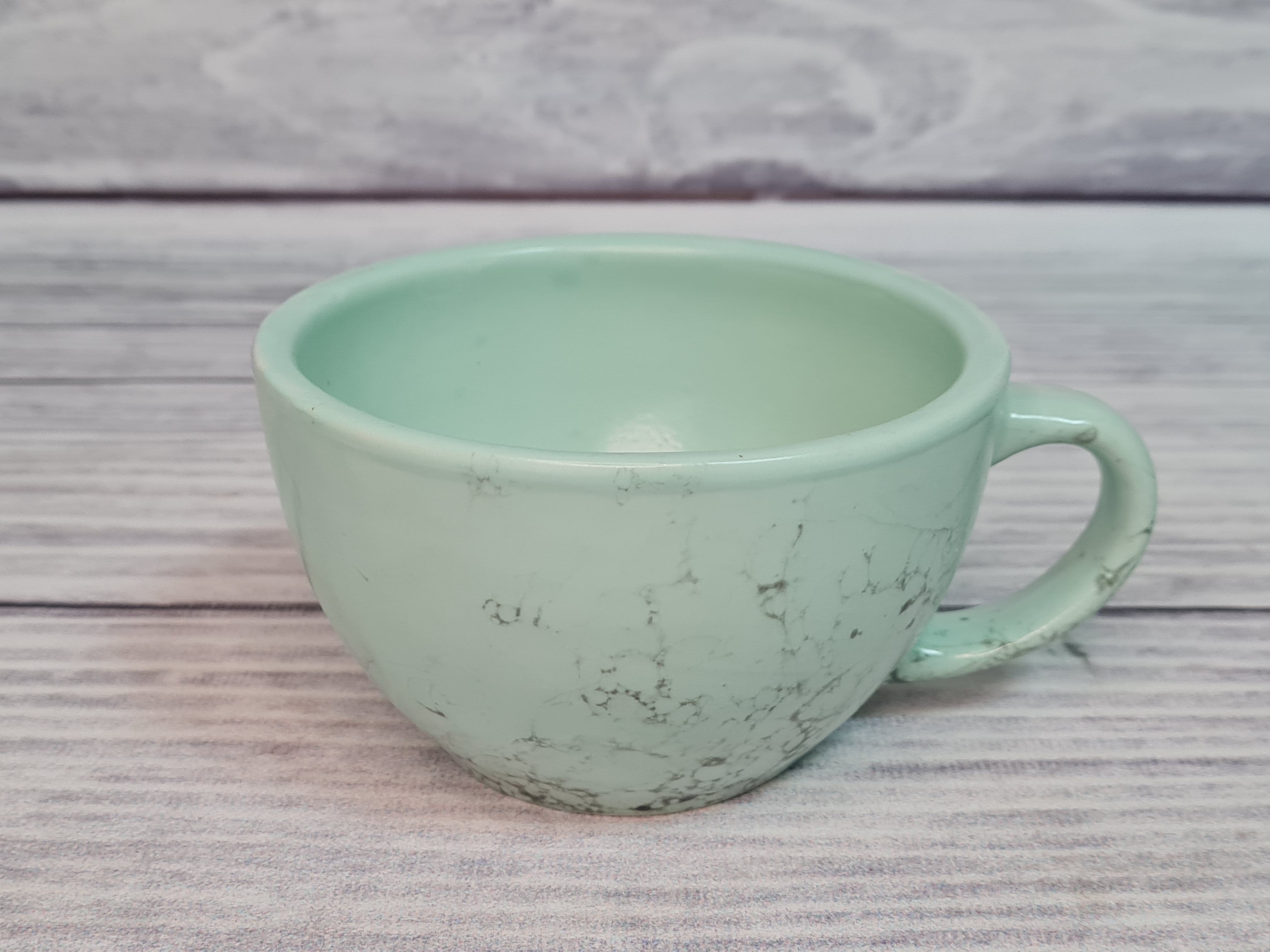 Чашка имеет округлую форму, она очень удобна в использовании. Чашка выполнена из фарфора и обладает отличным качеством, хорошо сохраняет тепло и смотрится очень элегантно и эстетично. Предназначена для подачи горячих и холодных напитков. Матовая поверхность мятного цвета с серыми разводами.