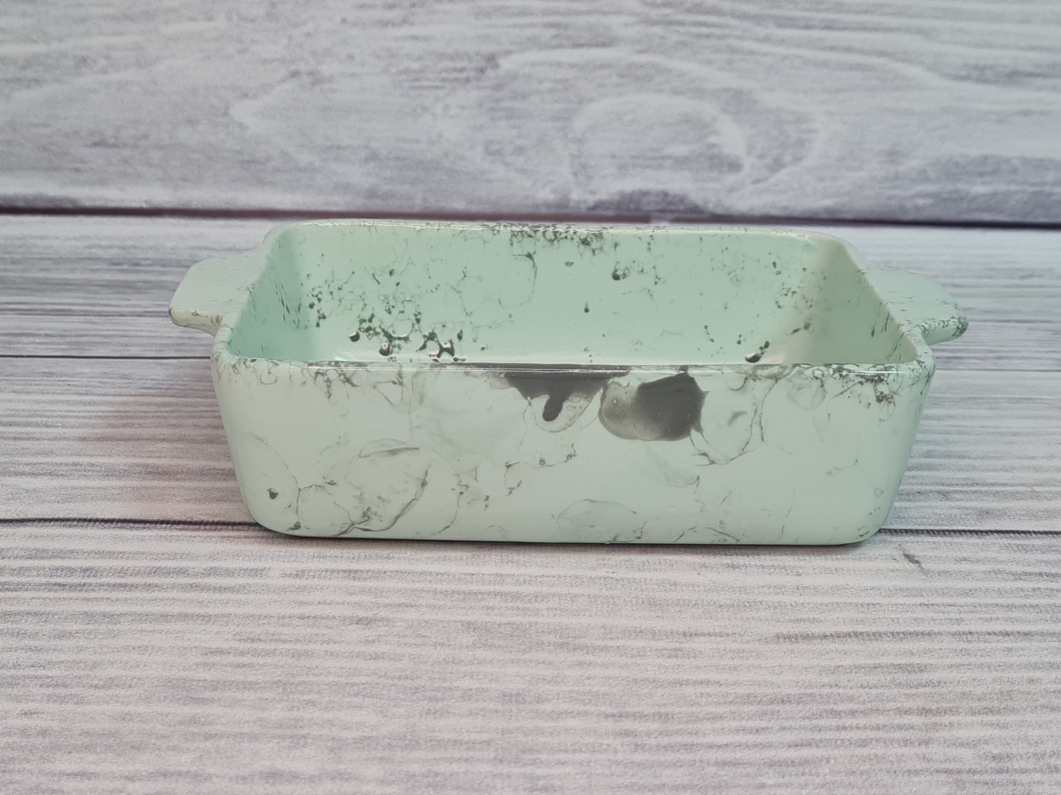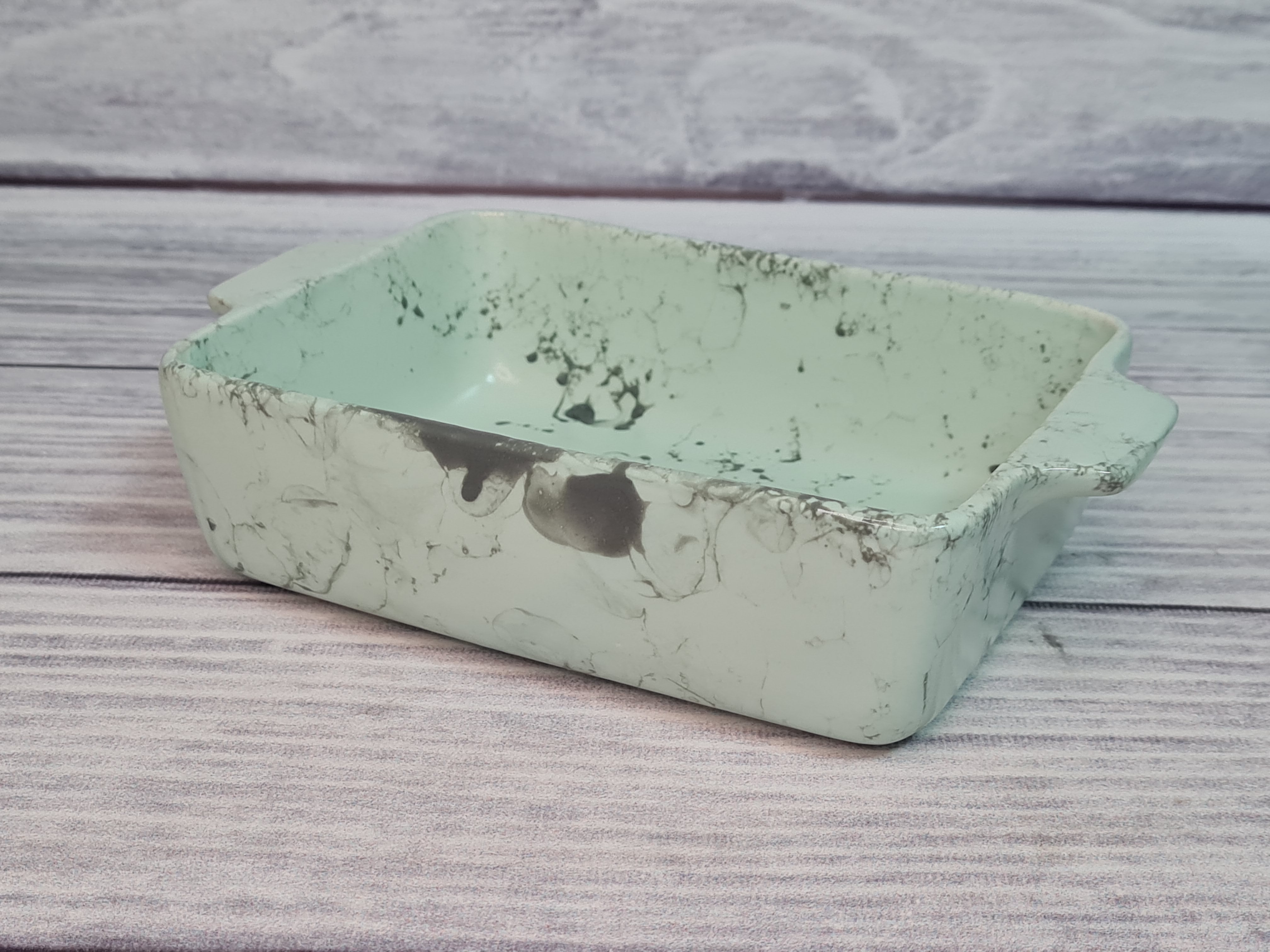 Форма для запекания Stampo смотрится очень стильно, и в ней действительно приятно готовить. Пища запекается быстро и не пригорает. Утолщённое дно и высокие бортики будут служить подспорьем в приготовлении кулинарных шедевров. В ней удобно готовить мясо, рыбу, овощи, в общем, всё, на что способно Ваше воображение и затем в ней же красиво подать на стол. Форма Stampo – изящное дополнение на кухне, которое может стать практичным помощником в приготовлении блюд и в сервировке как повседневного, так и праздничного стола. Матовая поверхность мятного цвета с серыми разводами.