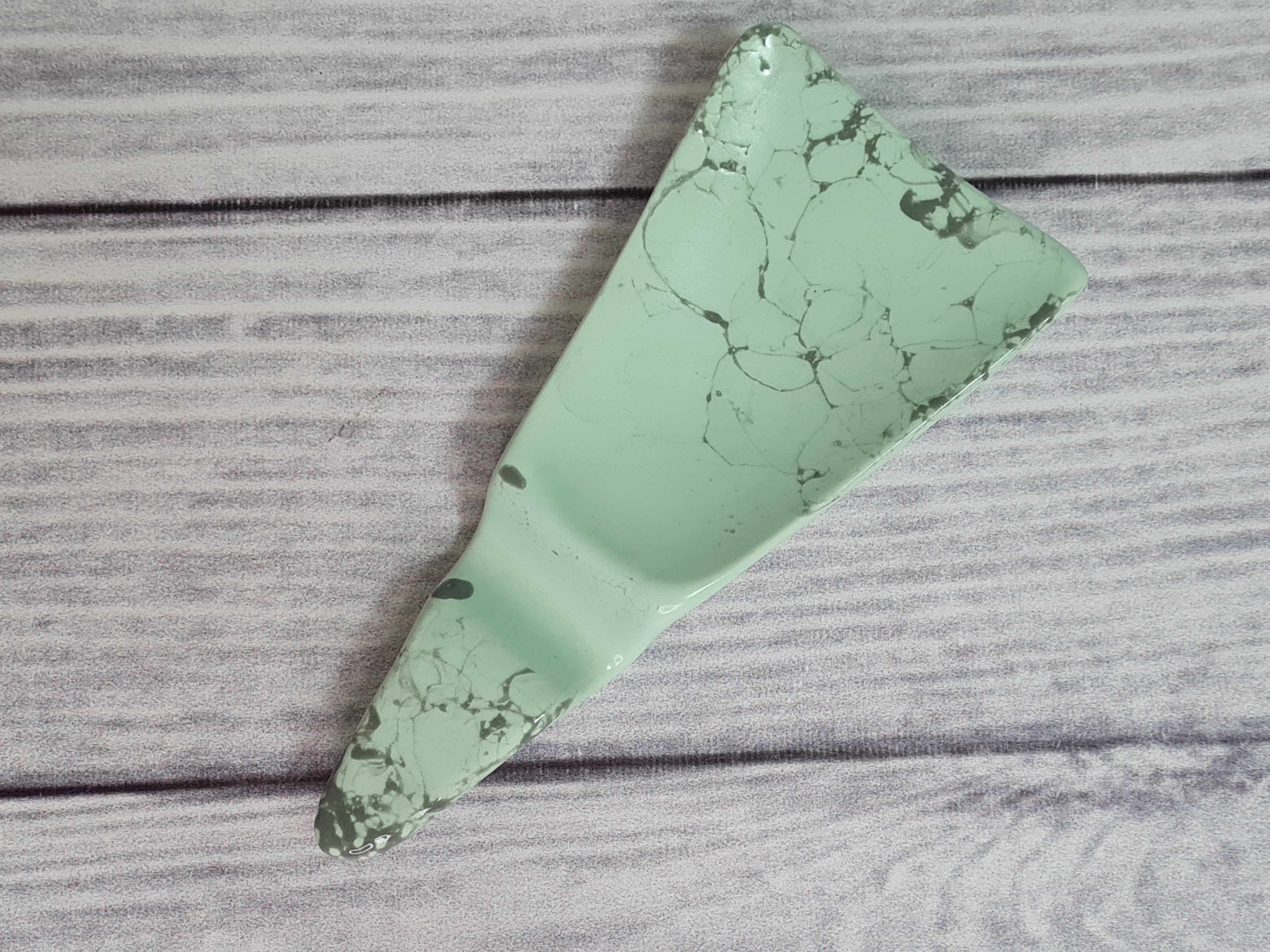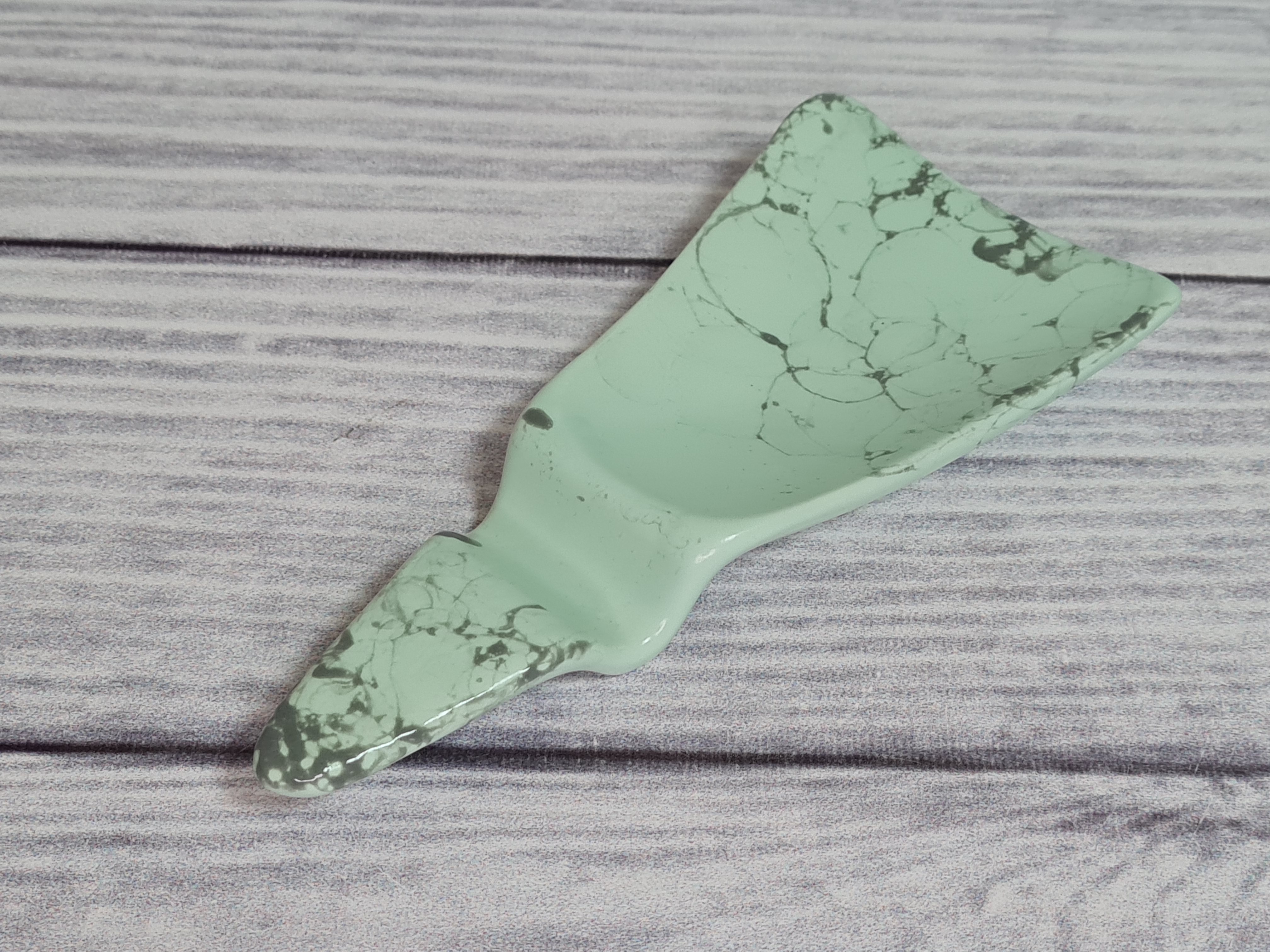 Такой аксессуар, как подставка под ложку, является настоящим спасением для каждой хозяйки - это весьма удобный и необходимый предмет для кухни. Кроме того, такой аксессуар, помимо своего прямого назначения, может служить весьма оригинальным и стильным предметом для украшения кухонного интерьера. Подставка под ложку выполнена из высококачественного фарфора. Матовая поверхность мятного цвета с серыми разводами.