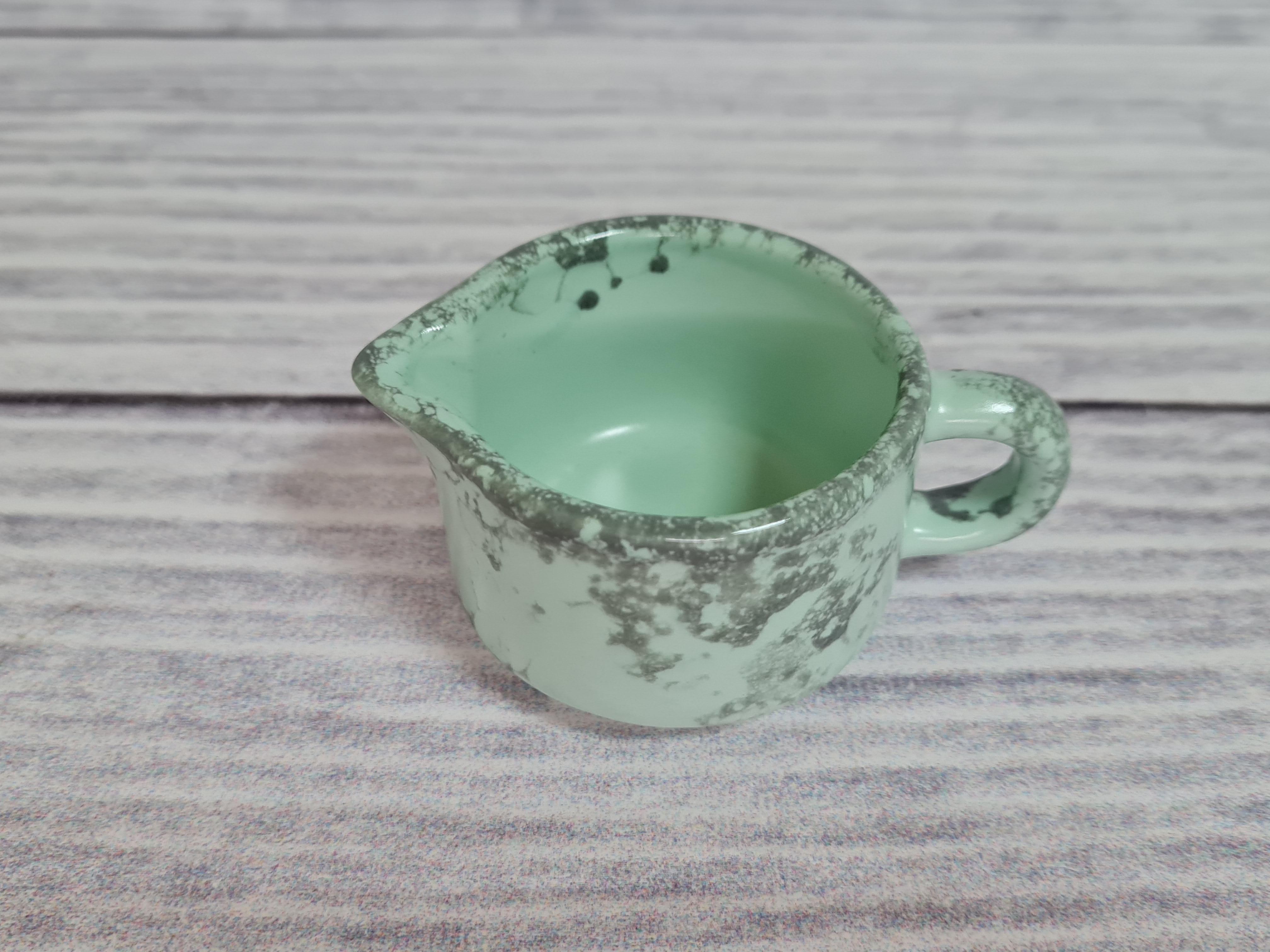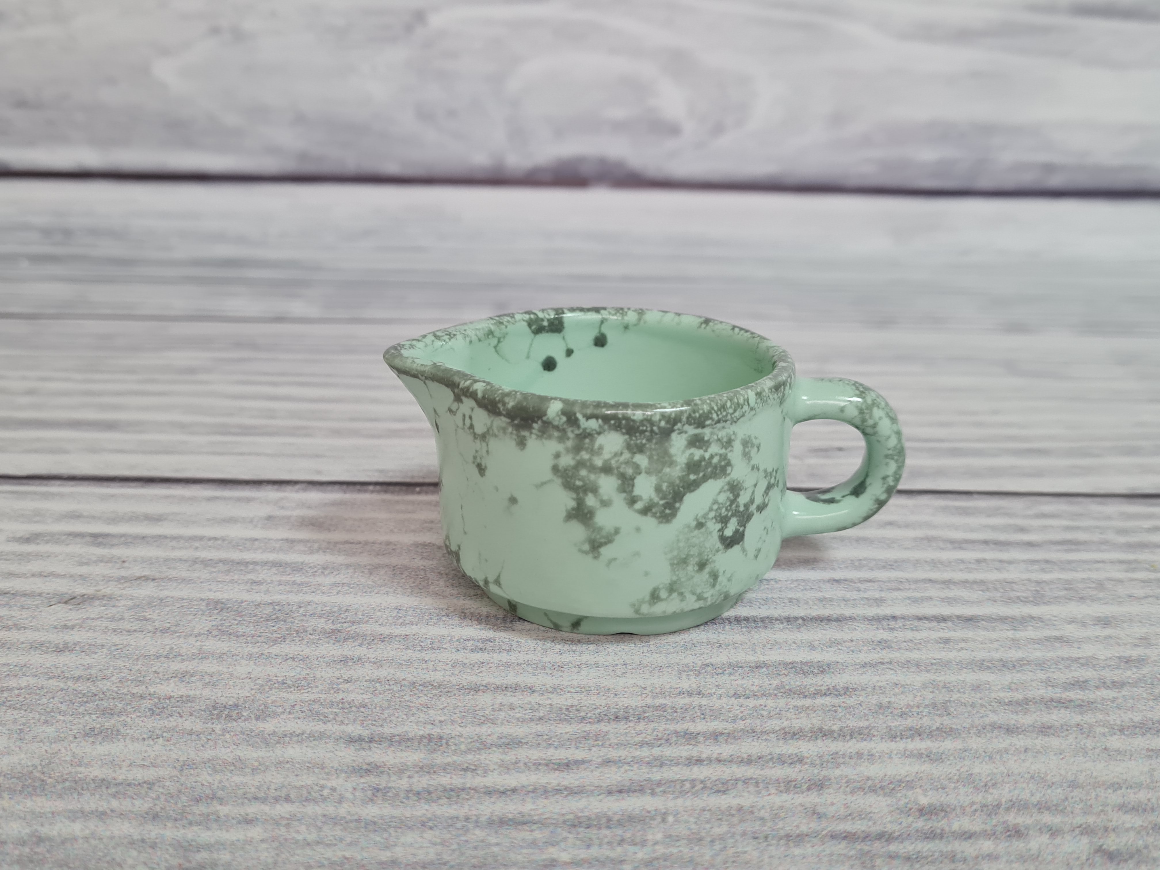 Элегантный маленький сливочник, который легко штабелируется и ставится один на один. Красивое миниатюрное изделие, которое будет приятным штрихом к полноценной сервировке. Матовая поверхность мятного цвета с серыми разводами.