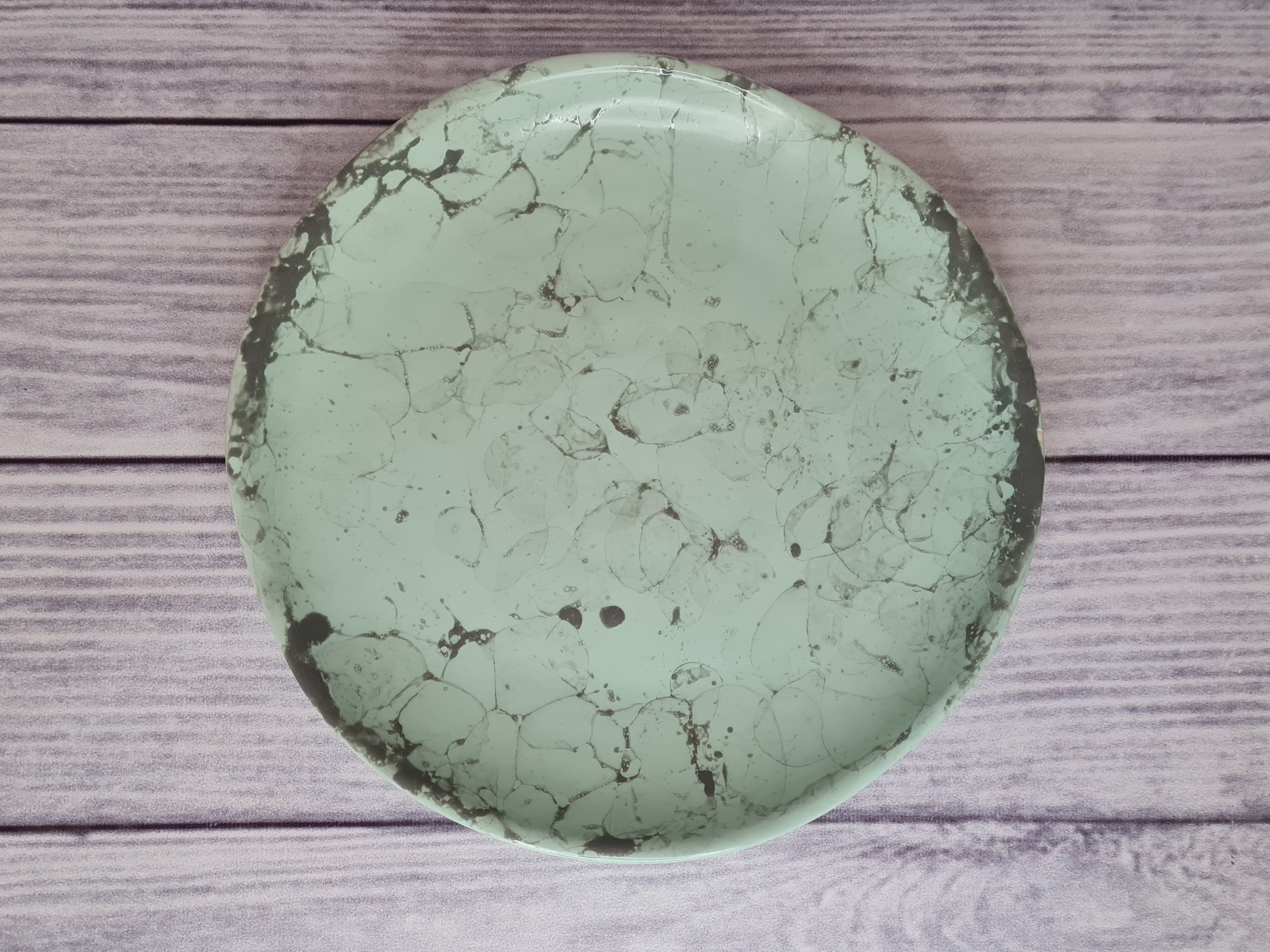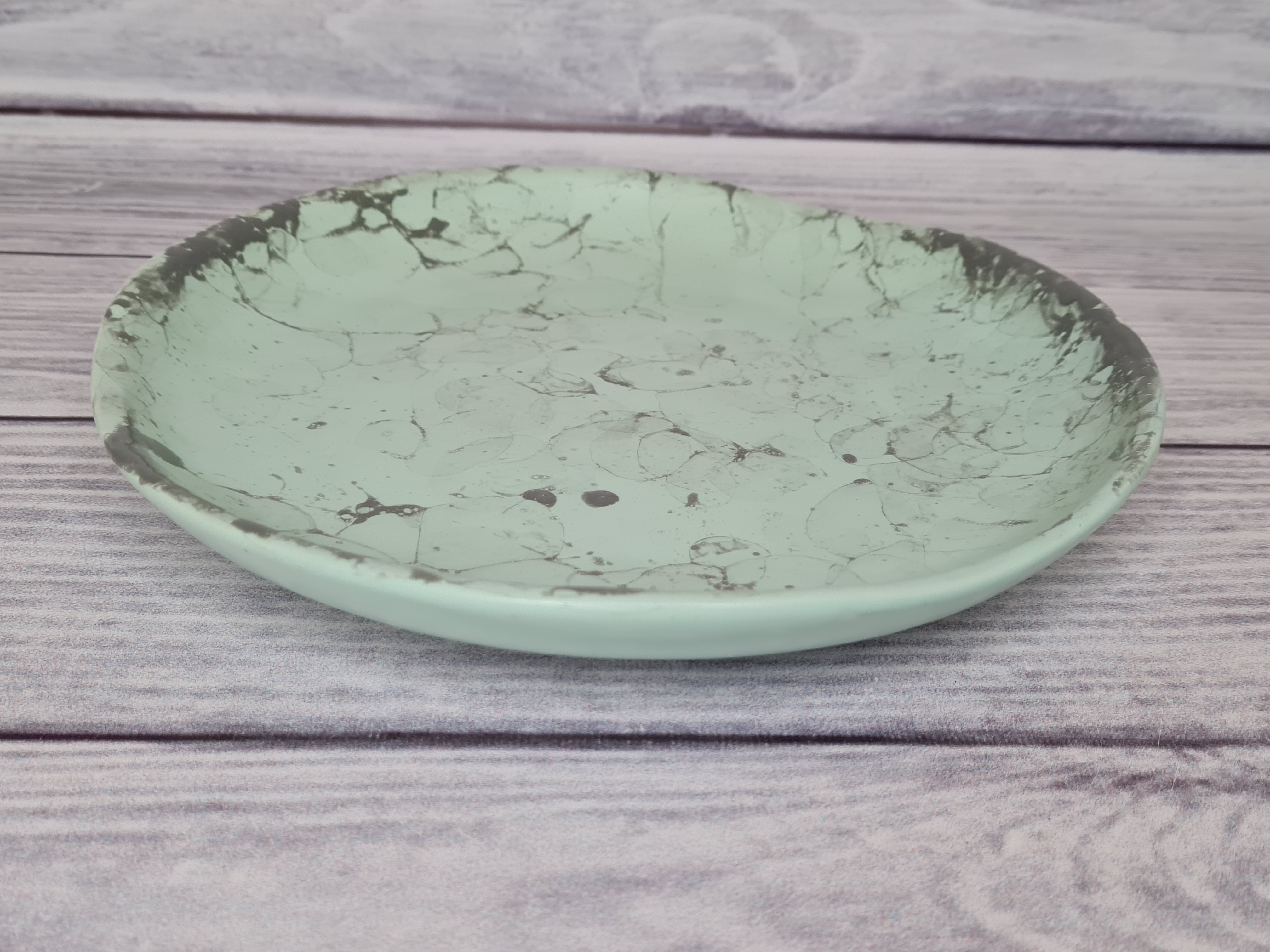 Компактная тарелка сочетает в себе изысканный дизайн с максимальной функциональностью. Воодушевит вас на создание новых блюд. Производится из современного и экологически чистого материала - фарфора. Подходит для использования в микроволновой печи и посудомоечной машине. Матовая поверхность мятного цвета с серыми разводами.