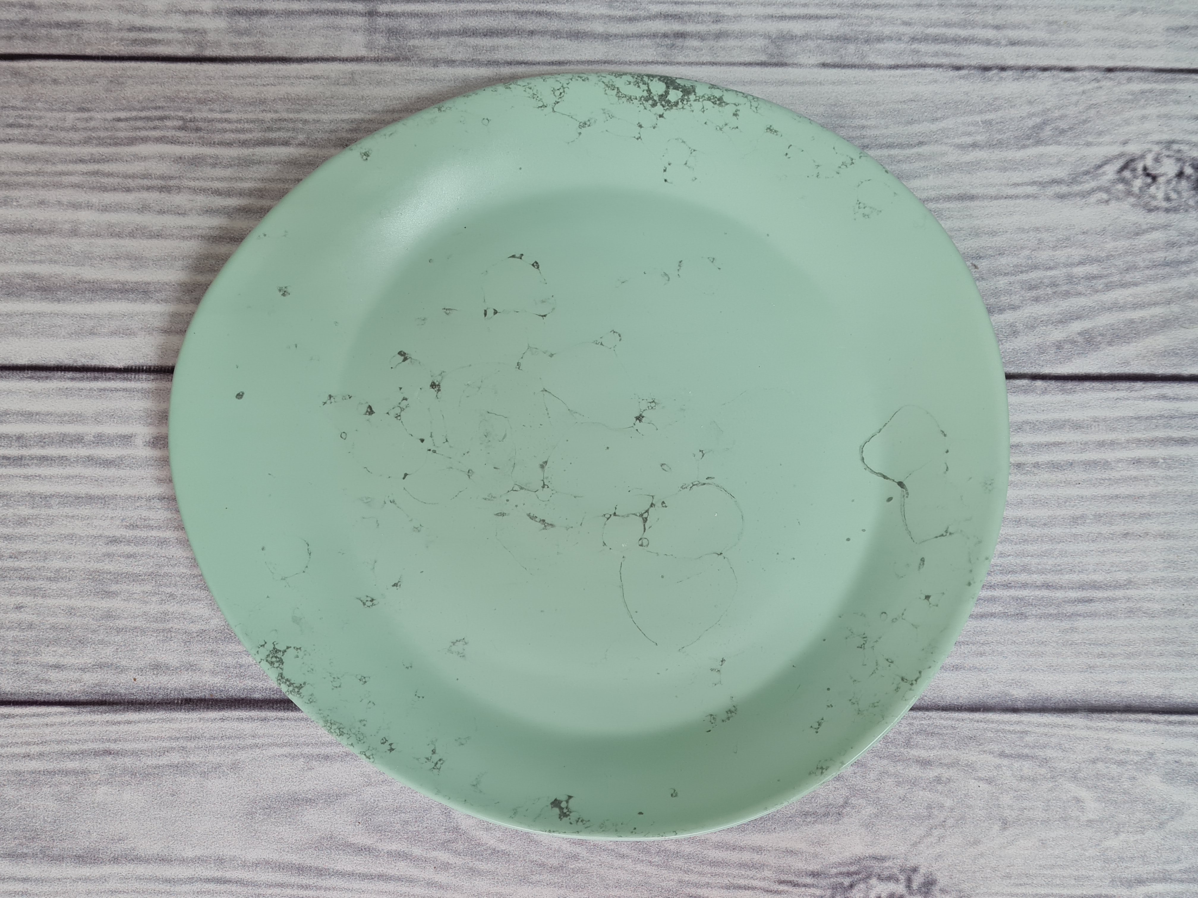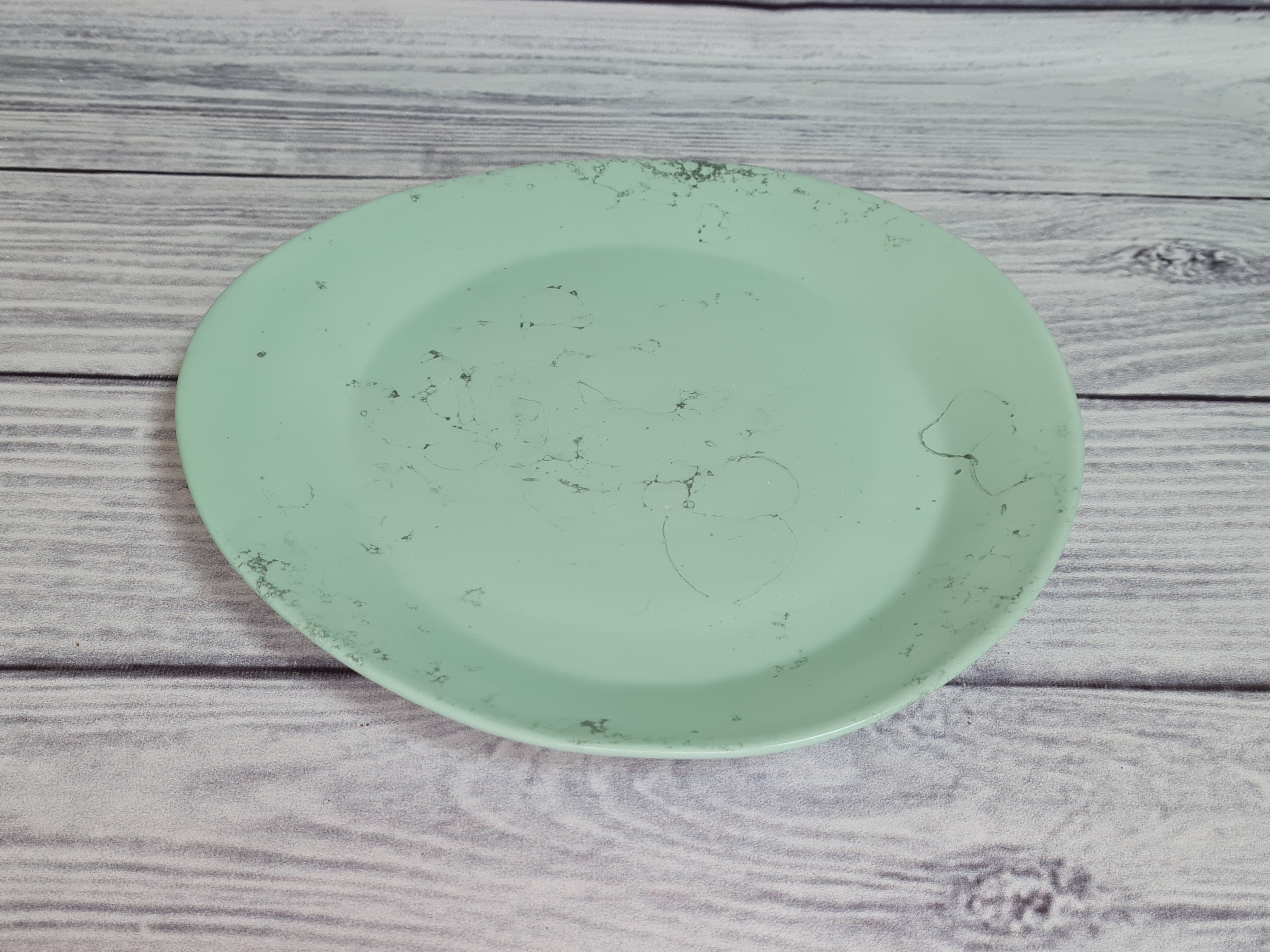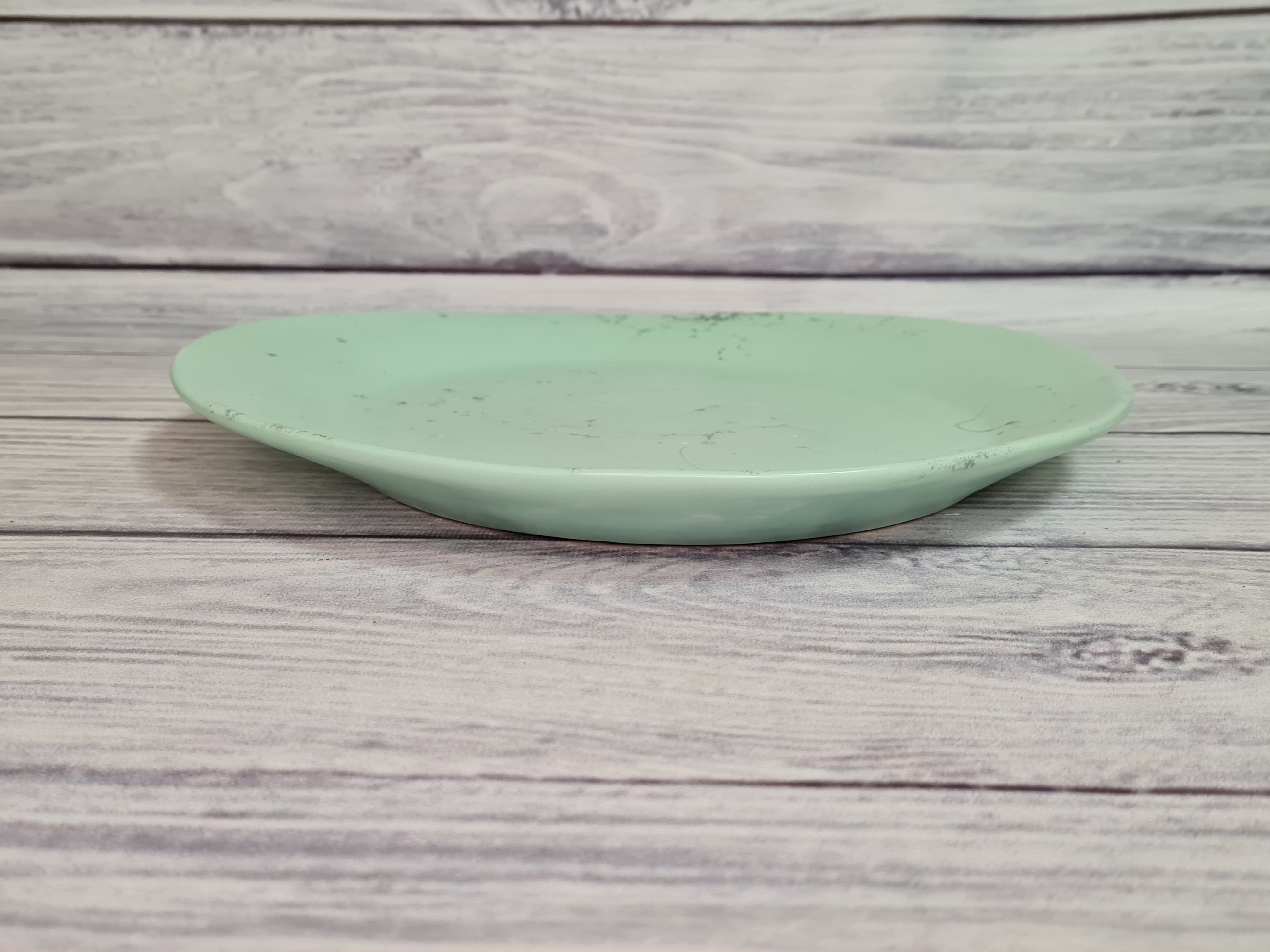 Тарелка средних размеров неправильной формы. Оригинальный дизайн позволяет сделать красивую выкладку блюда в соответствии с замыслом шеф-повара. Как говорится – ничего лишнего – поданное на такой тарелке блюдо будет выглядеть необычно и вкусно. Матовая поверхность мятного цвета с серыми разводами.