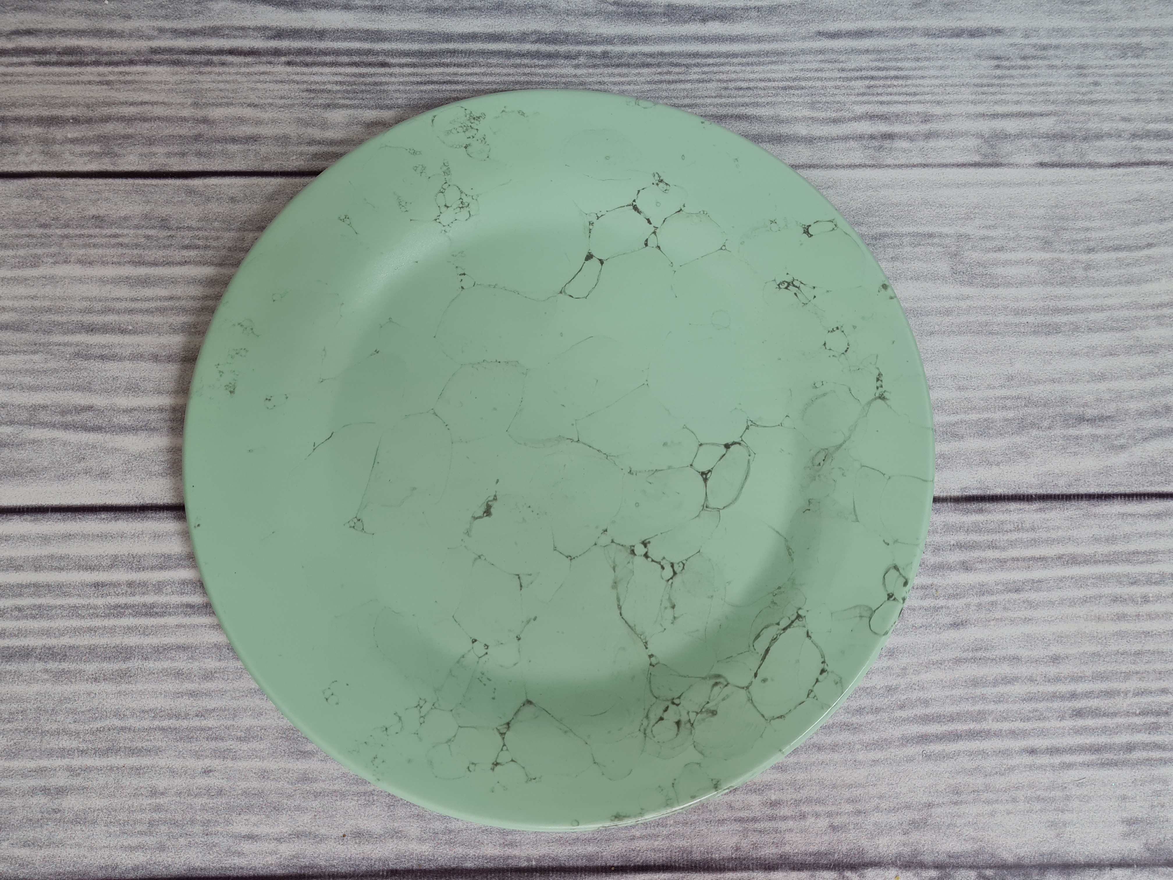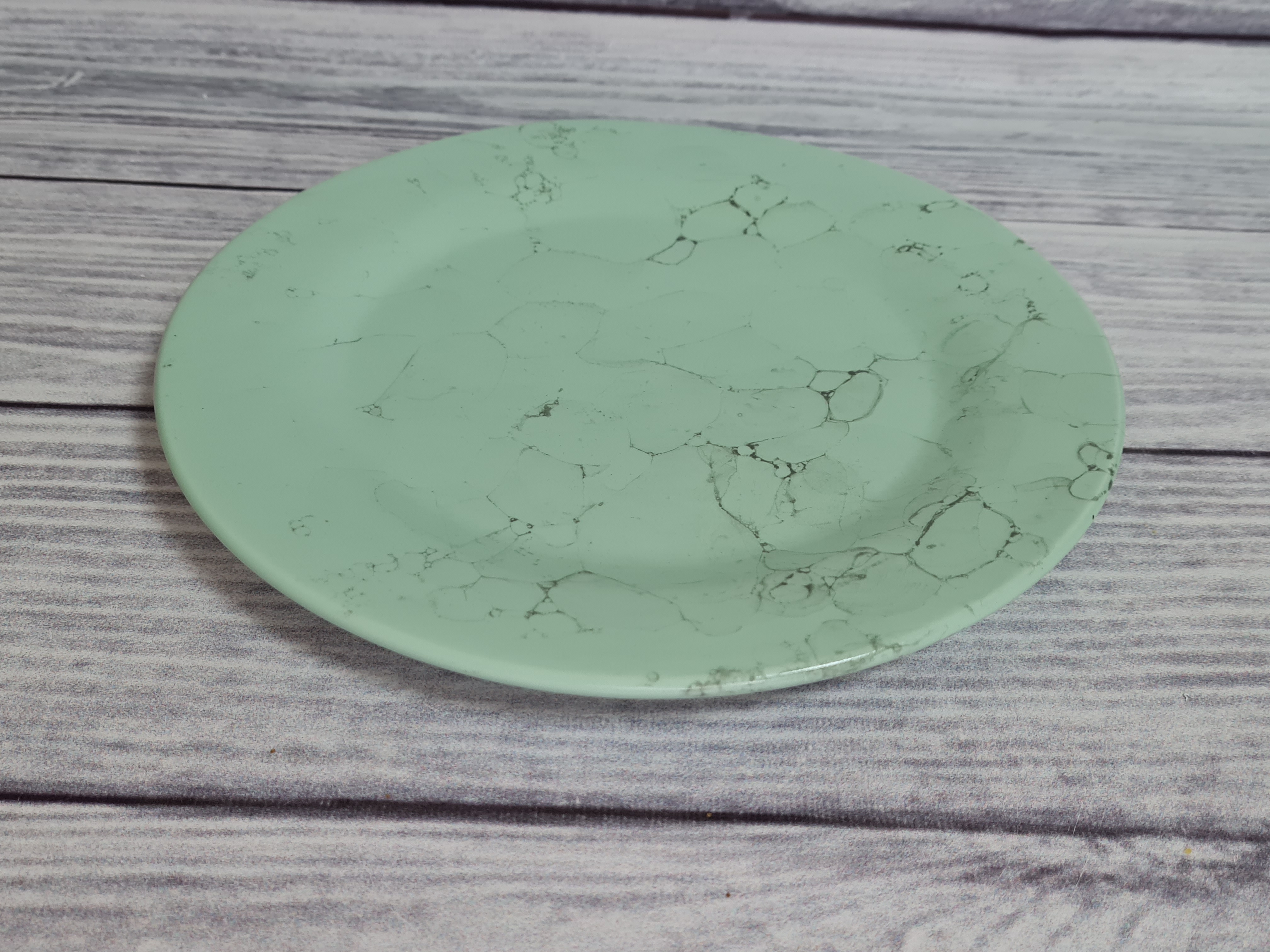 Яркий дизайн, удобная форма тарелки, имеющая утолщенный край. Блюдо, поданное на такой тарелке будет выглядеть вкуснее и придаст вам хорошую нотку настроения. Пригодна для использования в посудомоечной машине и микроволновой печи. Матовая поверхность мятного цвета с серыми разводами.