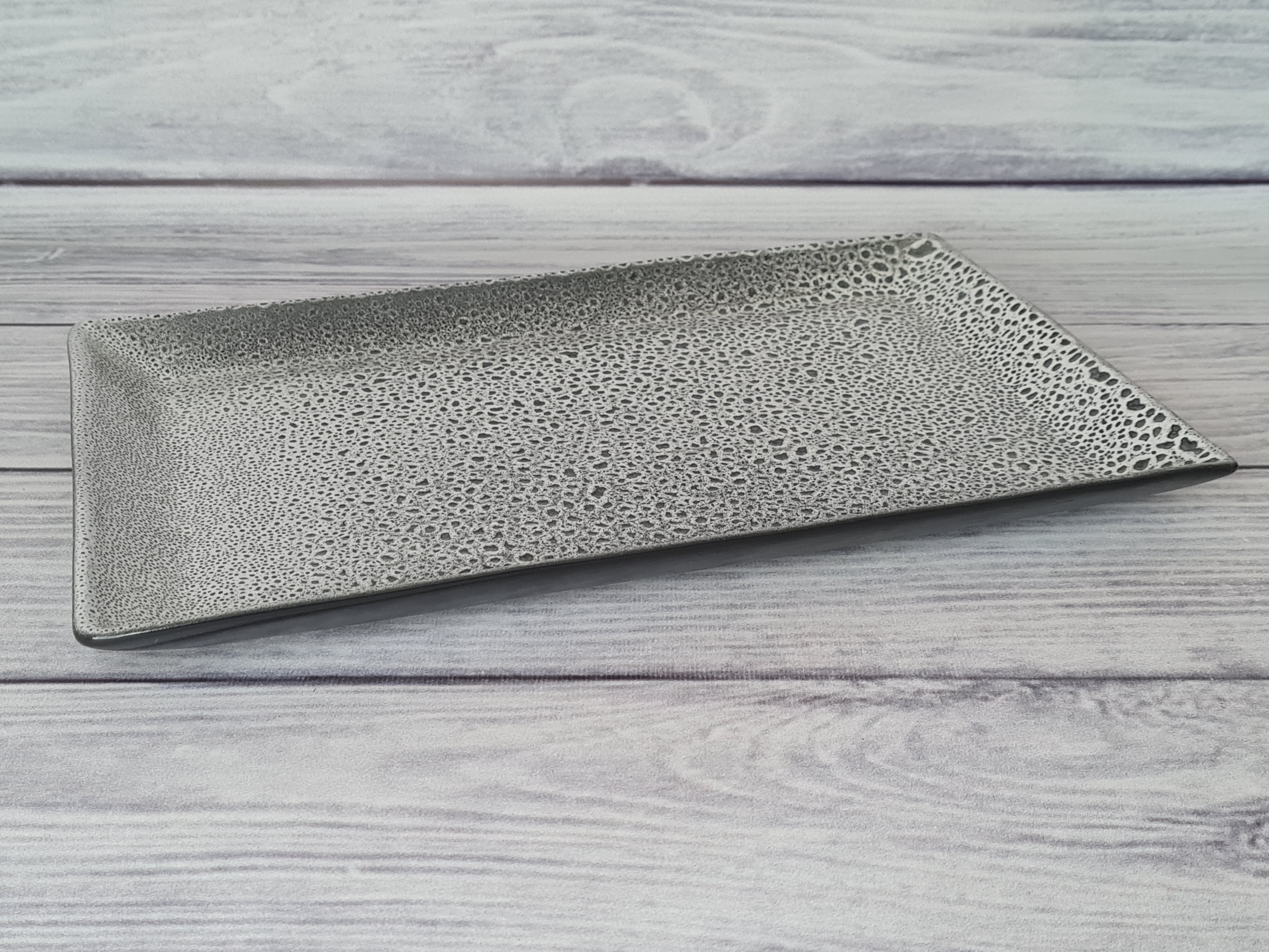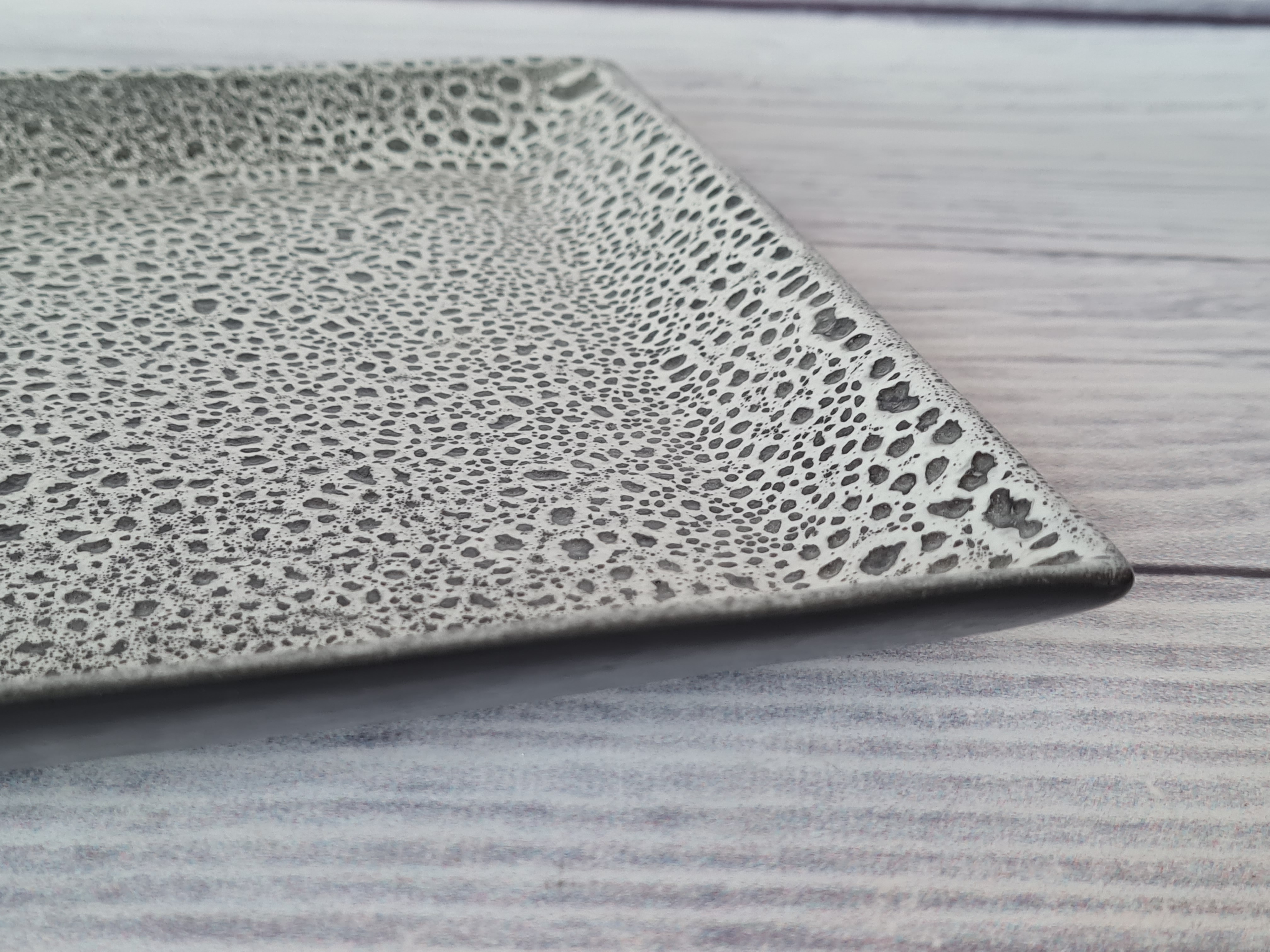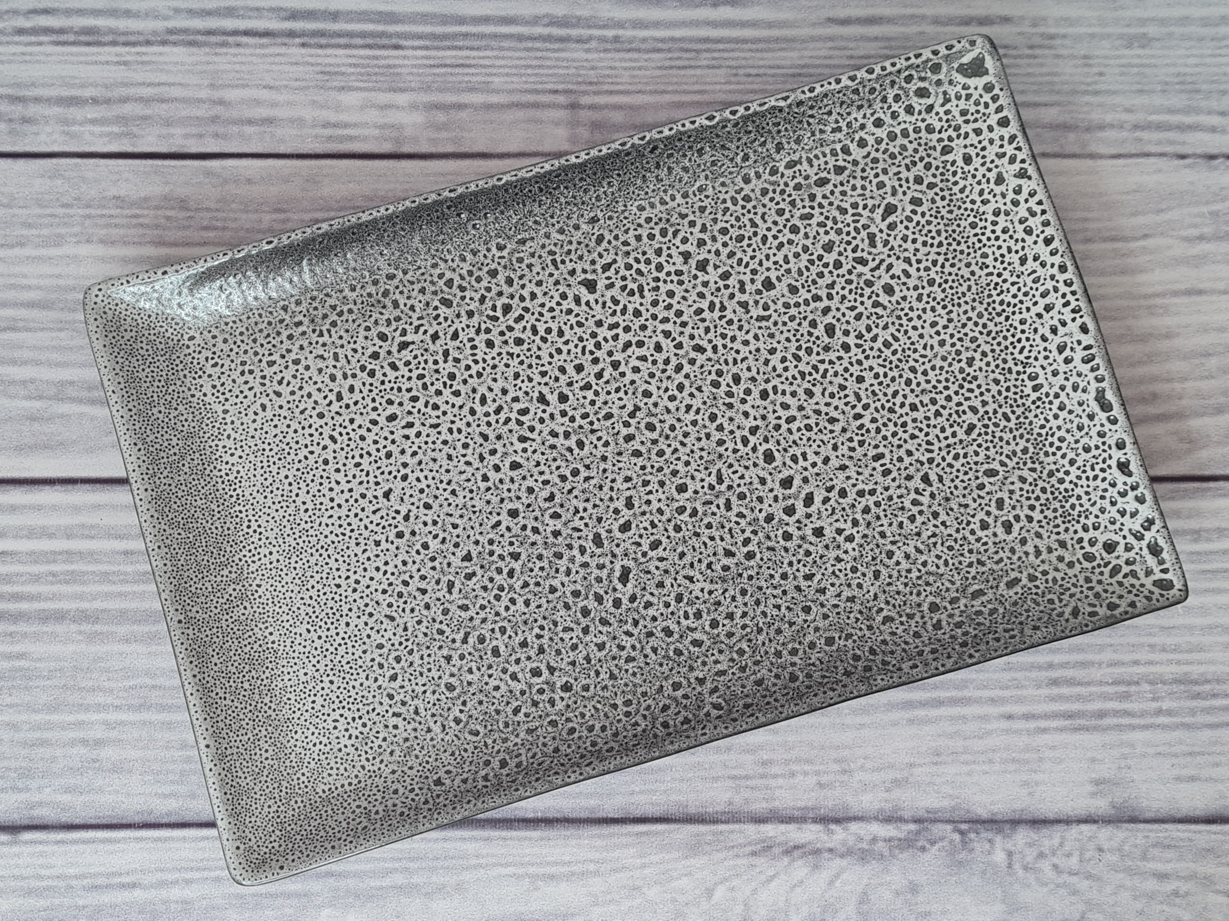 Блюдо pratico ortogonale большой прямоугольной формы. Для эффектной подачи мяса, рыбы, суши и других видов европейских и японских блюд. Очень практично в использовании и хранении, занимает мало места. Матовая рельефная поверхность с хаотичными черно-белыми кратерами.