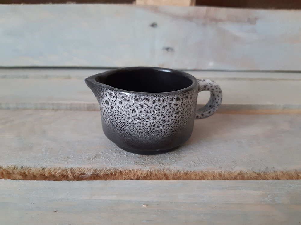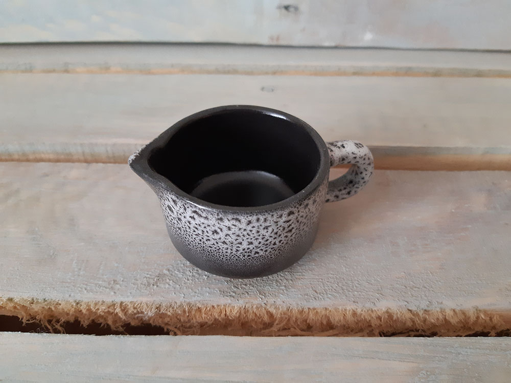 Элегантный маленький сливочник, который легко штабелируется и ставится один на один. Красивое миниатюрное изделие, которое будет приятным штрихом к полноценной сервировке. Матовая рельефная поверхность с хаотичными черно-белыми кратерами.