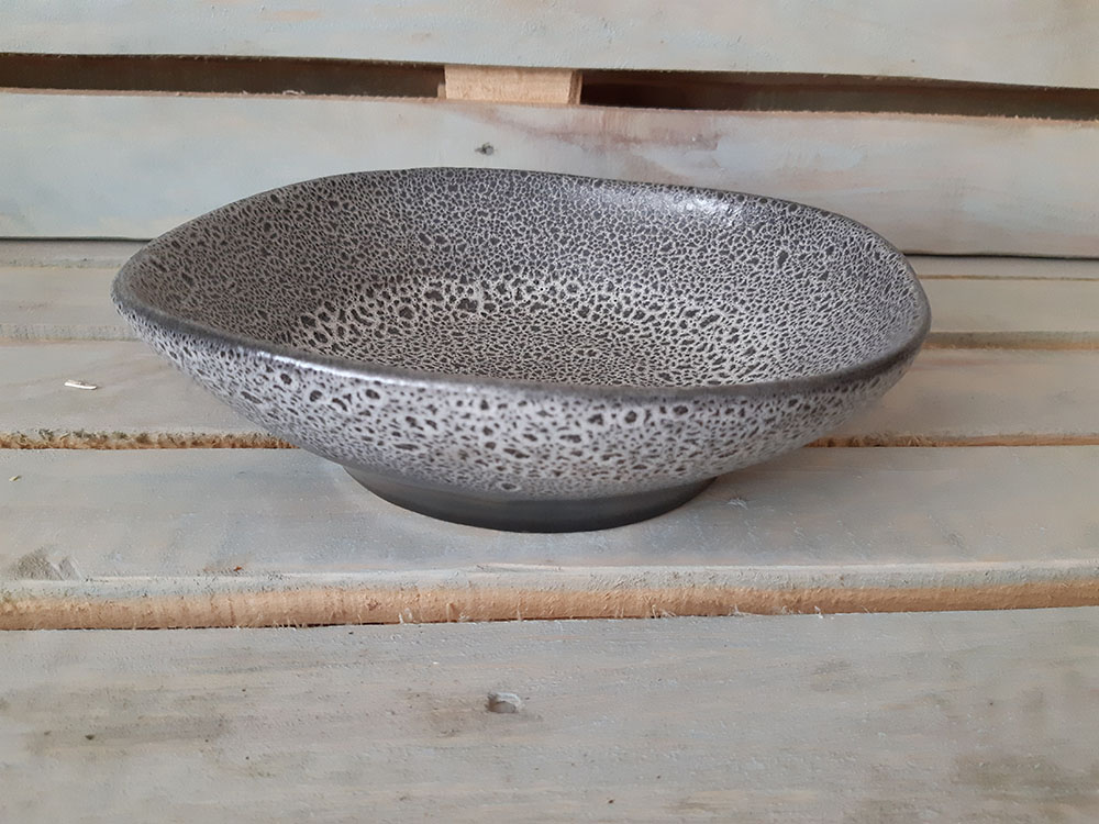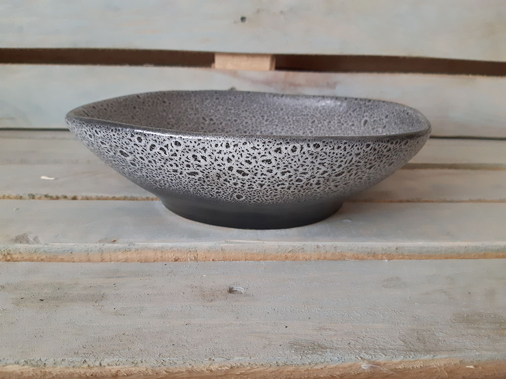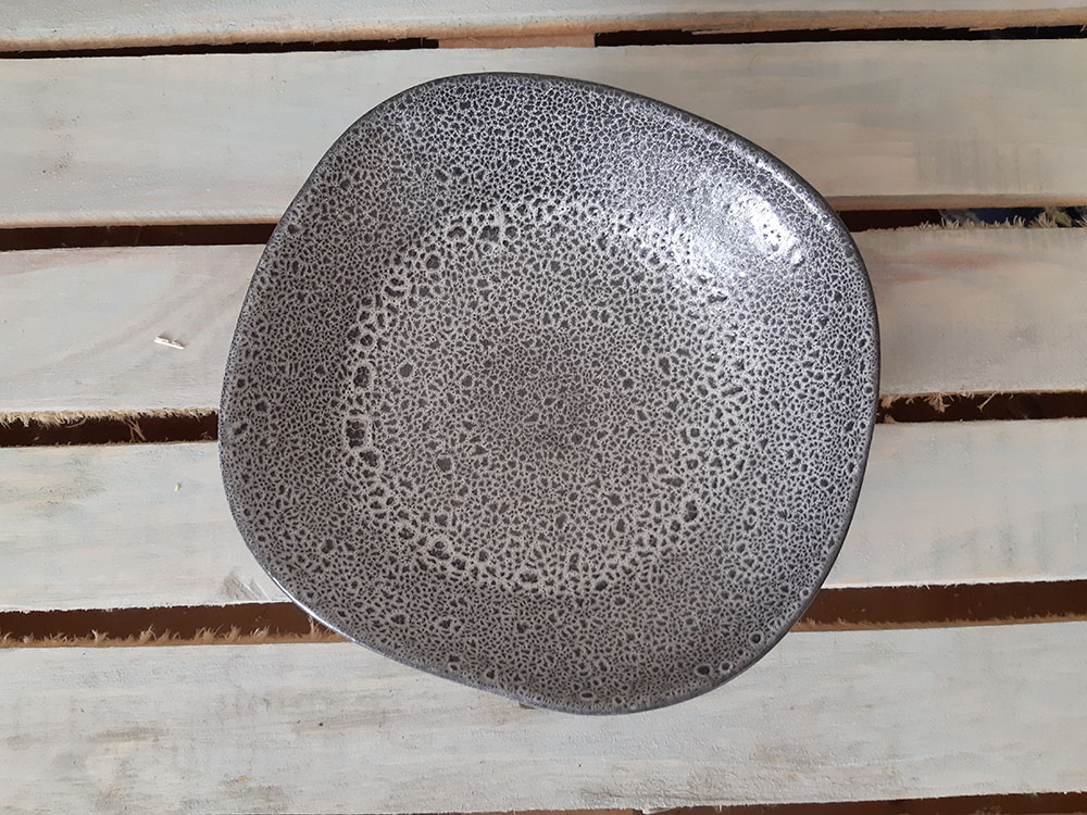 Фарфоровая тарелка с рельефной поверхностью, имитирующей гончарную работу. Идеально подойдет для подачи первых блюд и салатов. Послужит настоящим украшением вашего стола. Является дополнением к тарелке di modo и di modo campana. Можно использовать в микроволной печи и посудомоечной машине. Матовая рельефная поверхность с хаотичными черно-белыми кратерами.