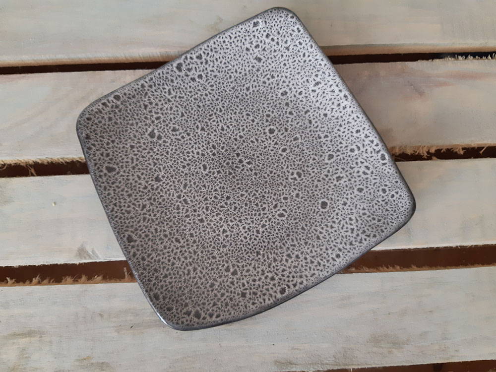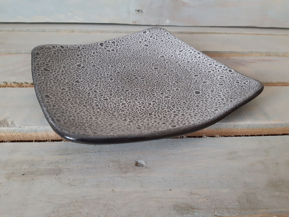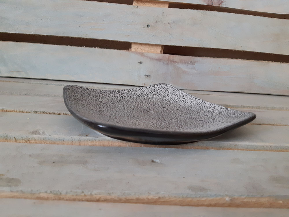 Тарелка di modo ассиметричной формы с рельефной поверхностью. Оригинальная форма, утолщенные края. Для стильной подачи блюд и подчеркивания интерьера заведения. Пригодна для использования в посудомоечной машине и микроволновой печи. Матовая рельефная поверхность с хаотичными черно-белыми кратерами.