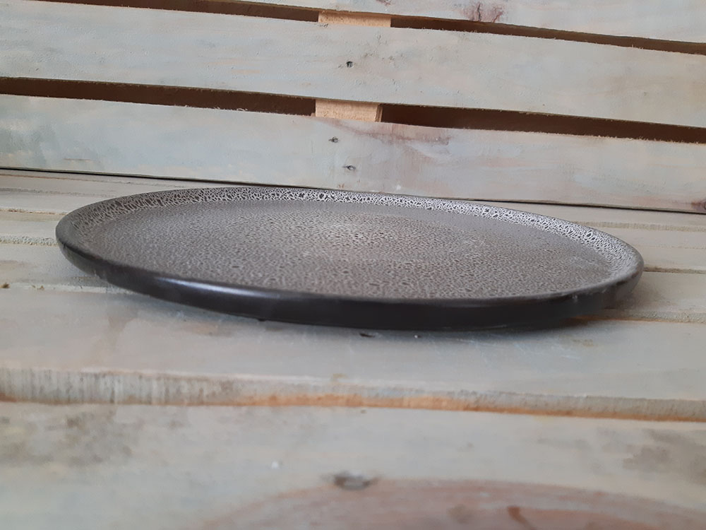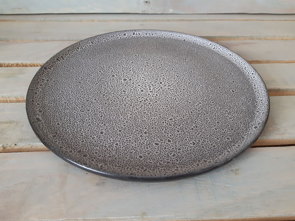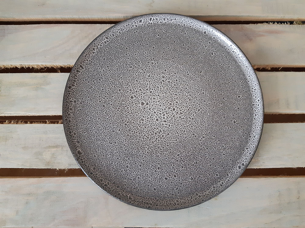 Тарелка под пиццу существенно отличается от остальной посуды, используемой для подачи горячих первых, вторых блюд и закусок. Она имеет плоскую форму со слегка загнутыми краями или невысокими бортиками. Плоское дно повторяет форму пиццы, а бортики предотвращают ее соскальзывание на стол в процессе нарезки. Пригодна для использования в посудомоечной машине и микроволновой печи. Матовая рельефная поверхность с хаотичными черно-белыми кратерами.