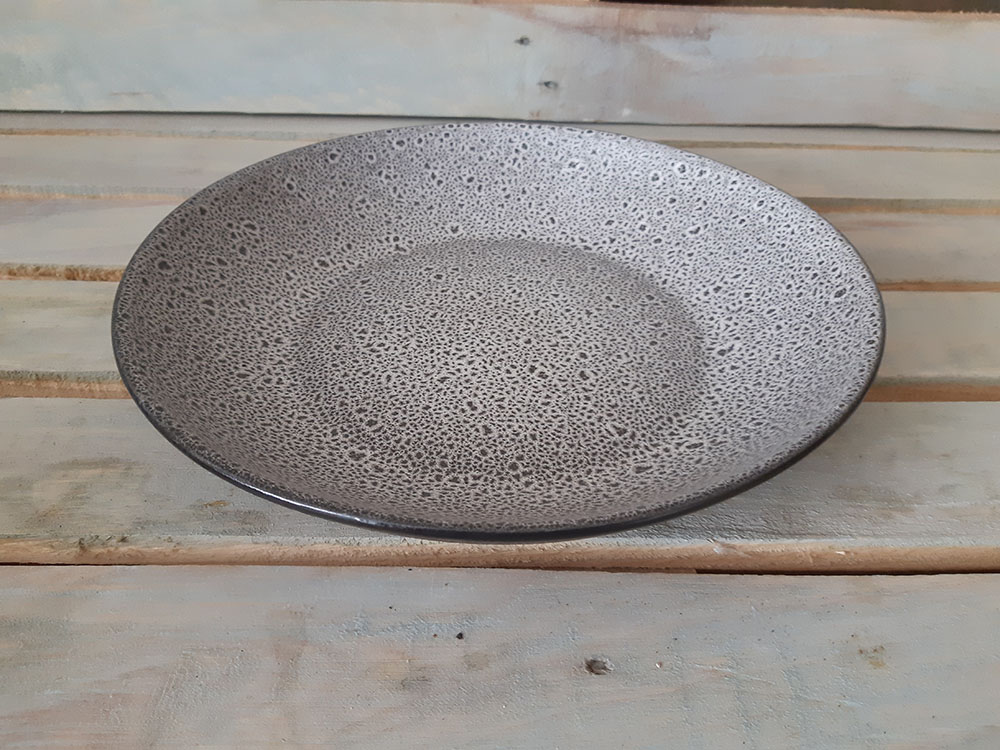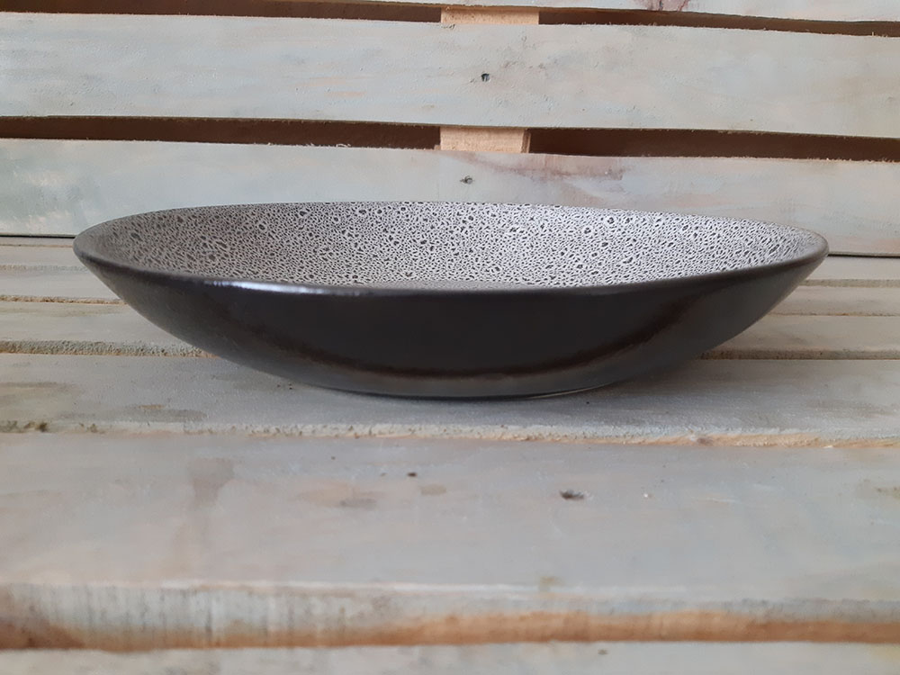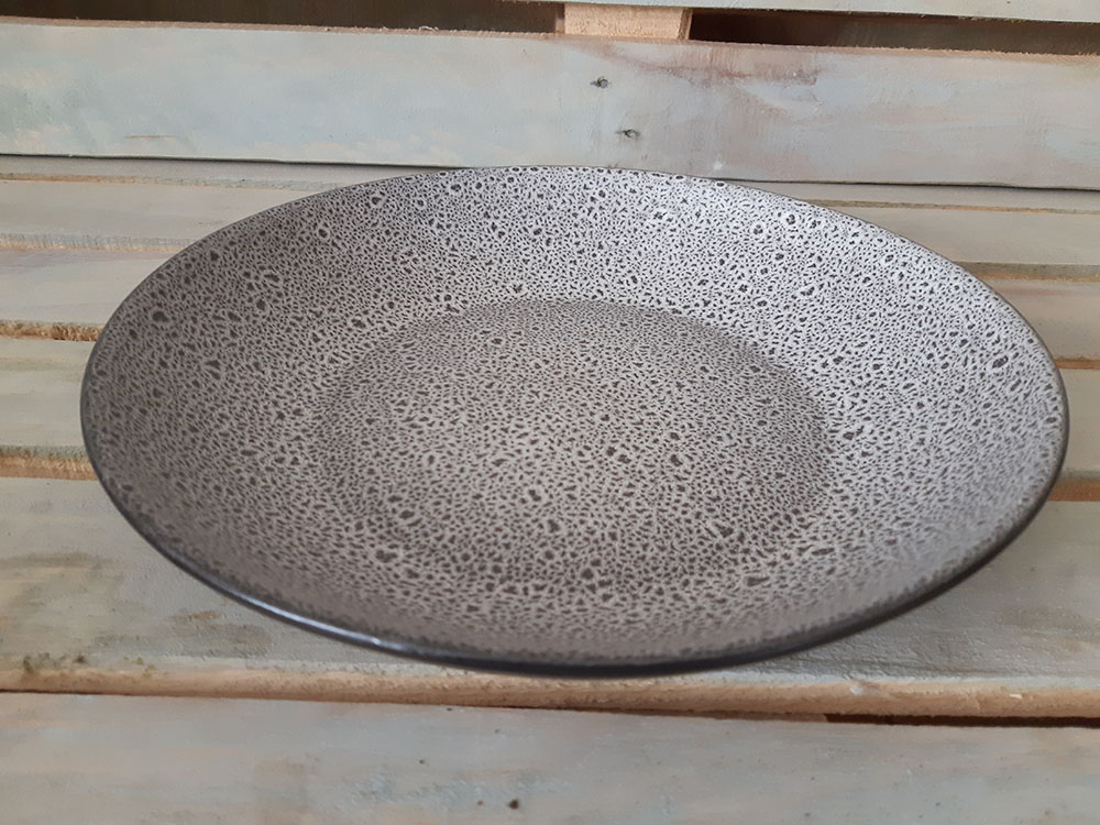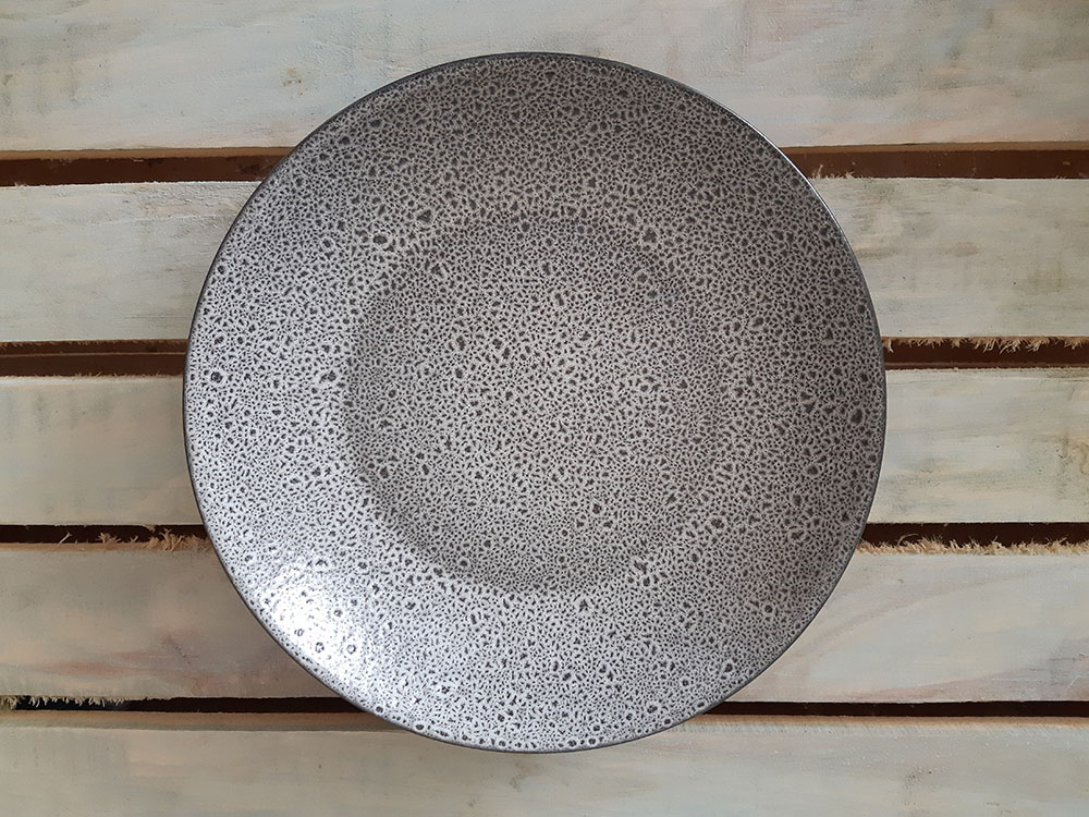 Тарелка большого диаметра с бортиками и широким дном позволяет сделать оригинальную выкладку блюда в соответствии с замыслом шеф-повара. Как говорится – ничего лишнего – поданное на такой тарелке блюдо не потеряется и будет выглядеть изысканно и аппетитно. Матовая рельефная поверхность с хаотичными черно-белыми кратерами.