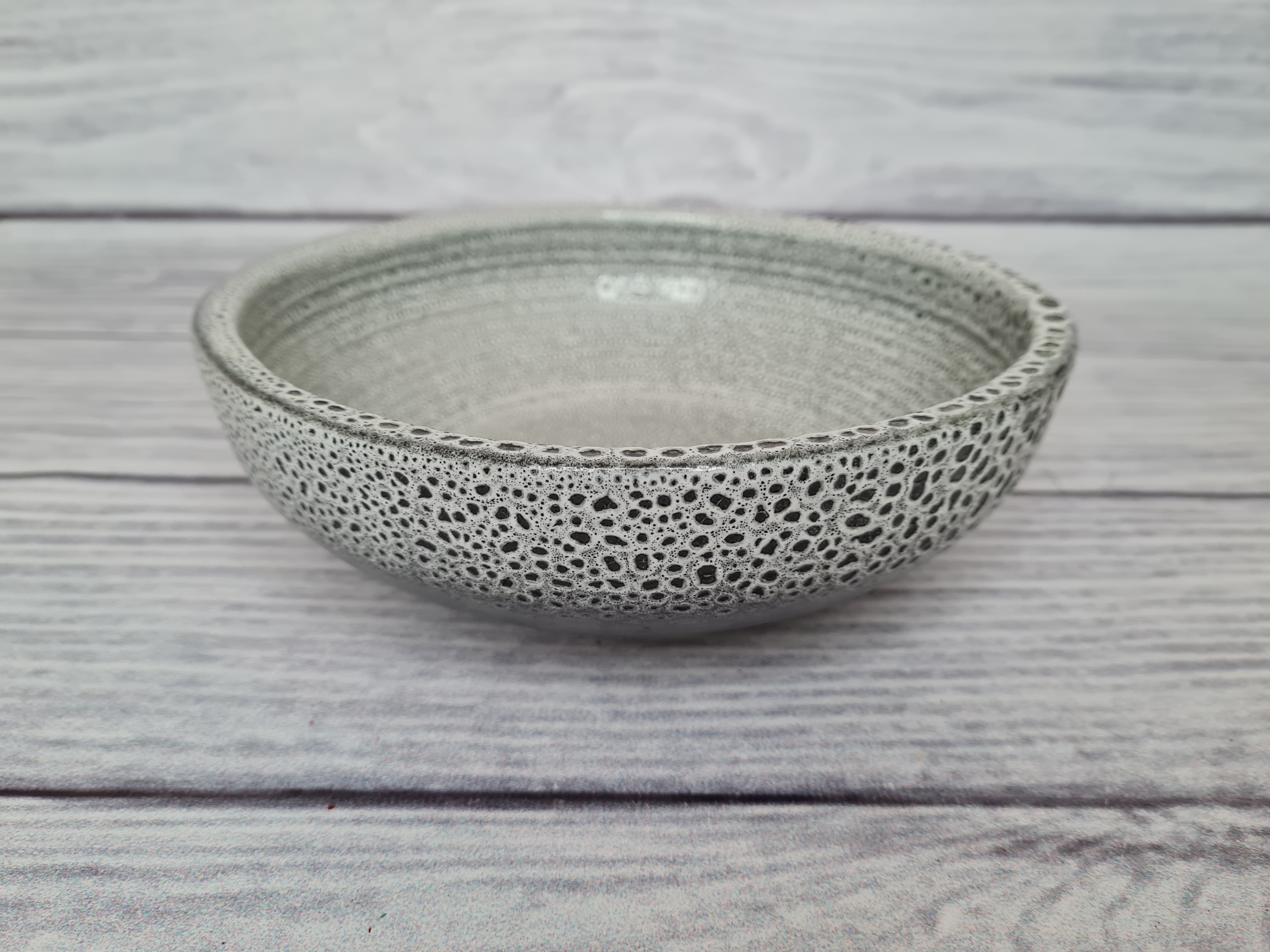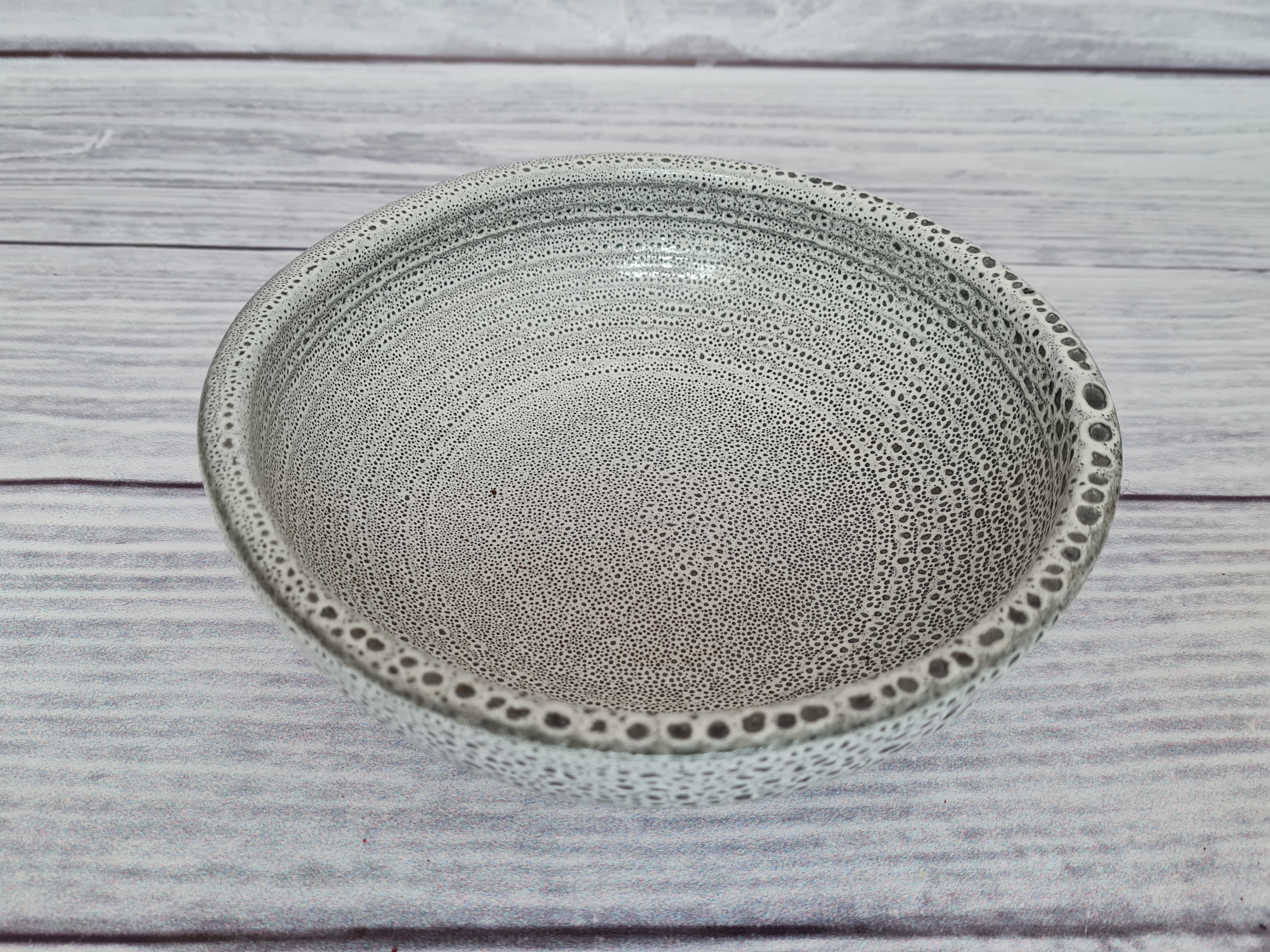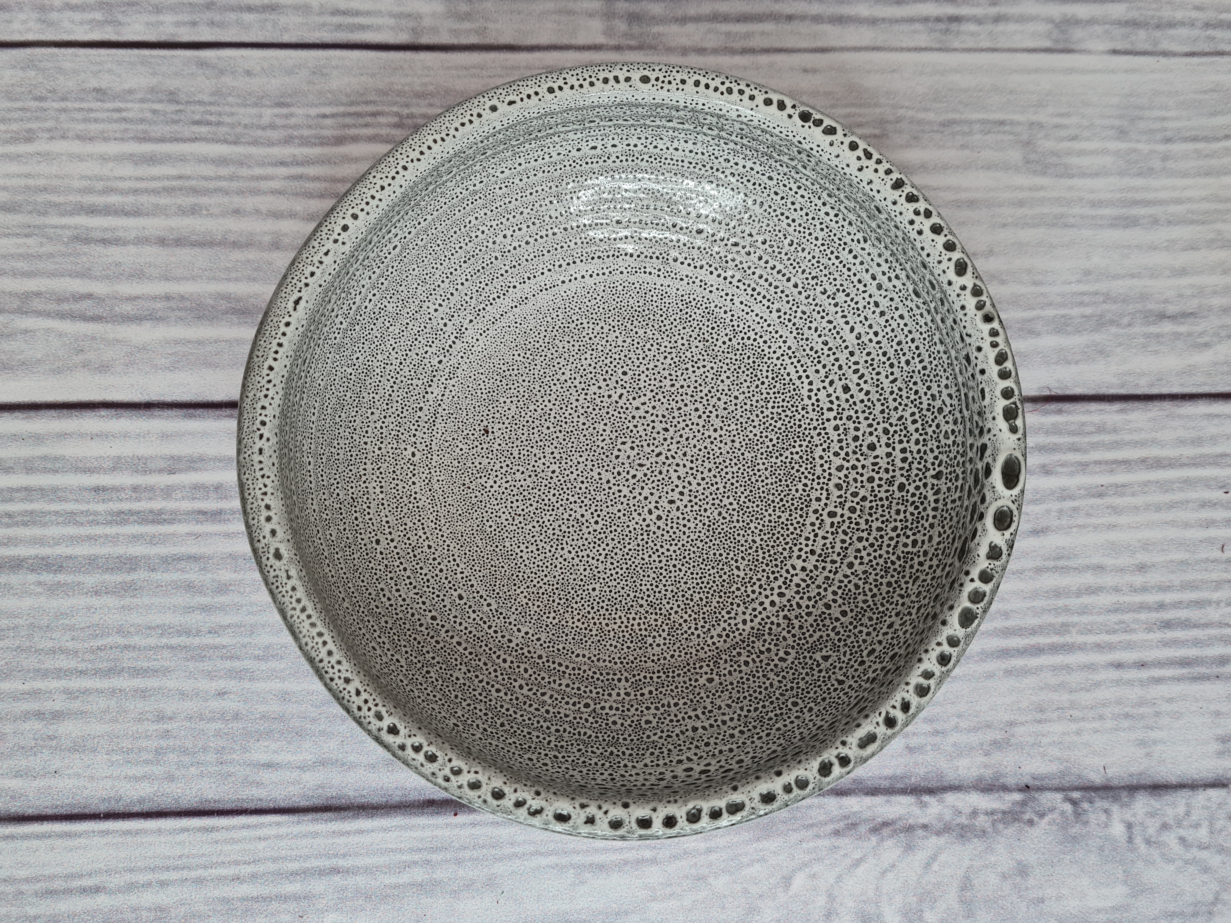 Фарфоровая тарелка, внутри и снаружи имеет рельеф, имитирующий работу гончара. Подача блюд в такой тарелке выглядит оригинально и загадочно. Модный тренд в современной сервировке. Пригодна для использования в посудомоечной машине и микроволновой печи. Матовая поверхность.