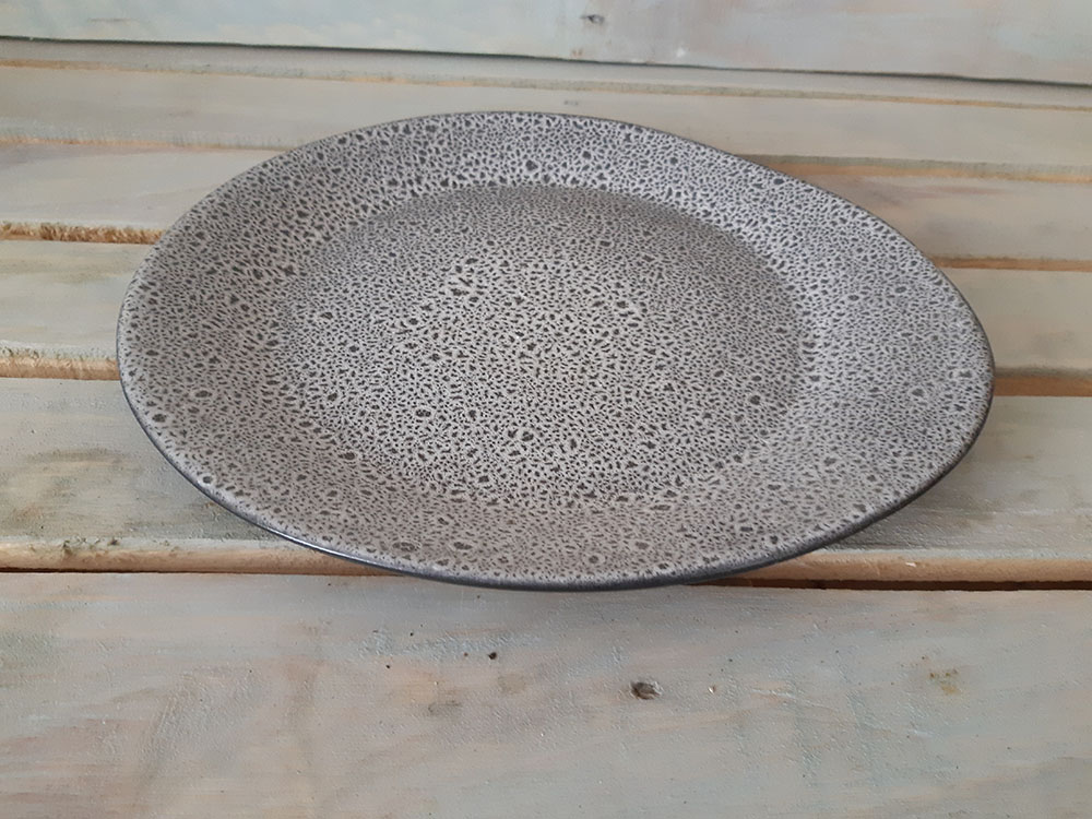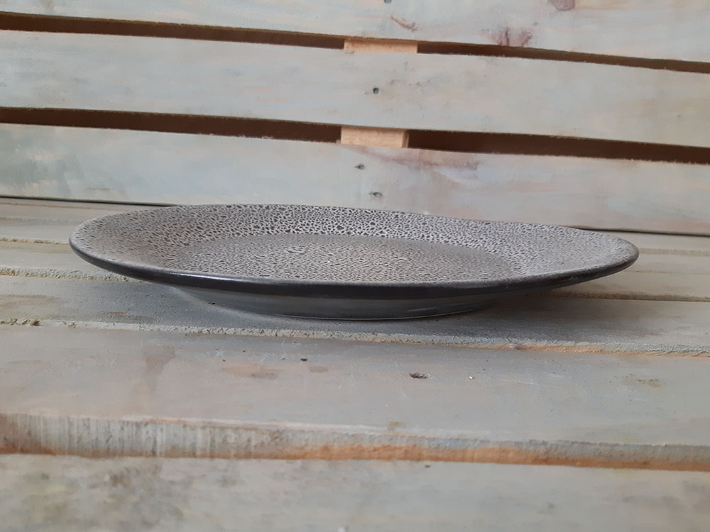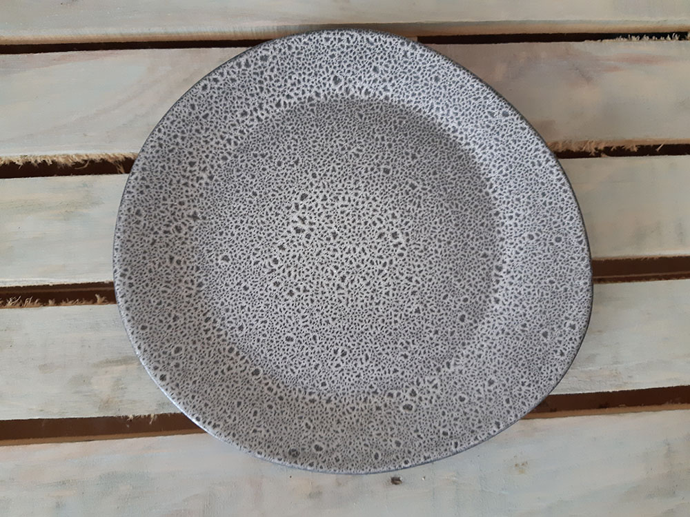 Тарелка больших размеров неправильной формы. Оригинальный дизайн позволяет сделать красивую выкладку блюда в соответствии с замыслом шеф-повара. Как говорится – ничего лишнего – поданное на такой тарелке блюдо будет выглядеть необычно и вкусно. Матовая рельефная поверхность с хаотичными черно-белыми кратерами.
