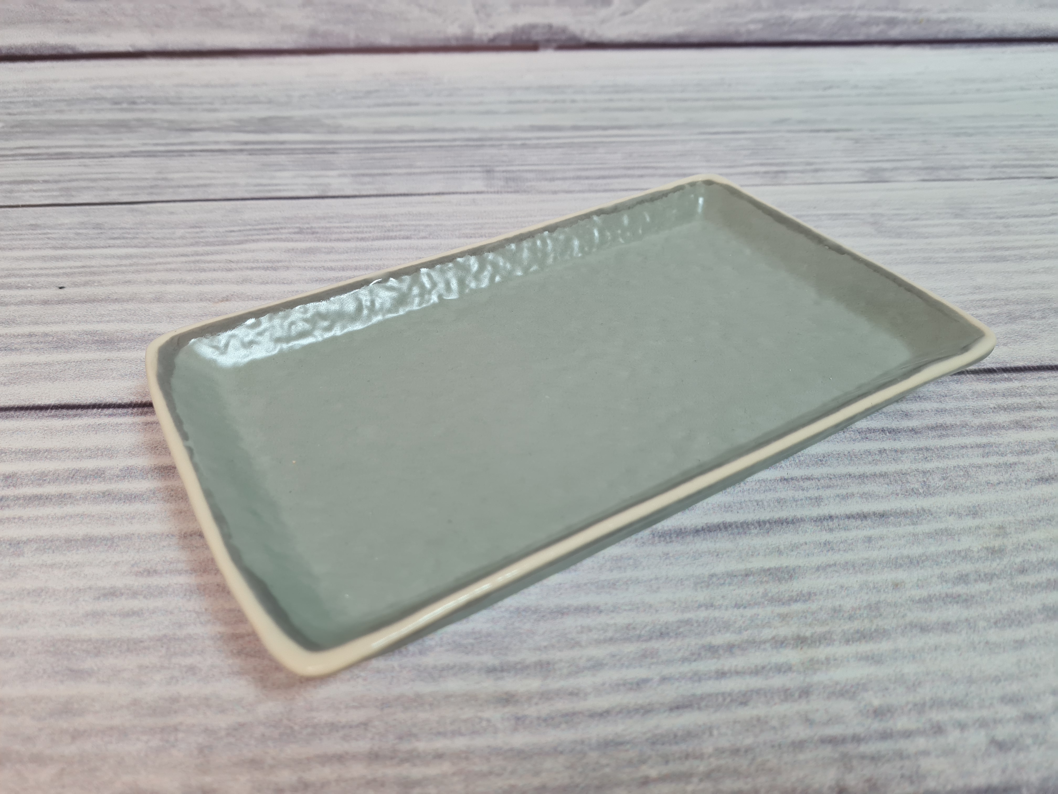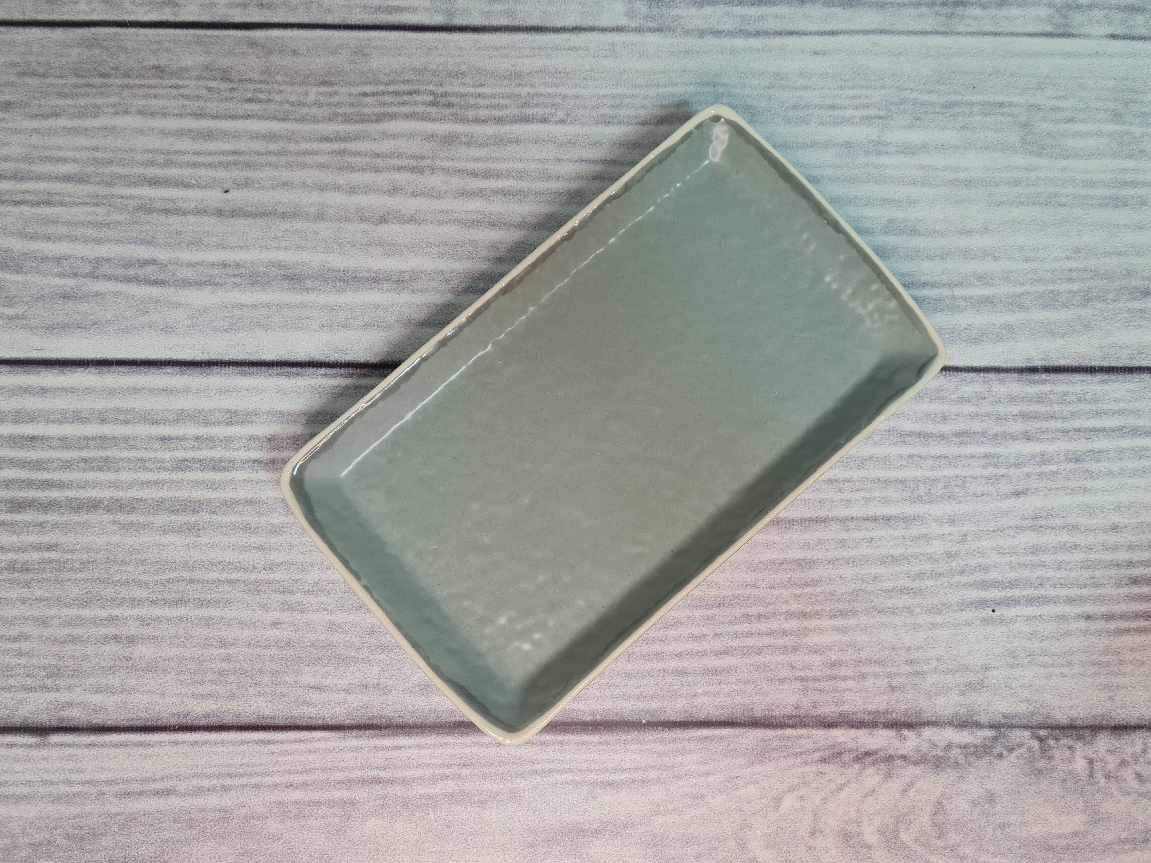 Стильное прямоугольное блюдо. Прекрасно подойдет для фруктовой, овощной и мясной нарезки. Удобная и изысканная деталь для сервировки стола. Блюдо небольшого размера и его плюс - это компактность. Очень практично в использовании и хранении, занимает мало места. Рельефная поверхность мелкими бугорками, матовый серый цвет и светлая кайма.