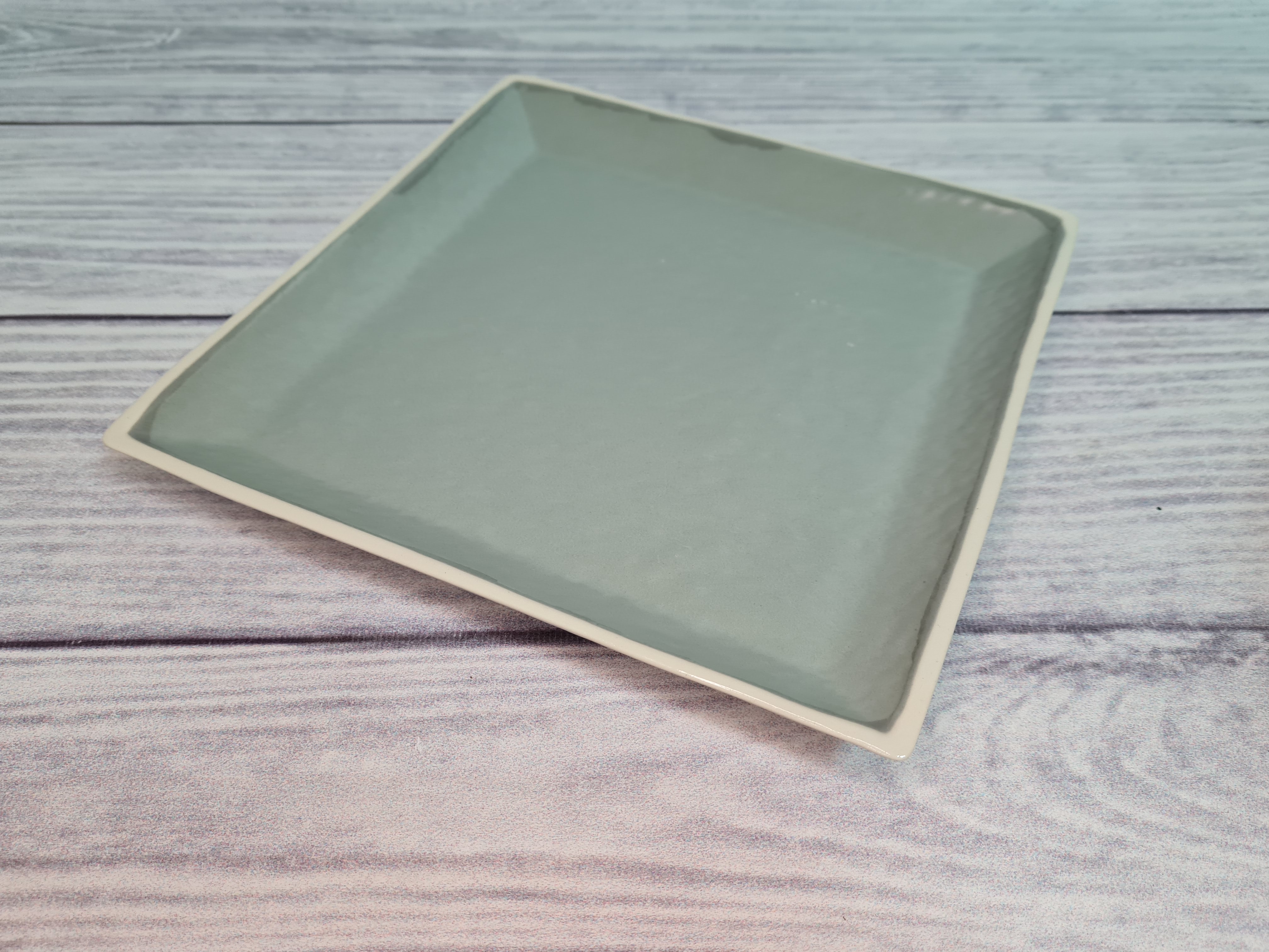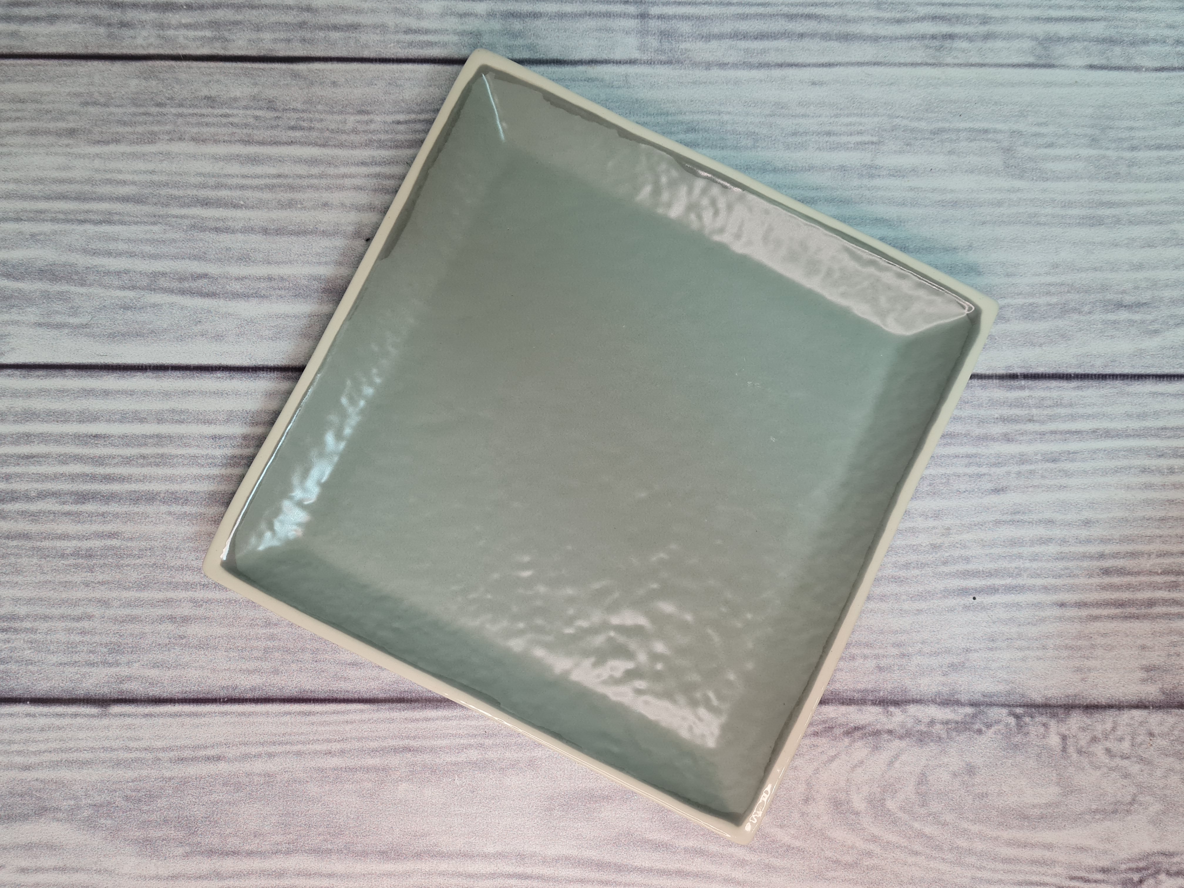 Большое блюдо квадратной формы. Такая форма практична, позволяет экономить место как при хранении так и при сервировке стола, блюда, поданные на таких тарелках, выглядят аппетитно и оригинально. Рельефная поверхность мелкими бугорками, матовый серый цвет и светлая кайма.