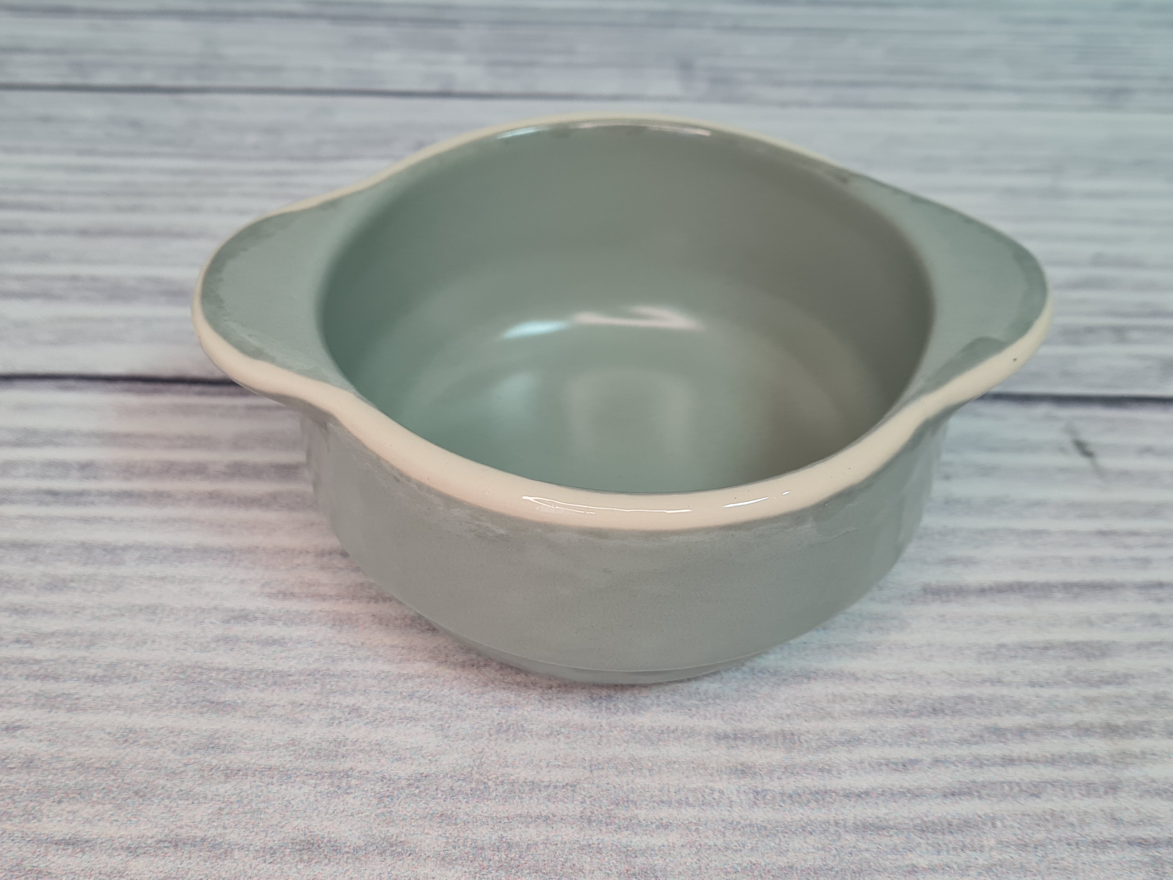 Оригинальная бульонница с ручками-ушками. Ручки такой формы менее подвержены сколам и реже отбиваются, бульонница прослужит дольше. Штабелируется одна на одну для экономии места. Пригодна для использования в посудомоечной машине и микроволновой печи. Рельефная поверхность мелкими бугорками, матовый серый цвет и светлая кайма.