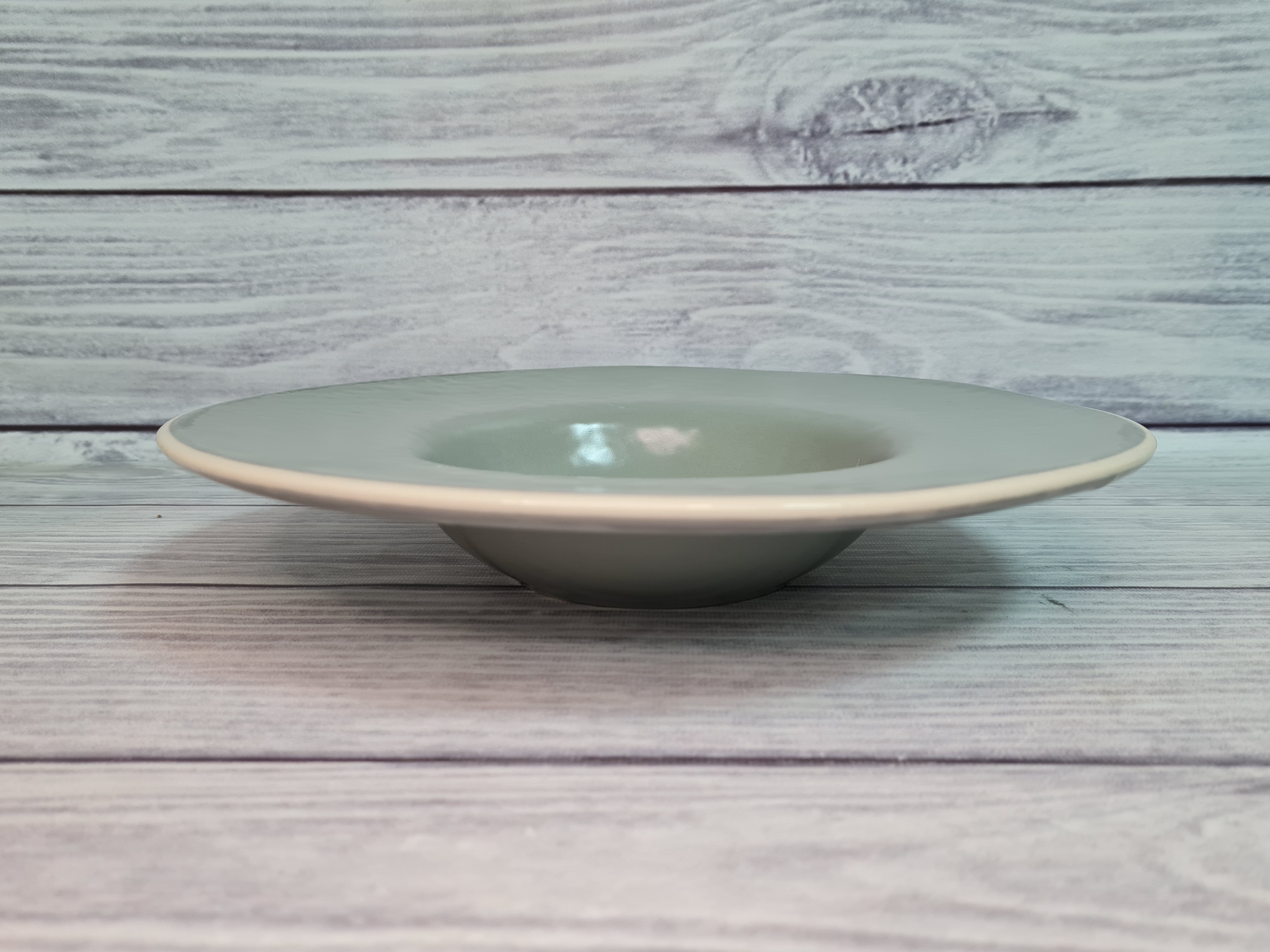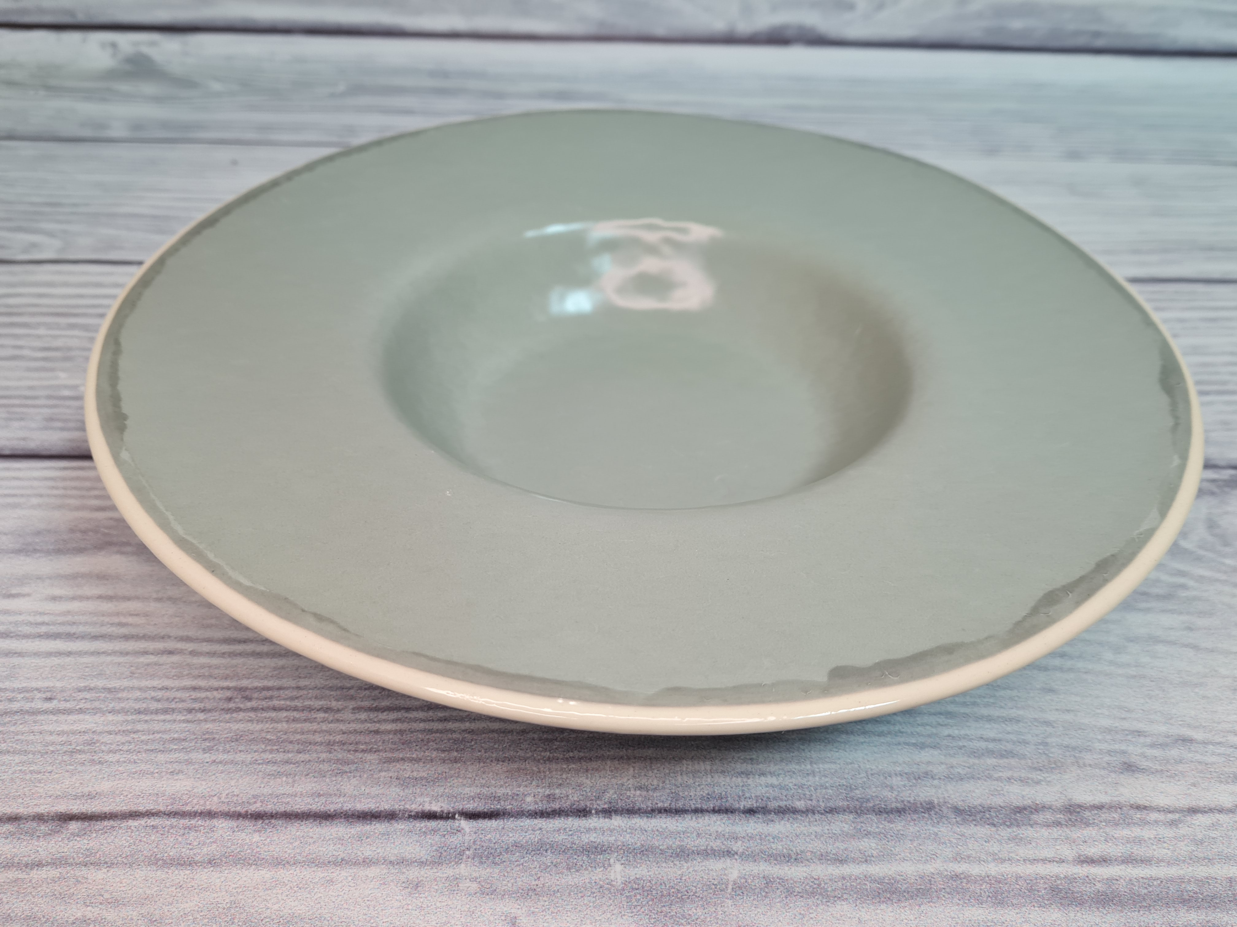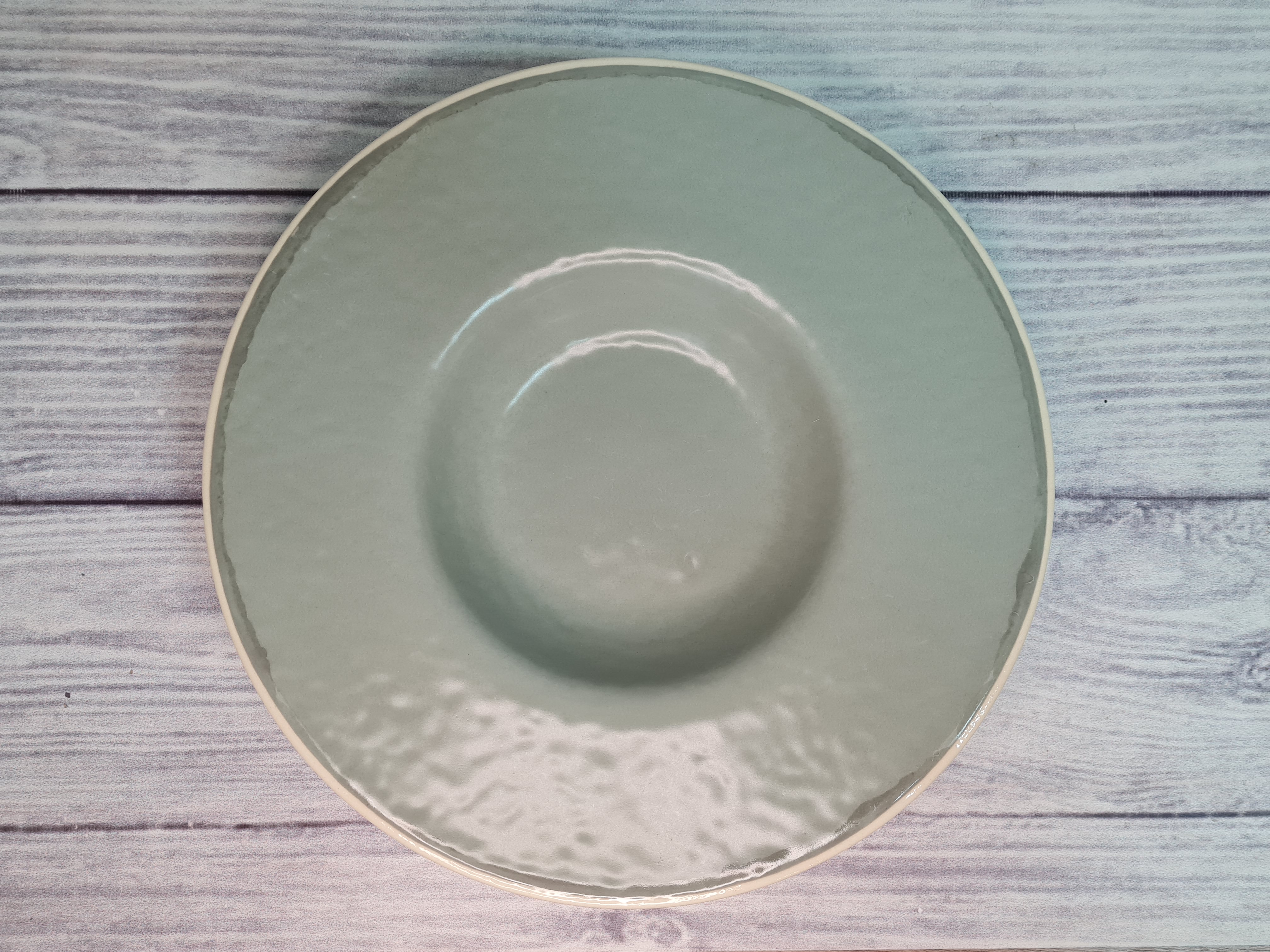 Глубокая тарелка с широкими краями, что расширяет повару простор для творчества. Во многих кафе и ресторанах предлагают блюда итальянской кухни, включая пасту. Ее принято подавать на специальной тарелке для пасты. Рельефная поверхность мелкими бугорками, матовый серый цвет и светлая кайма.