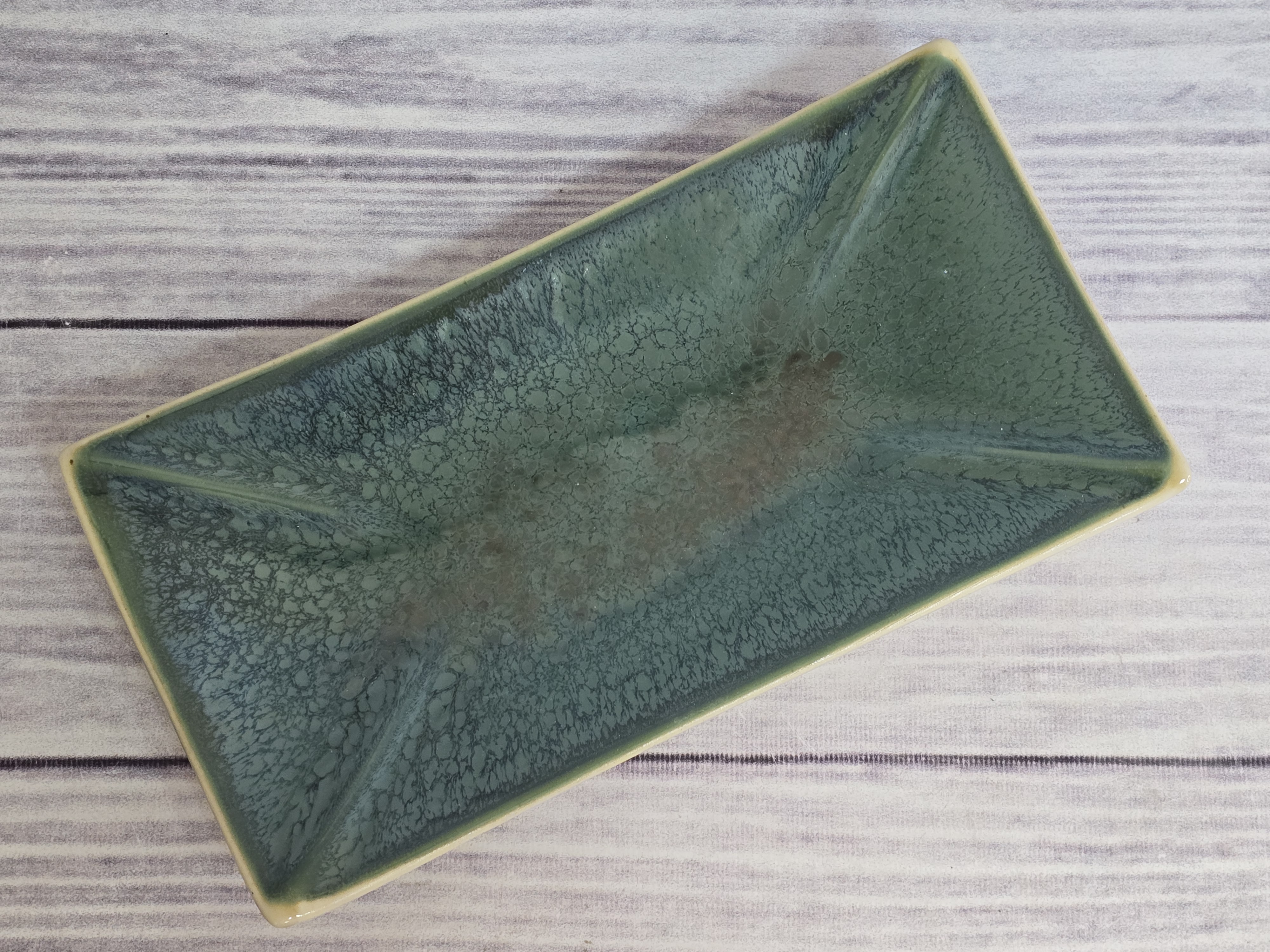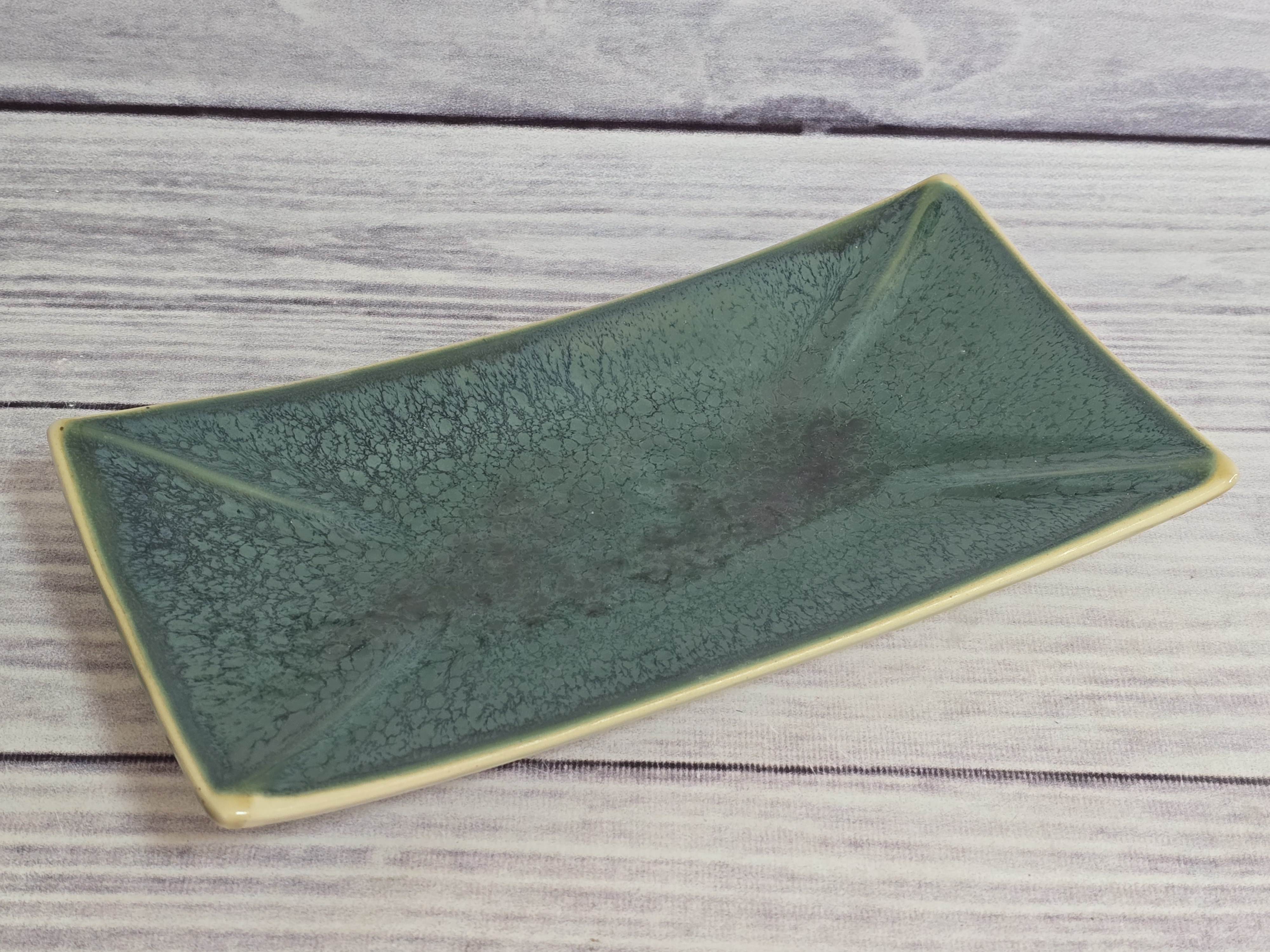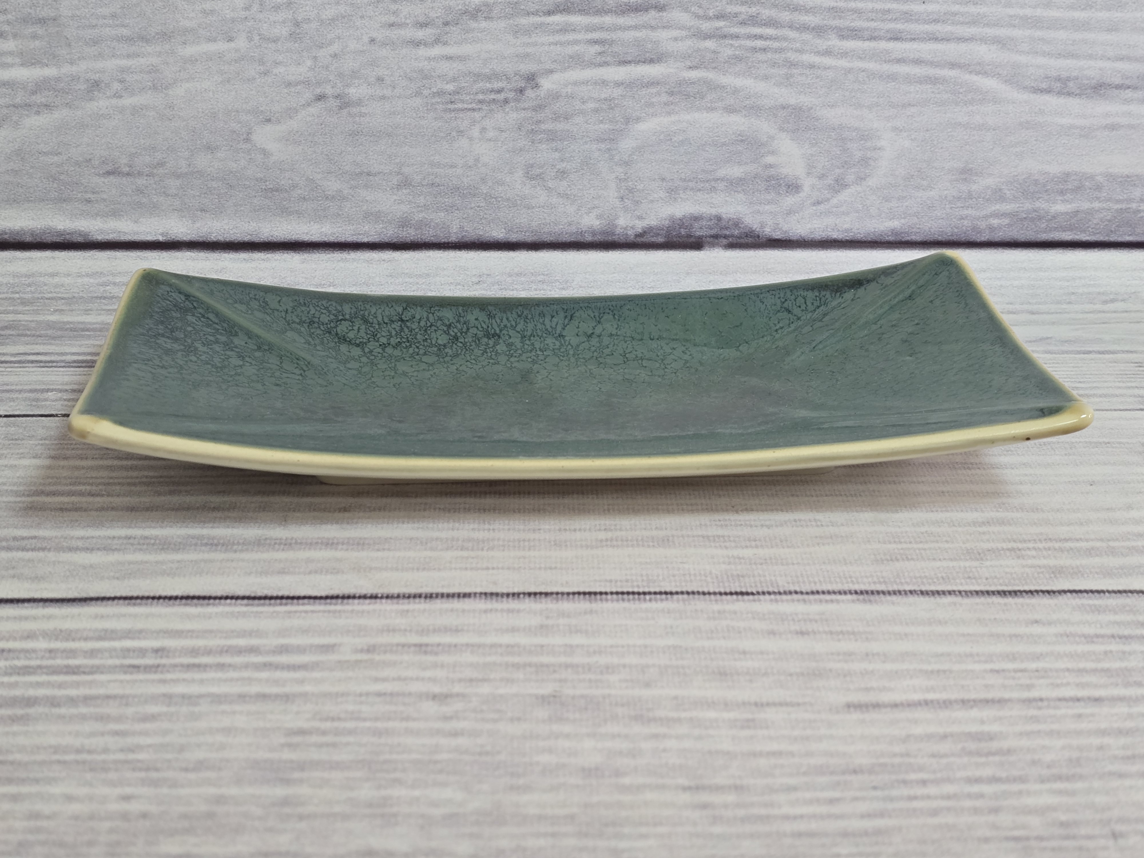 Фарфоровое блюдо для суши прямоугольной формы с приподнятыми краями. Очень практично в использовании и хранении, занимает мало места. Элегантный дизайн придает блюду утонченность и изысканность. Отличная идея для красивой подачи суши и роллов. Зеркальная зеленая глянцевая поверхность на кремовом фоне с загадочными разводами, бликами и черными крапинами.