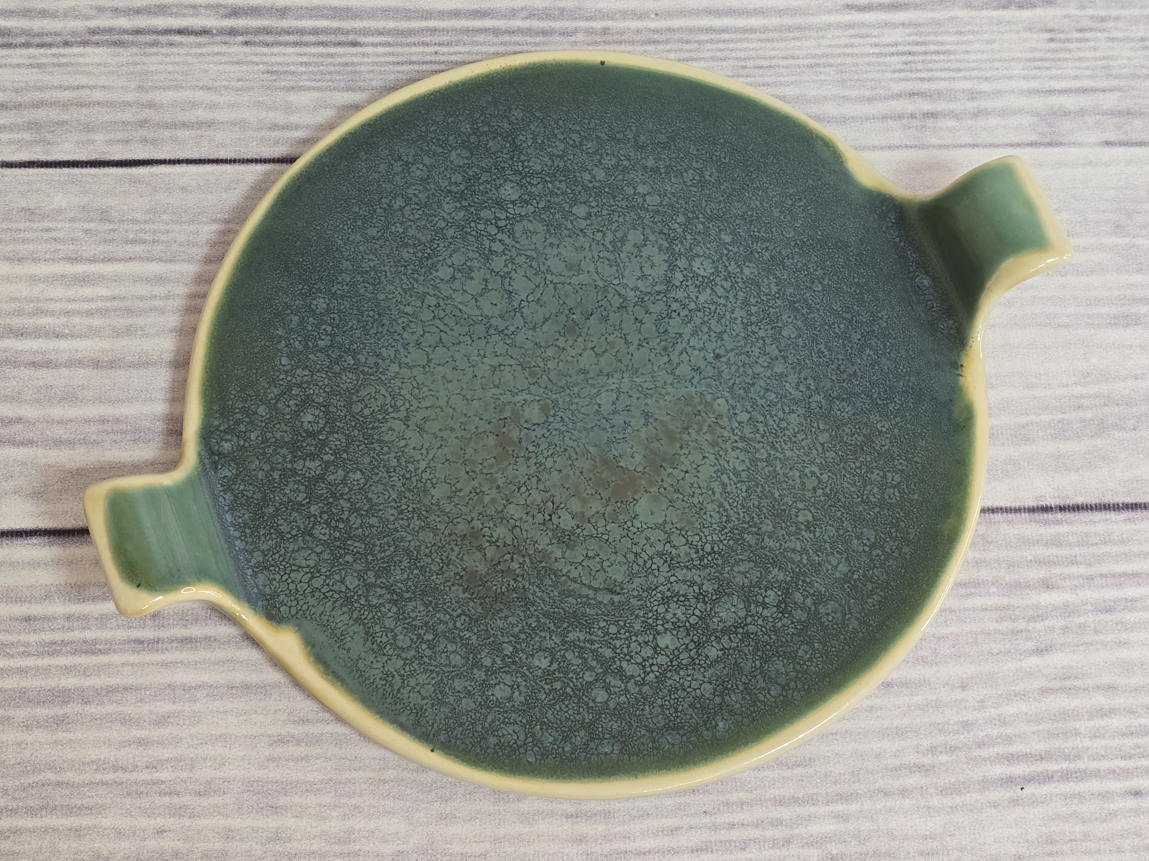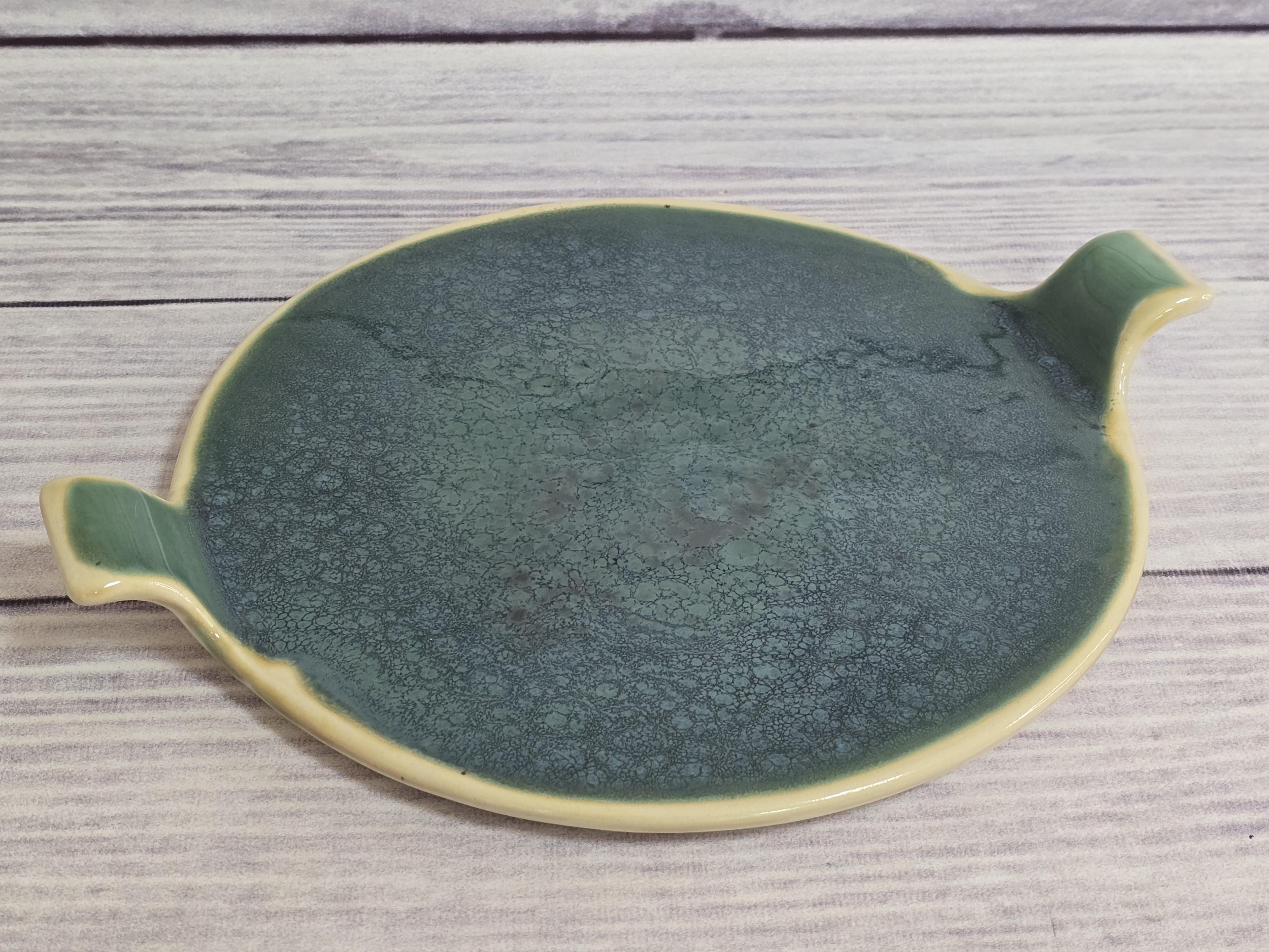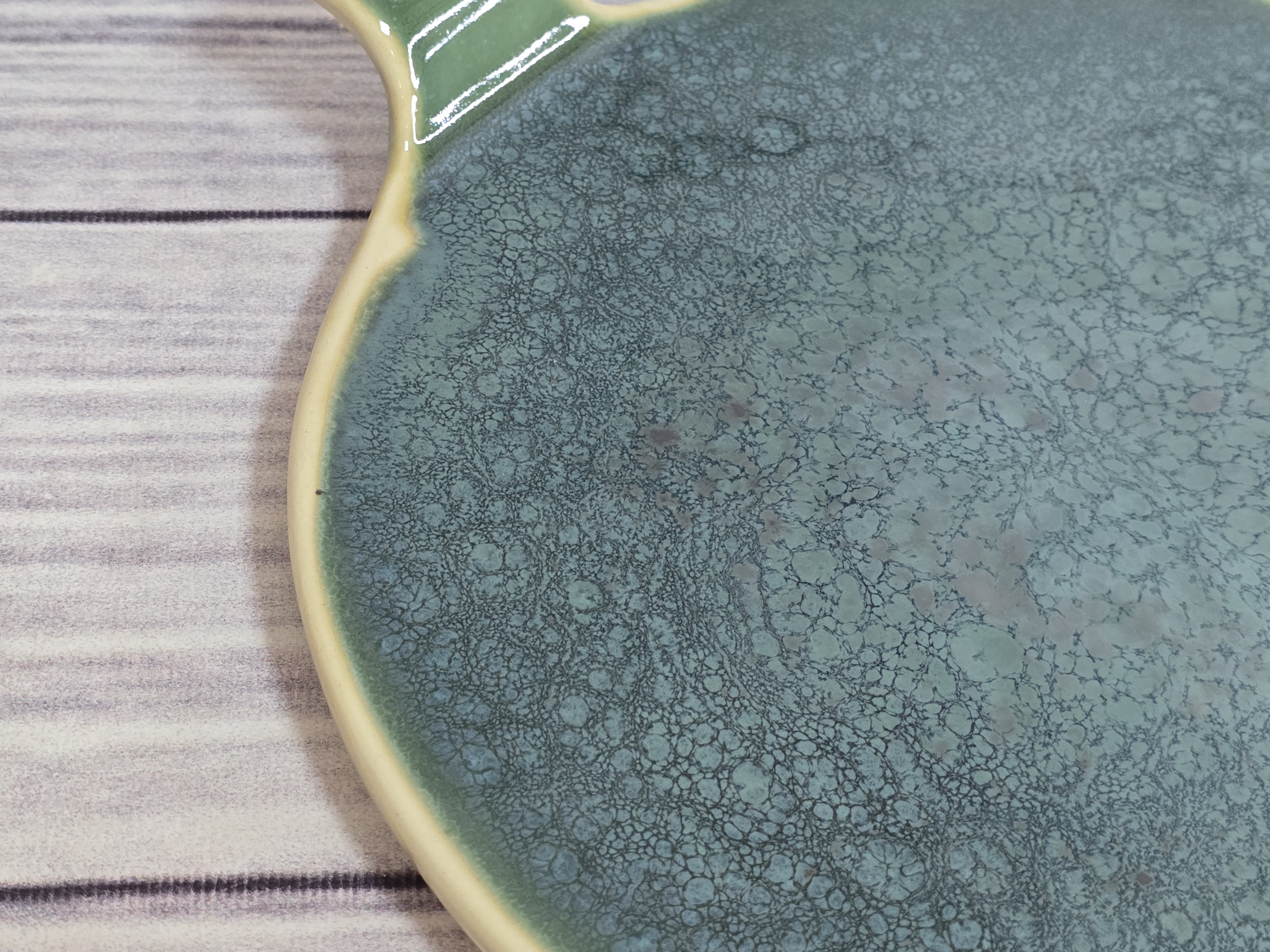 Фарфоровое блюдо для подачи сыра или другой нарезки. Стильное, удобное. Диаметр блюда без ручек - 25 см. Это довольно большая поверхность, на которой можно красиво разместить продукты. Пригодна для использования в посудомоечной машине и микроволновой печи. Зеркальная зеленая глянцевая поверхность на кремовом фоне с загадочными разводами, бликами и черными крапинами.