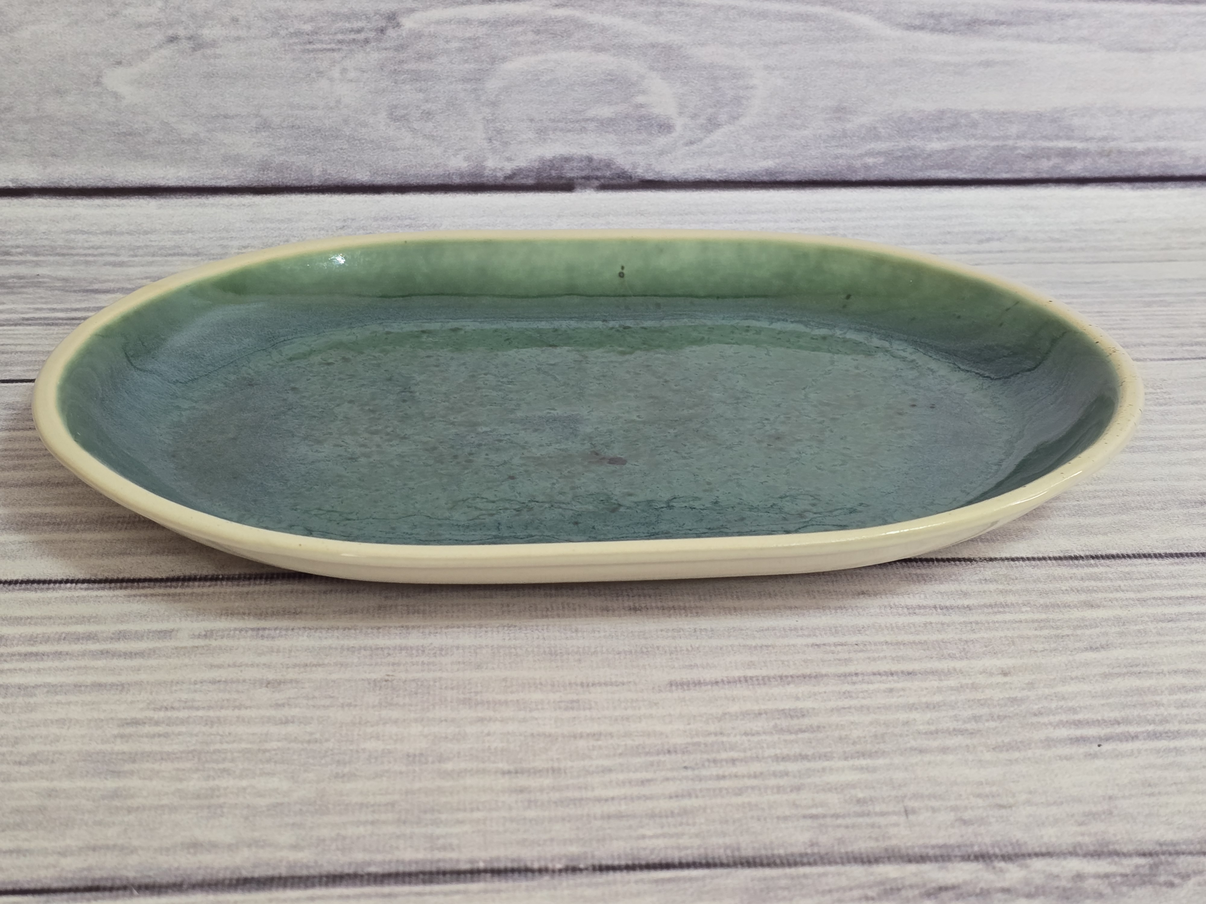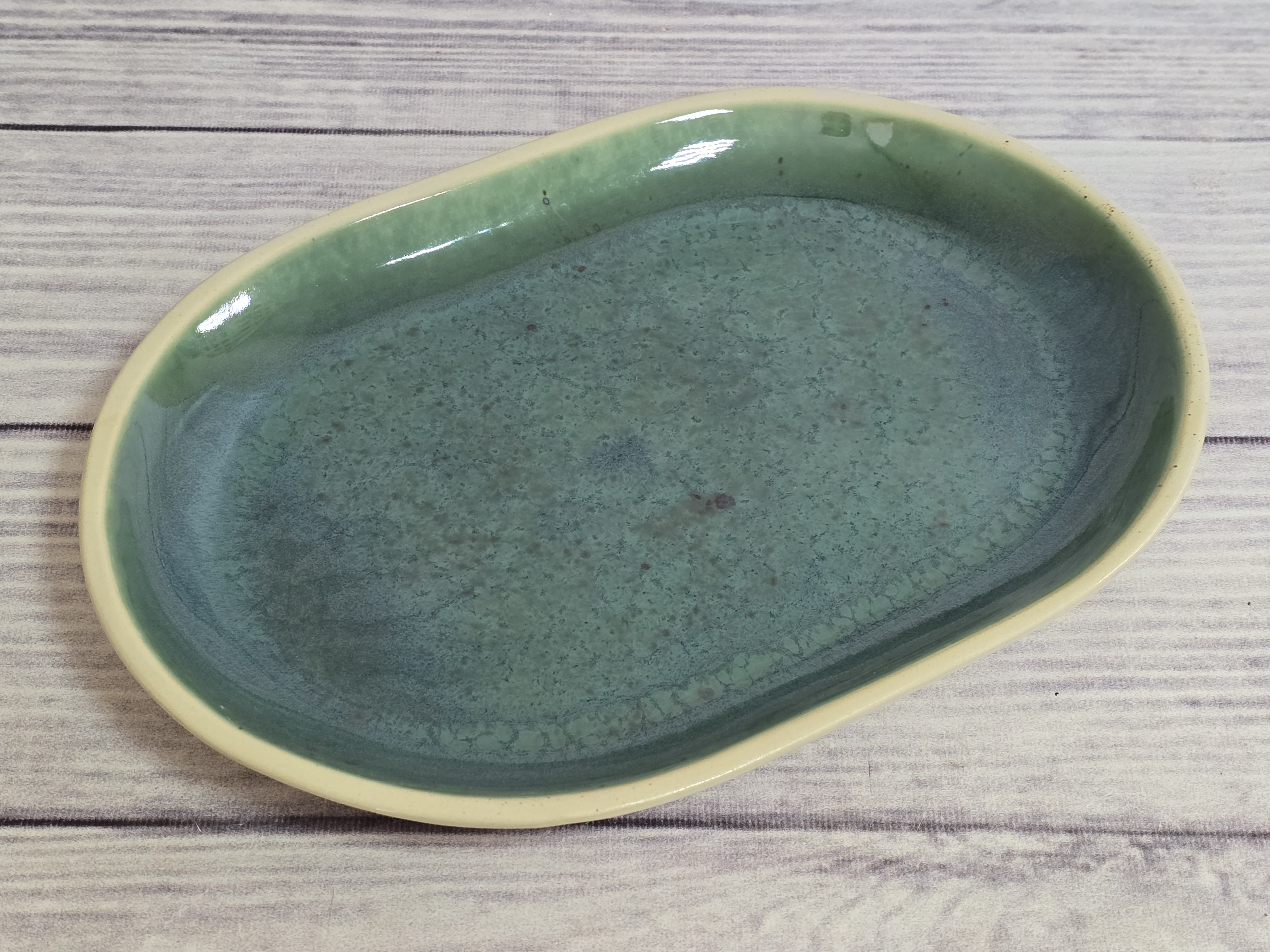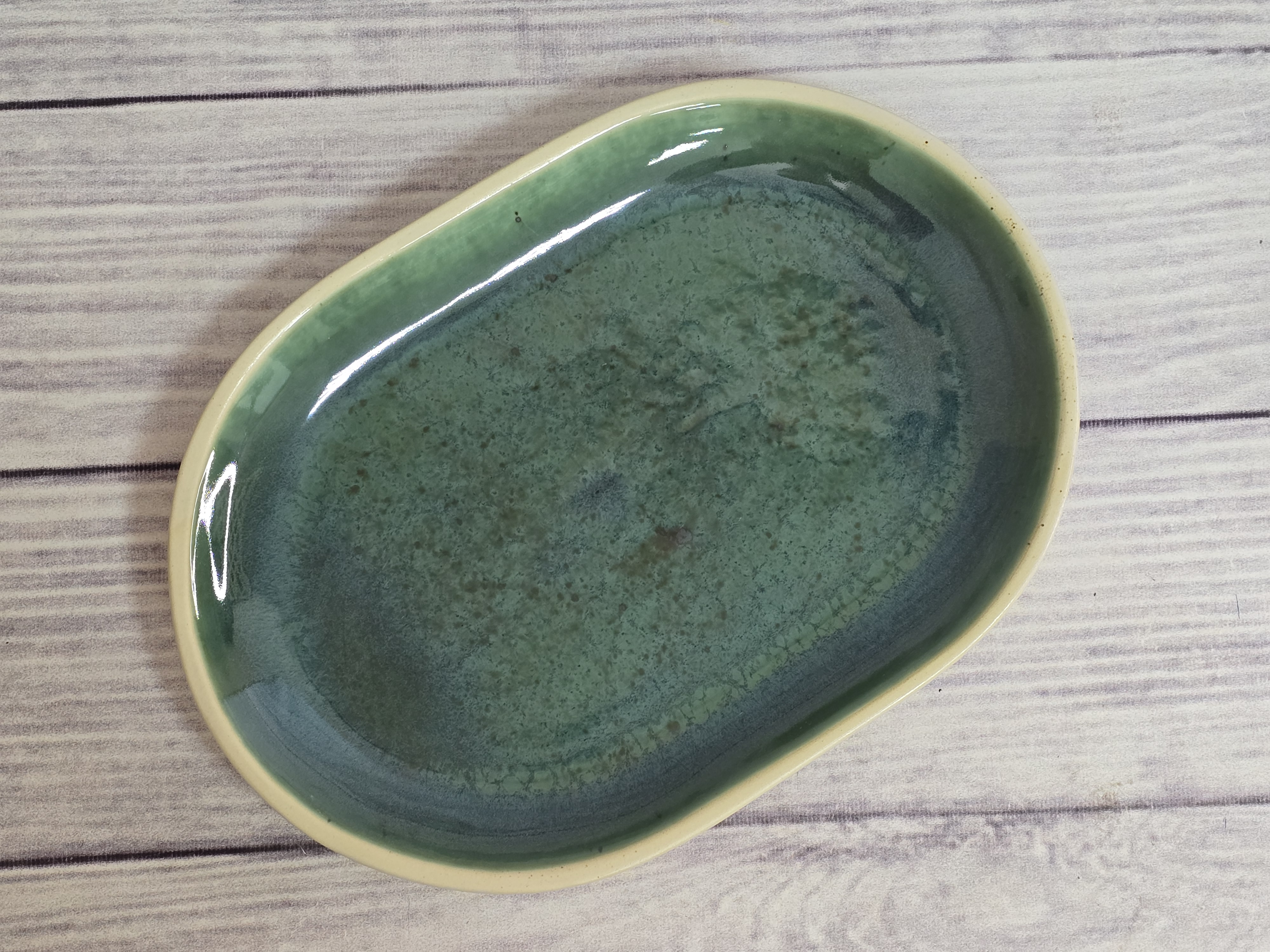 Отличное блюдо для подачи различных нарезок. Необычная форма блюда украсит трапезу и привнесёт в неё особые нотки новизны. Очень удобная и компактная форма. Красочно подать заливное из мяса или рыбы, шашлык или жареную птицу на шпажках помогут блюда овальной формы. Можно мыть в посудомоечной машине. Зеркальная зеленая глянцевая поверхность на кремовом фоне с загадочными разводами, бликами и черными крапинами.