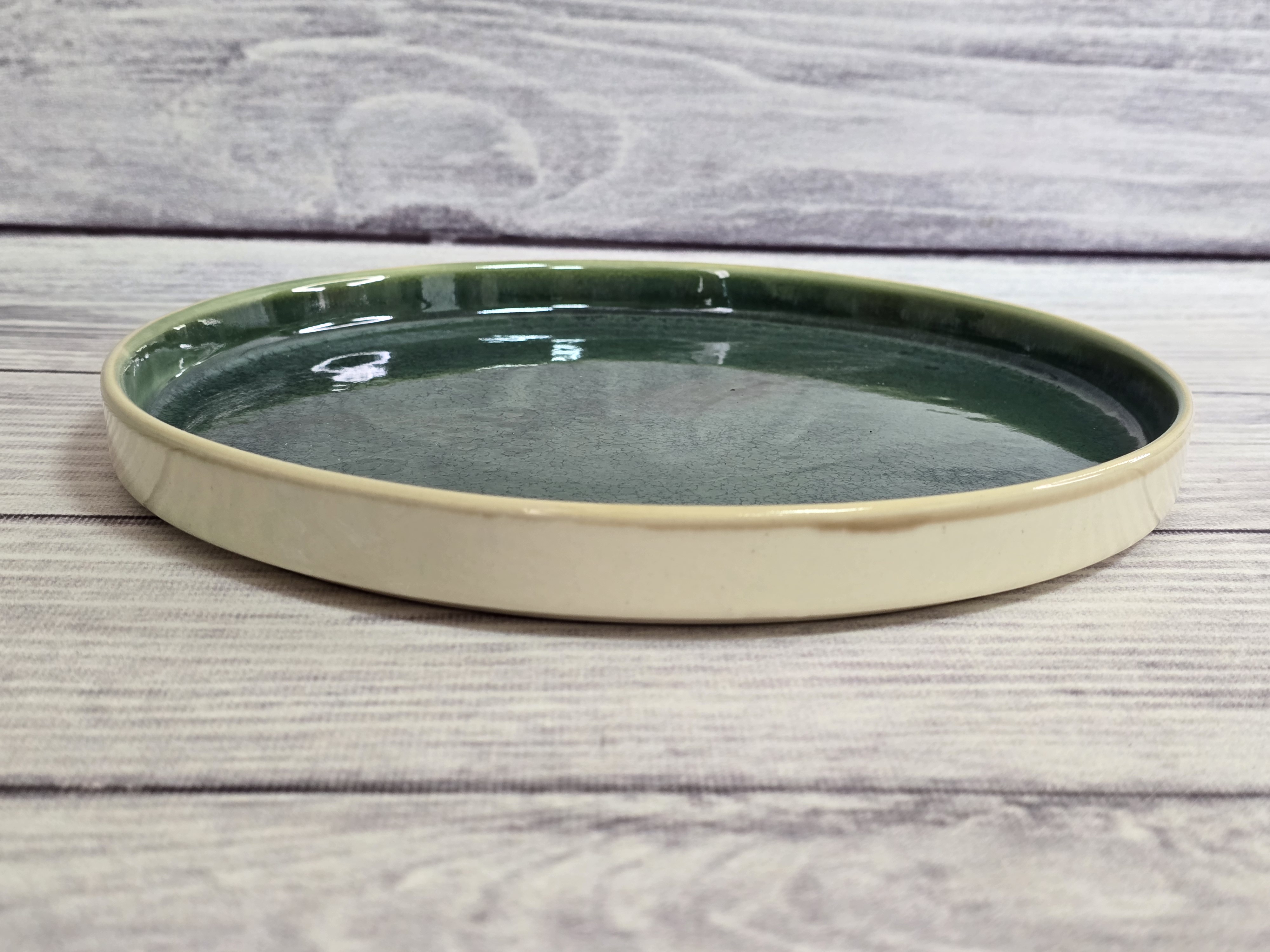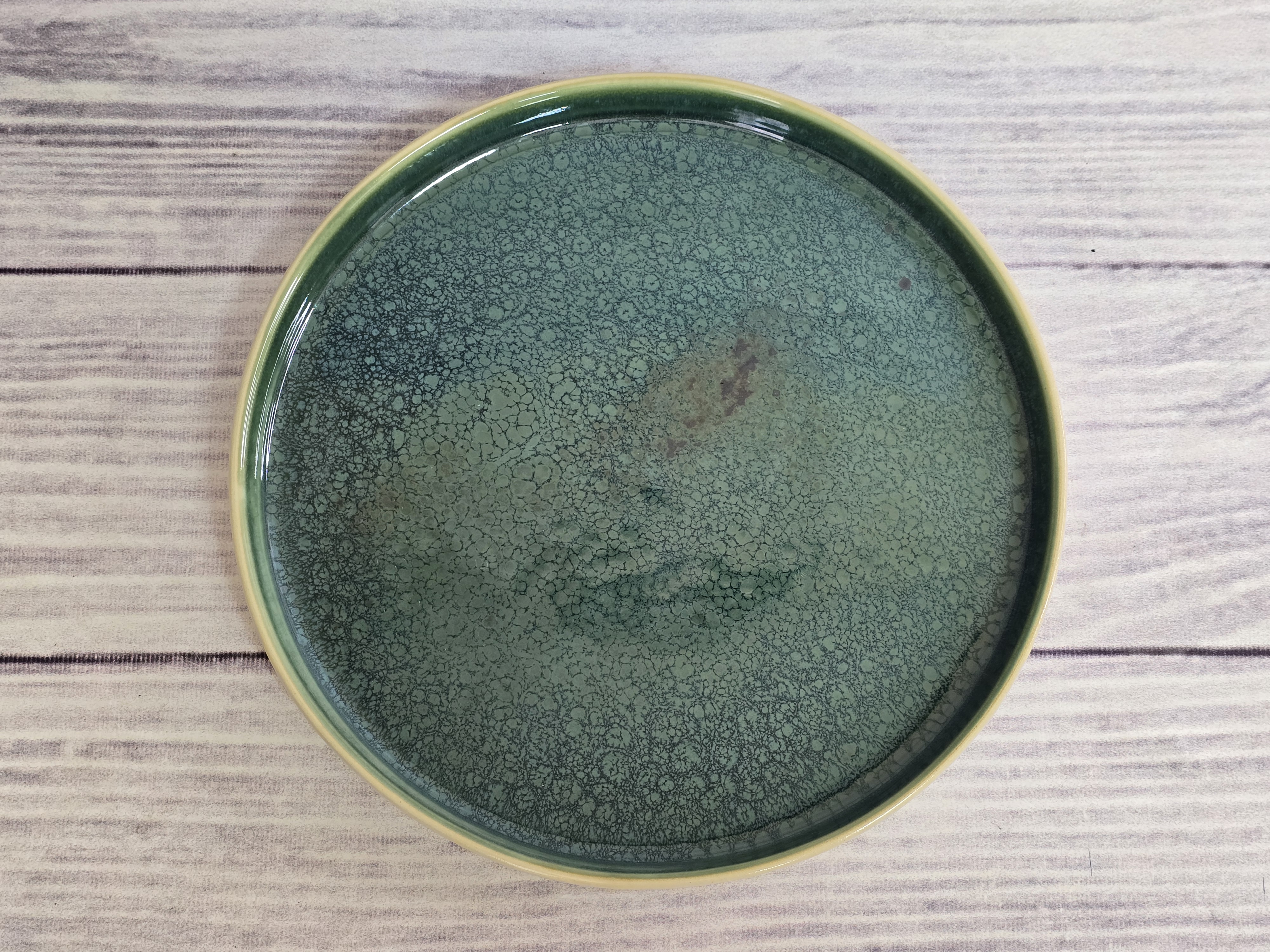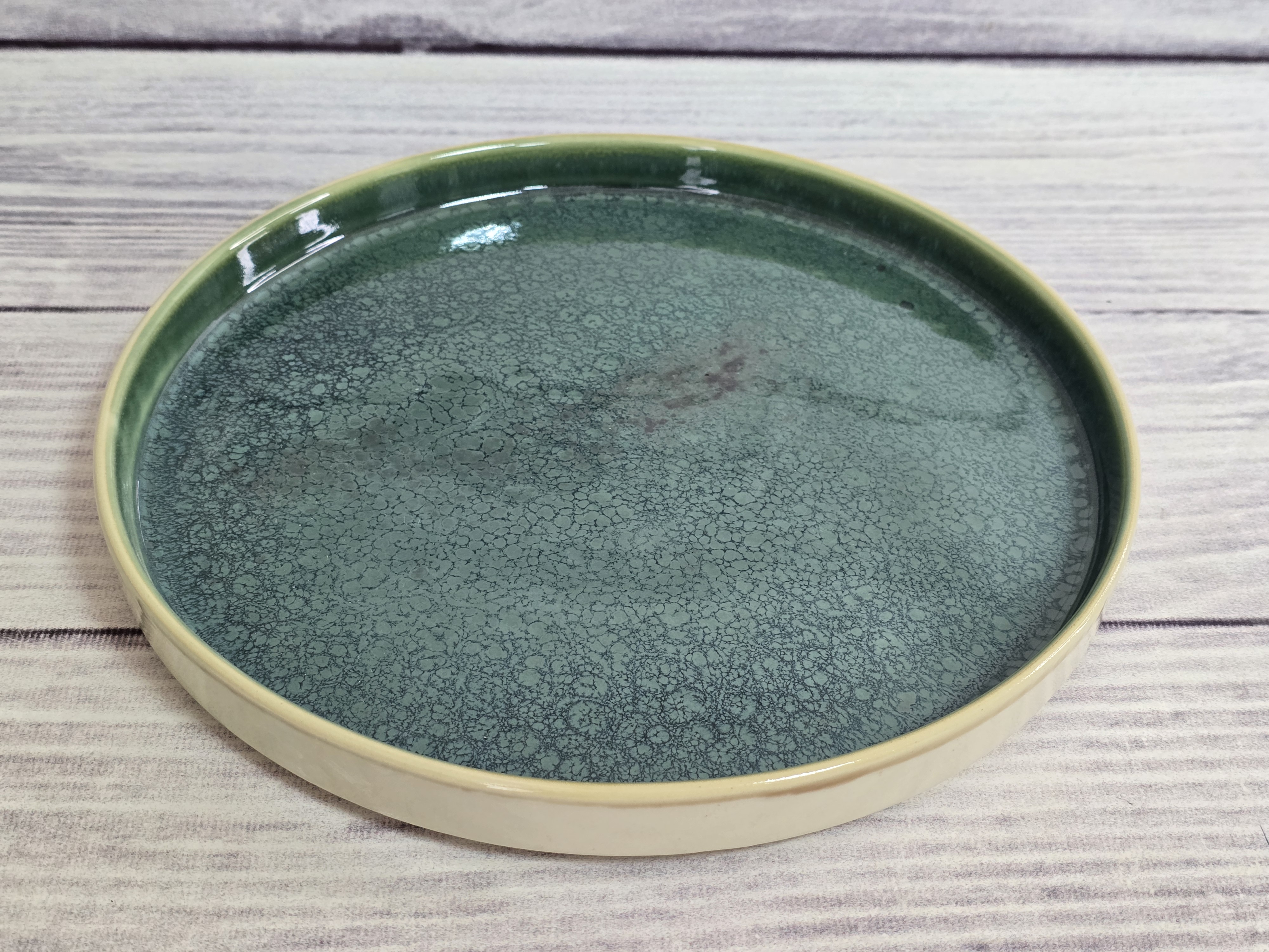 Наша тарелка идеально подходит для размещения сыров, закусок и нарезки, подачи или приготовления пиццы. Модная форма помогает красиво подать разнообразные кулинарные шедевры. Зеркальная зеленая глянцевая поверхность на кремовом фоне с загадочными разводами, бликами и черными крапинами.