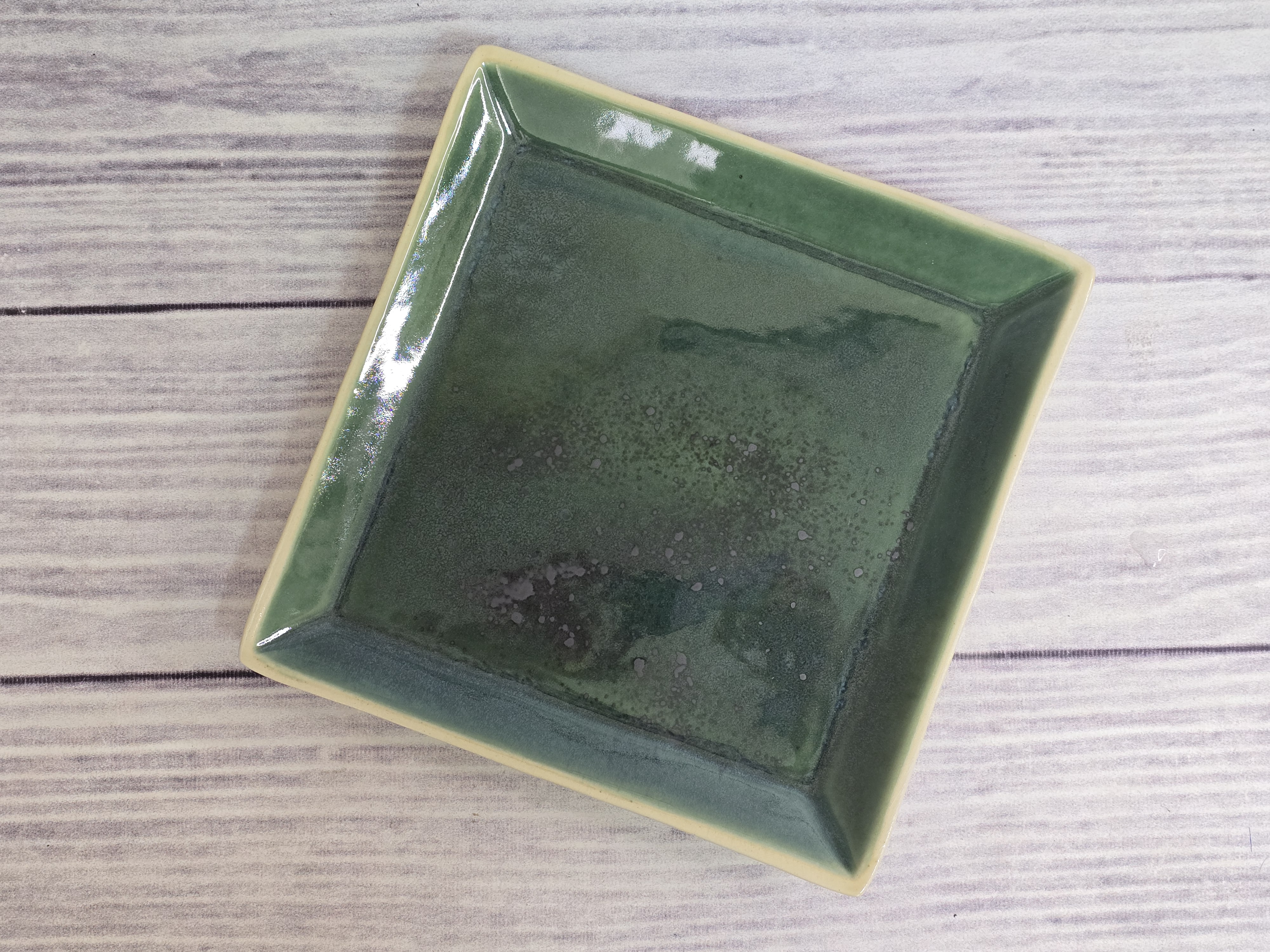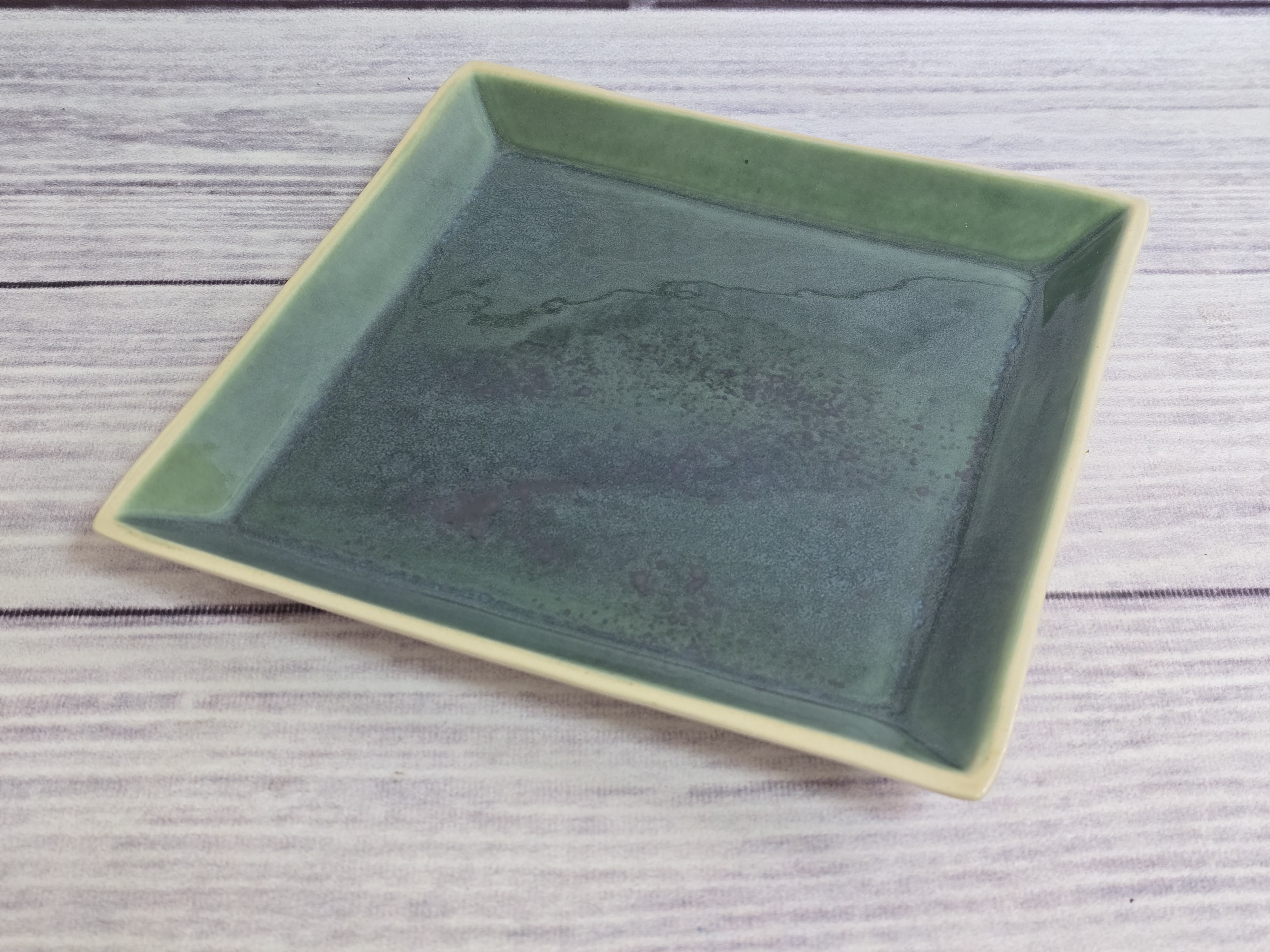 Большое блюдо квадратной формы. Такая форма практична, позволяет экономить место как при хранении так и при сервировке стола, блюда, поданные на таких тарелках, выглядят аппетитно и оригинально. Зеркальная зеленая глянцевая поверхность на кремовом фоне с загадочными разводами, бликами и черными крапинами.