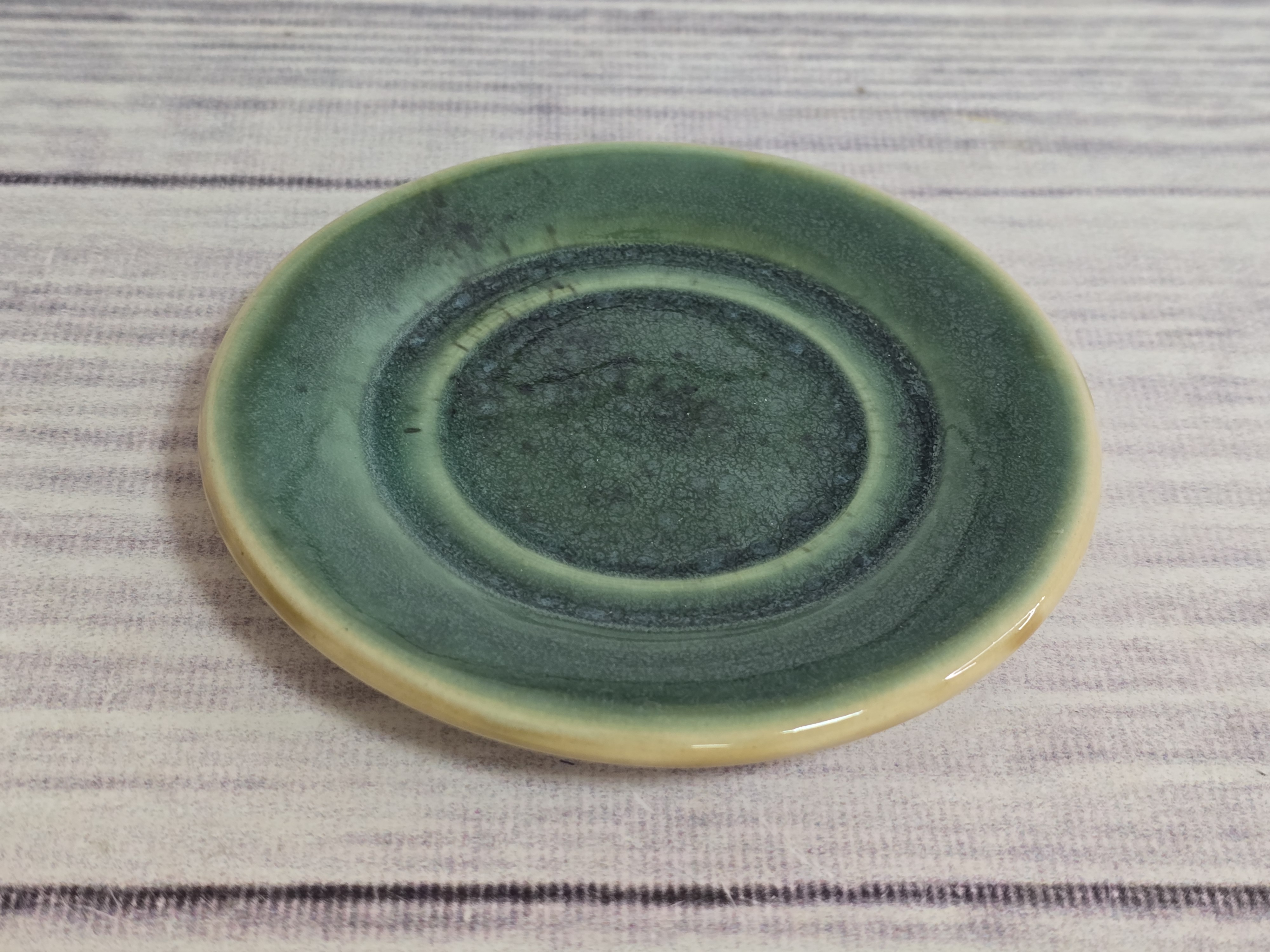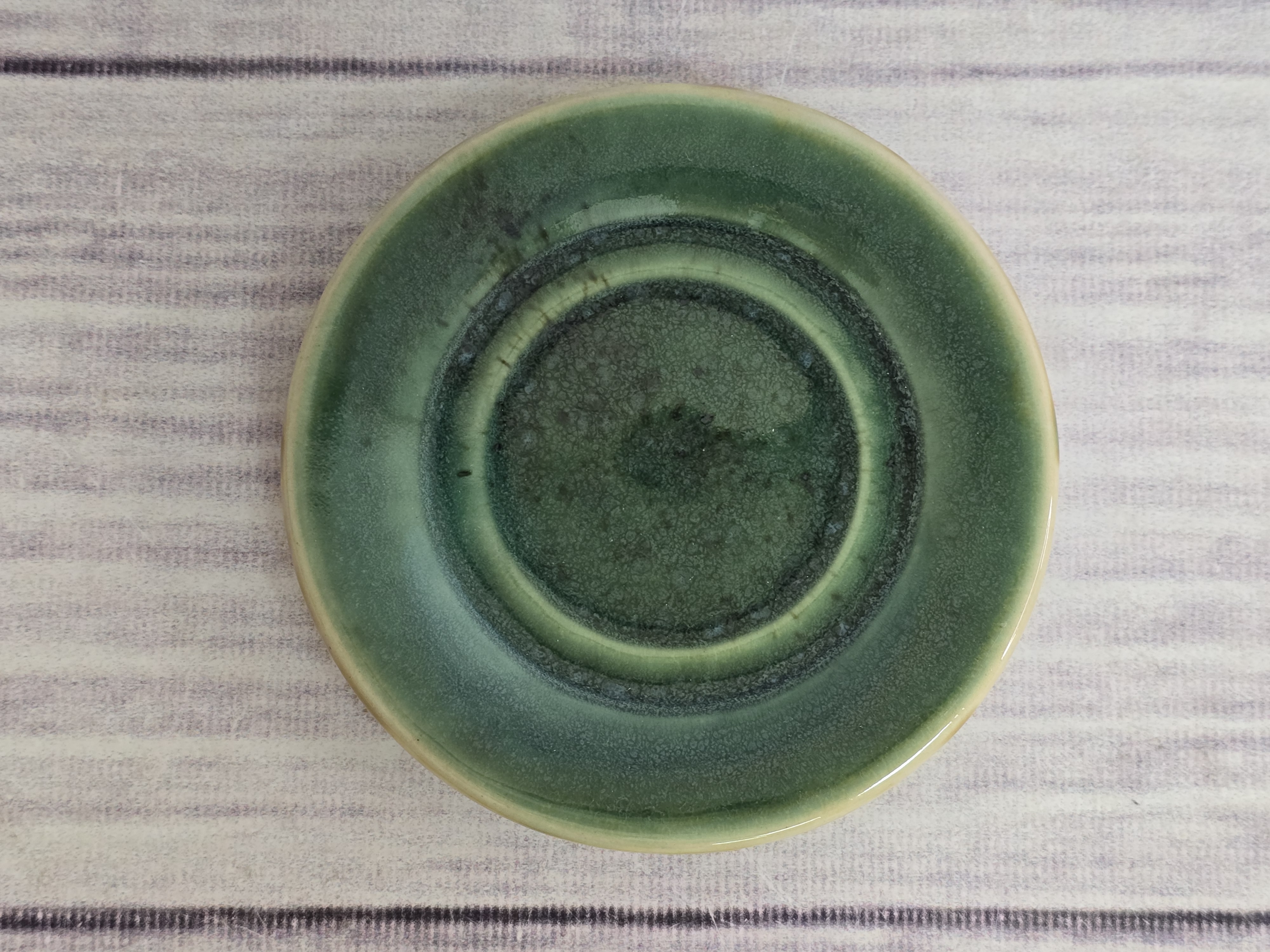 Универсальное малое блюдце для сервировки, может использоваться как подставка под чашку. Специальные бортики предотвращают соскальзывание чашки. Кроме того, эти маленькие тарелочки прекрасно украсят ваш стол. Зеркальная зеленая глянцевая поверхность на кремовом фоне с загадочными разводами, бликами и черными крапинами.