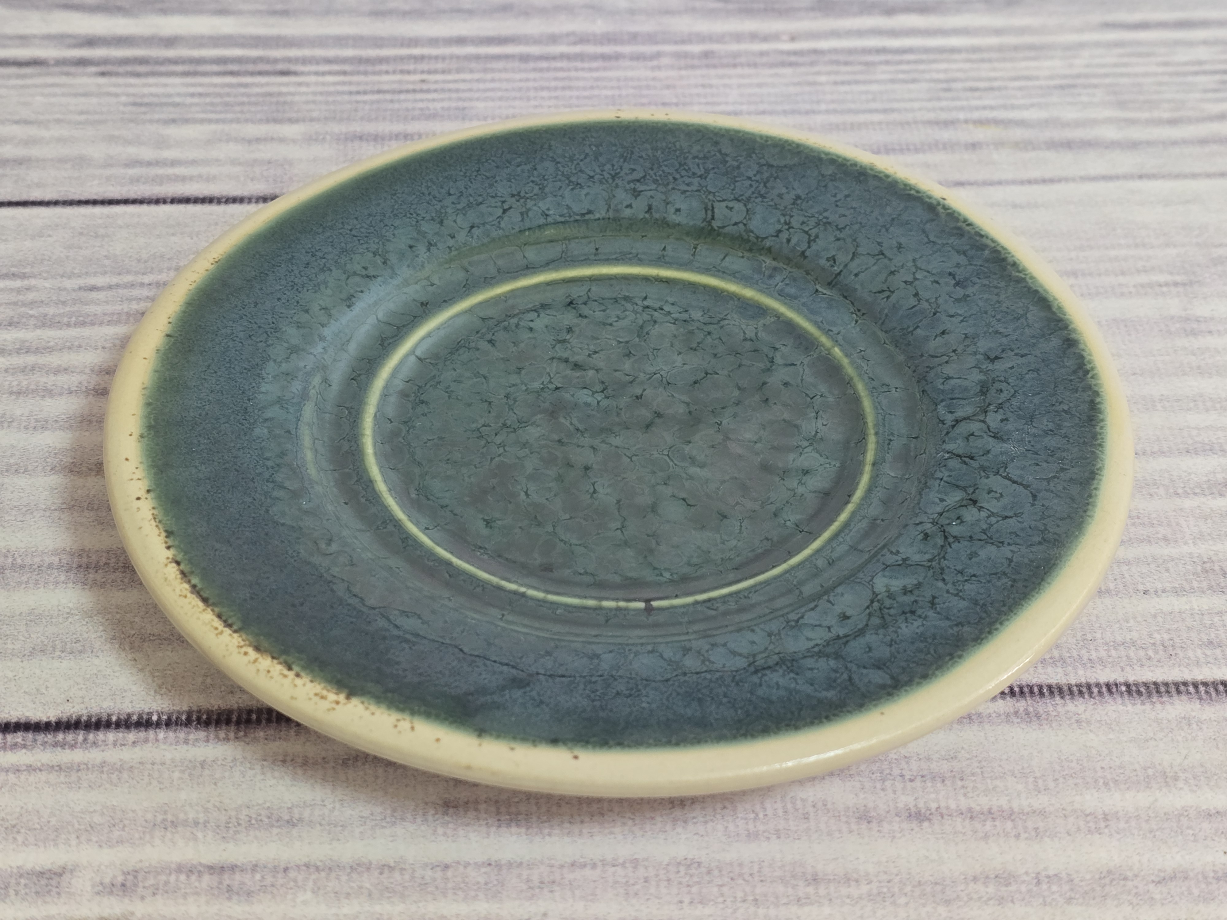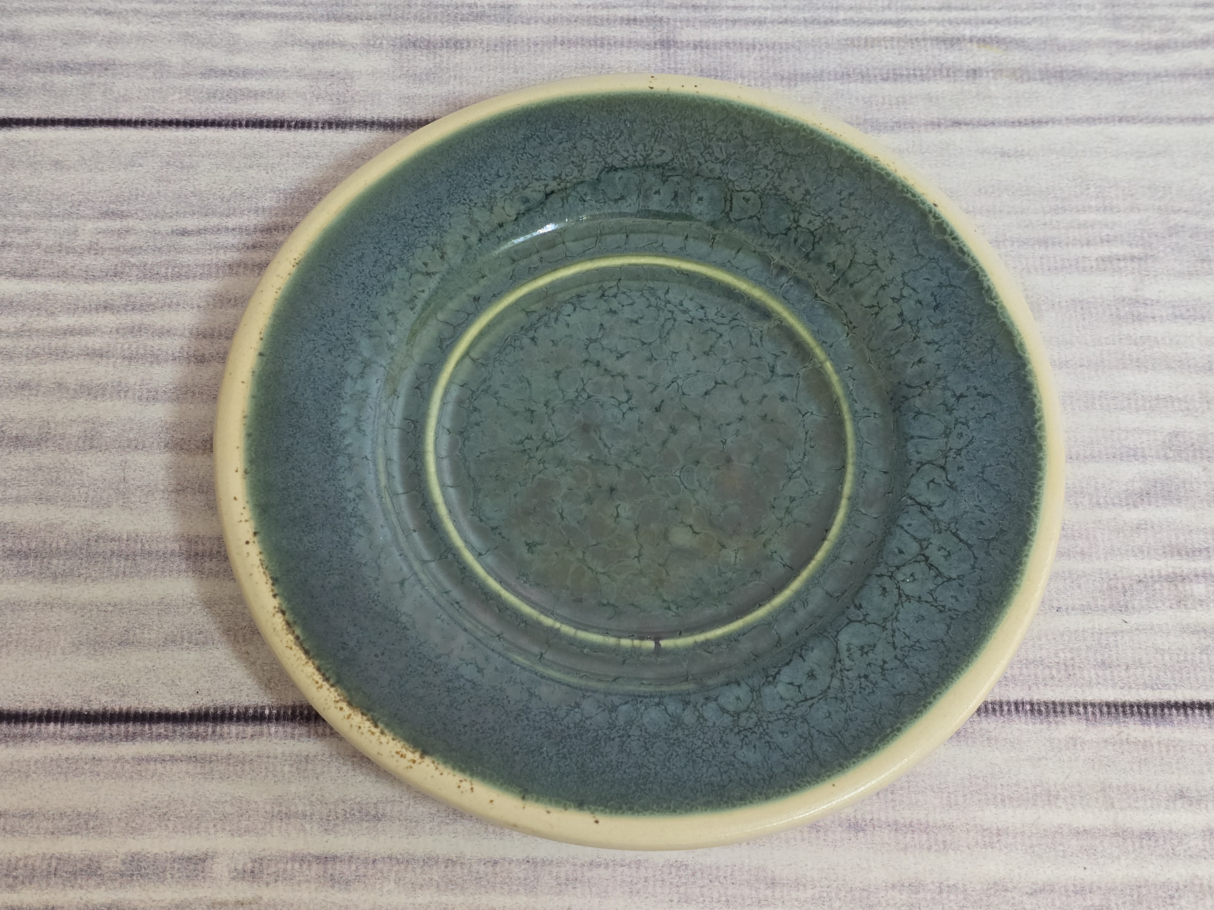 Универсальное блюдце для сервировки, может использоваться как подставка под чашку и бульонницу. Специальные бортики предотвращают соскальзывание чашки. Зеркальная зеленая глянцевая поверхность на кремовом фоне с загадочными разводами, бликами и черными крапинами.