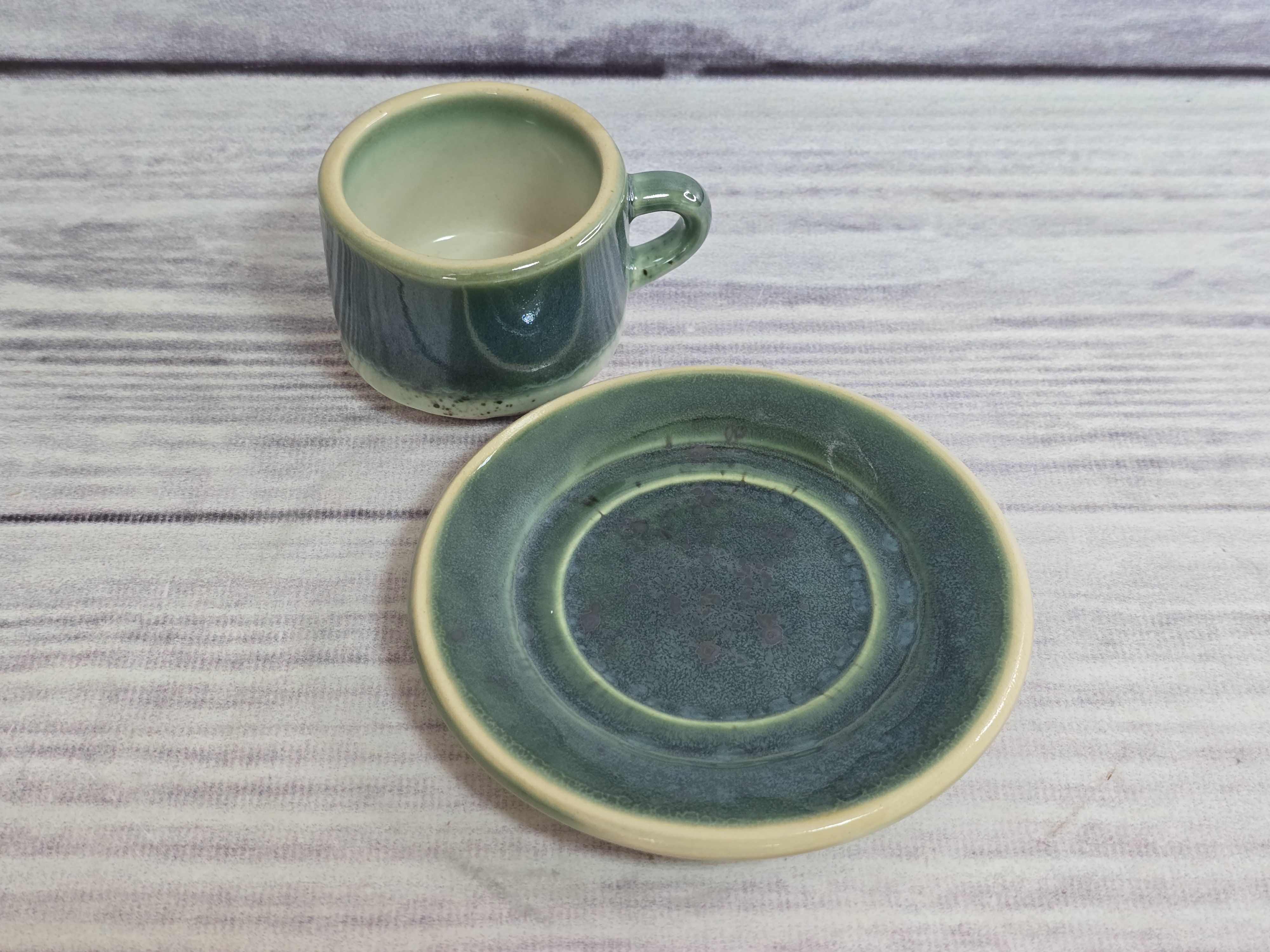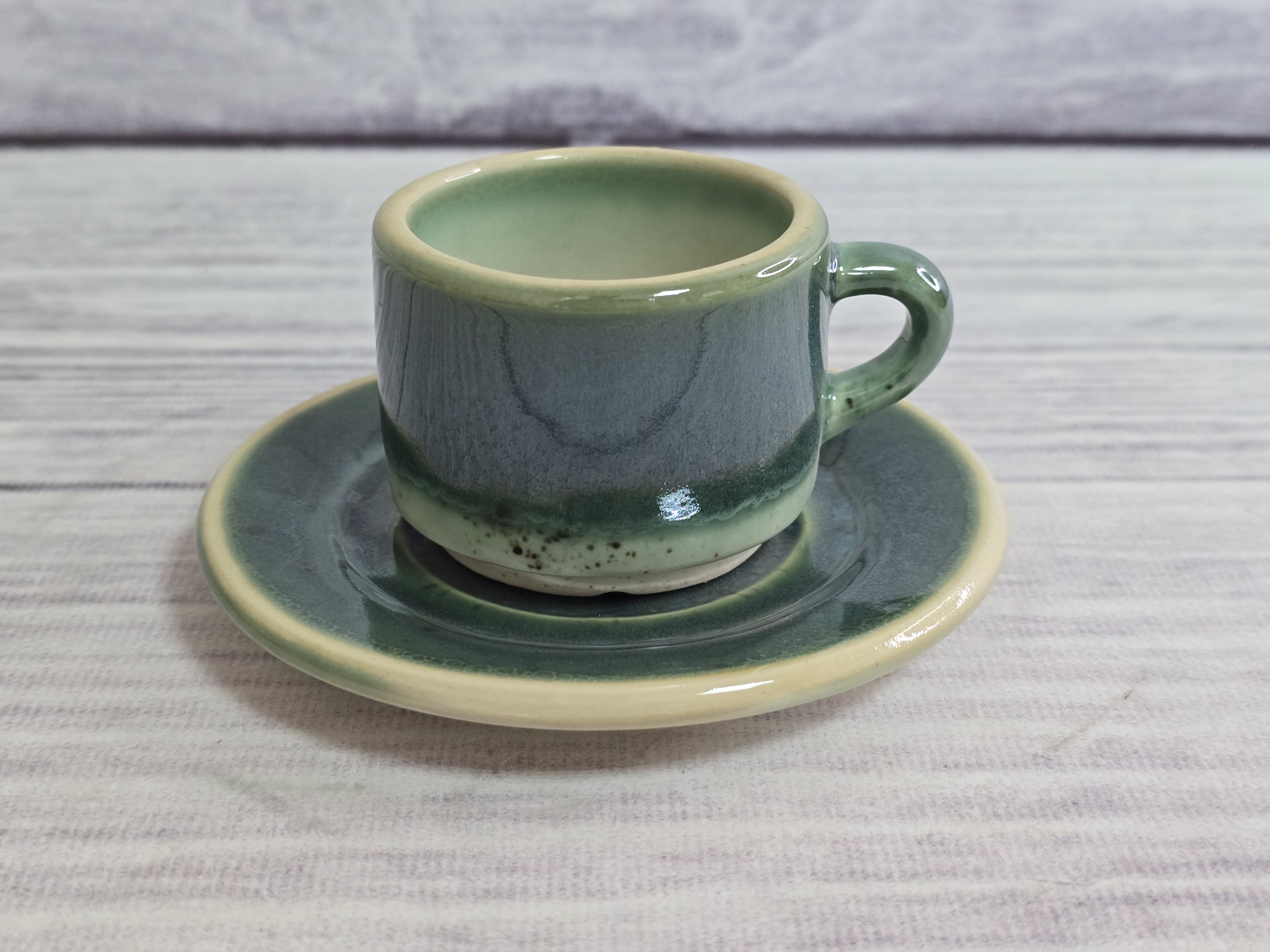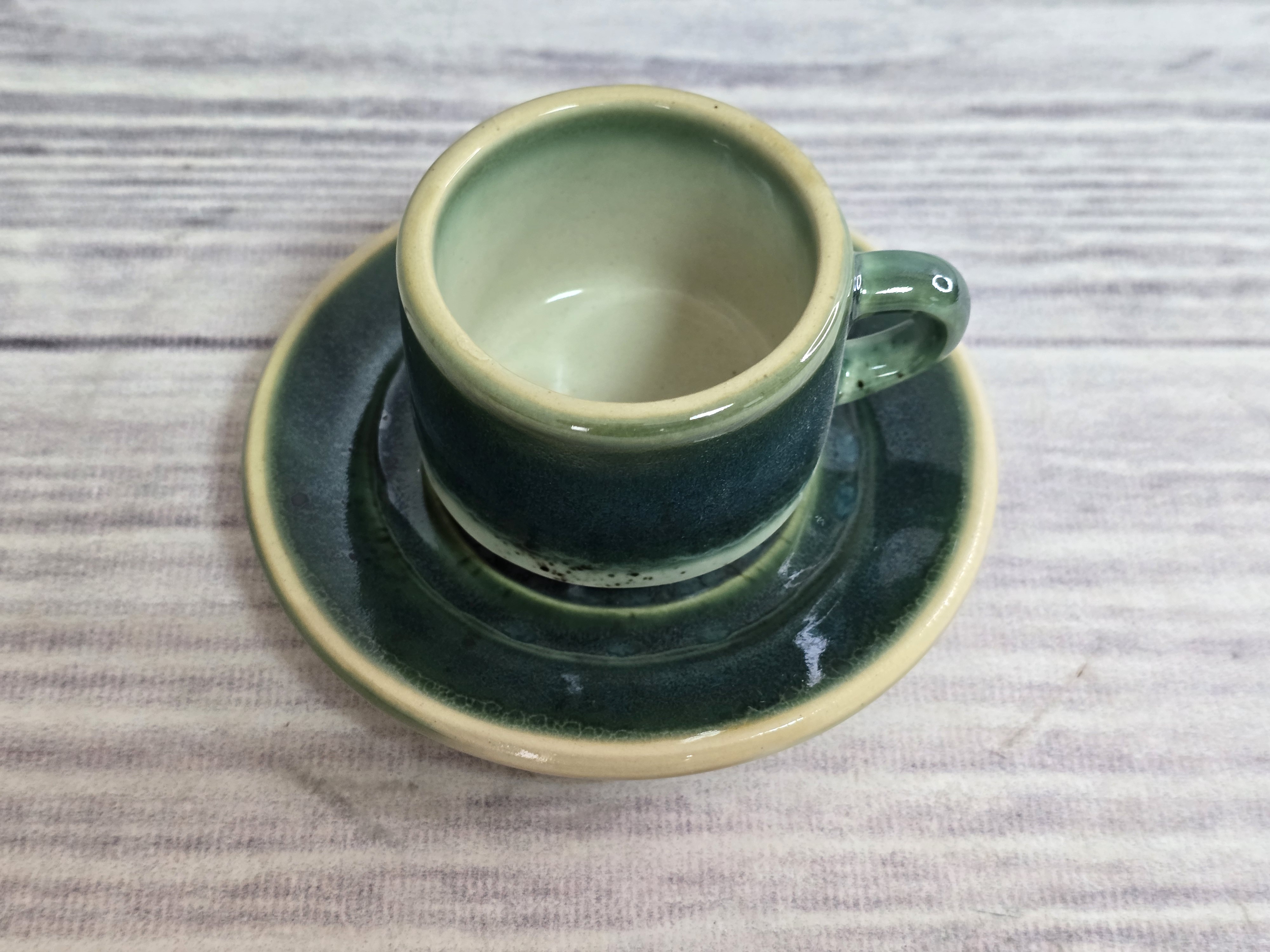 Оригинальная штабелируемая чашка с блюдцем. Идеально подойдет для подачи как эспрессо, так и чая. Штабелируется и экономит место. Пригодна для использования в посудомоечной машине и микроволновой печи. Зеркальная зеленая глянцевая поверхность на кремовом фоне с загадочными разводами, бликами и черными крапинами.