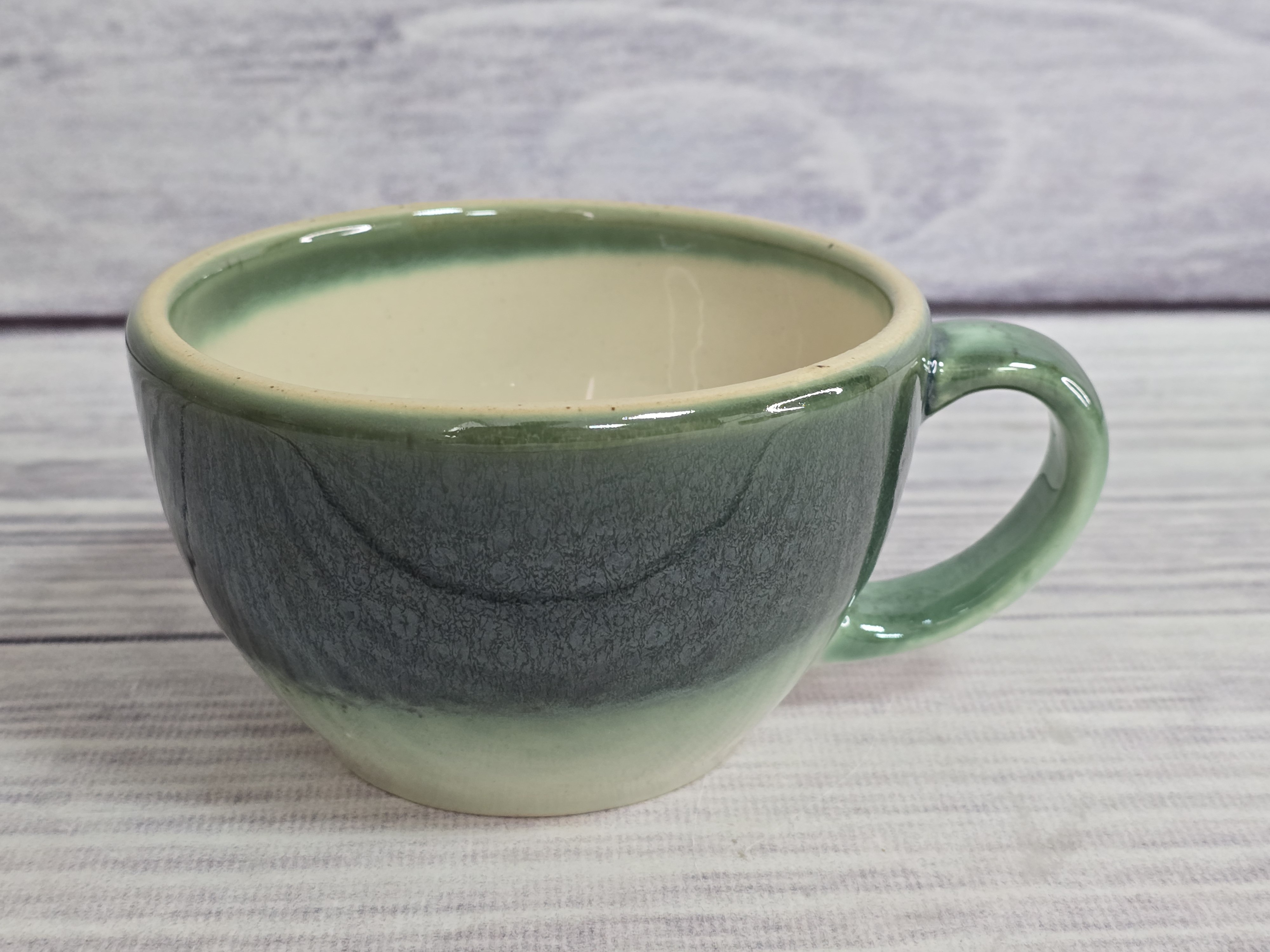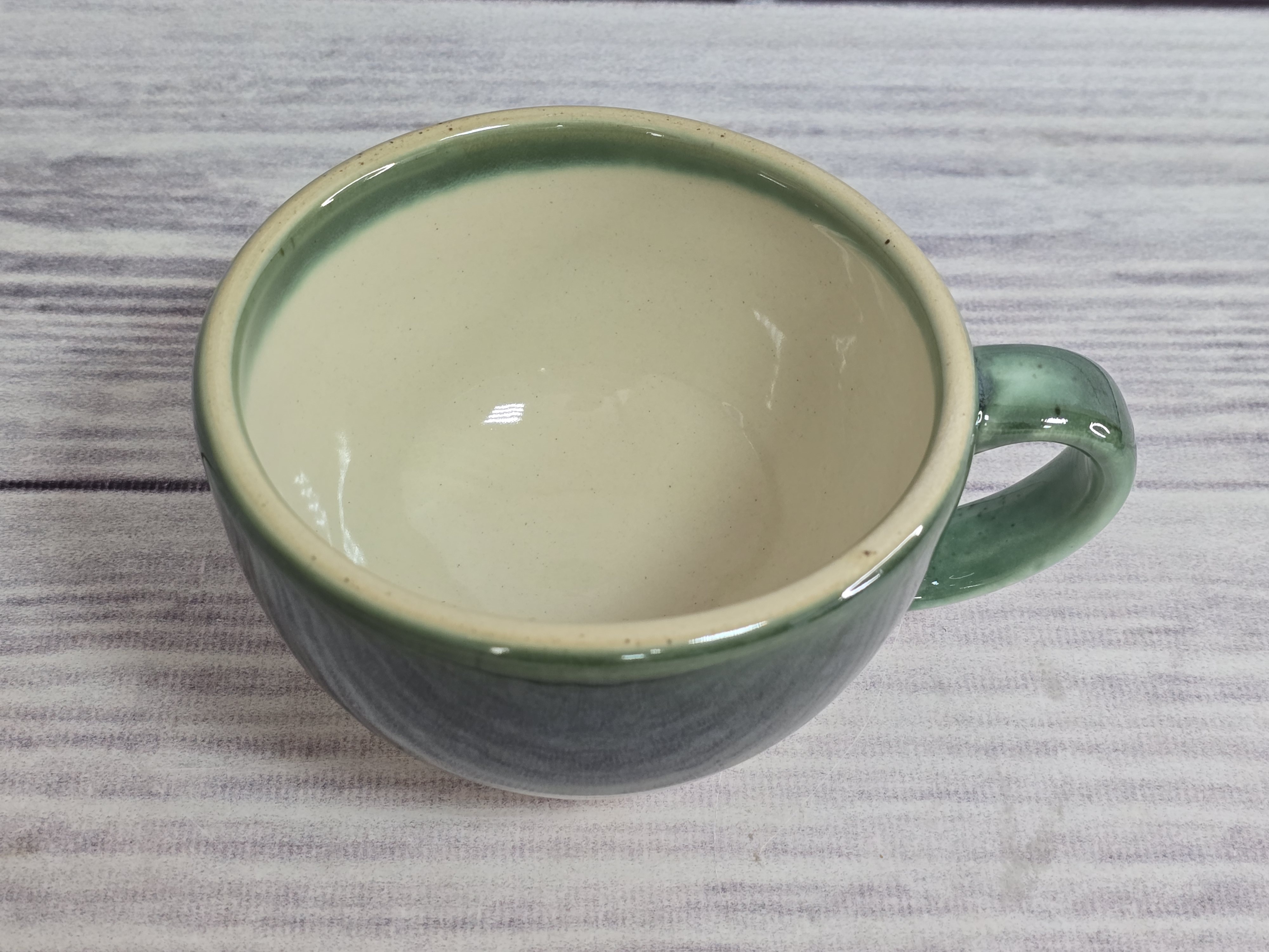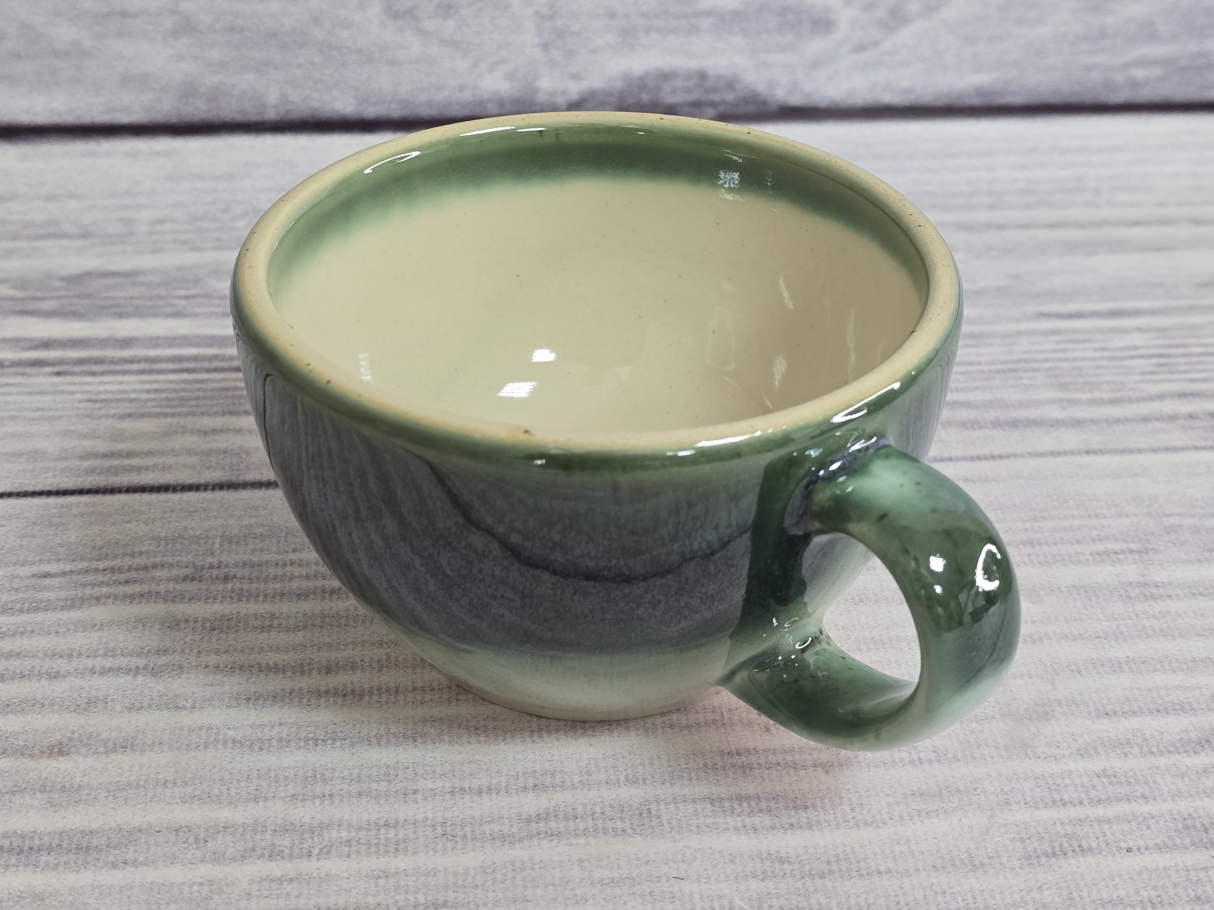 Чашка имеет округлую форму, она очень удобна в использовании. Чашка выполнена из фарфора и обладает отличным качеством, хорошо сохраняет тепло и смотрится очень элегантно и эстетично. Предназначена для подачи горячих и холодных напитков. Зеркальная зеленая глянцевая поверхность на кремовом фоне с загадочными разводами, бликами и черными крапинами.
