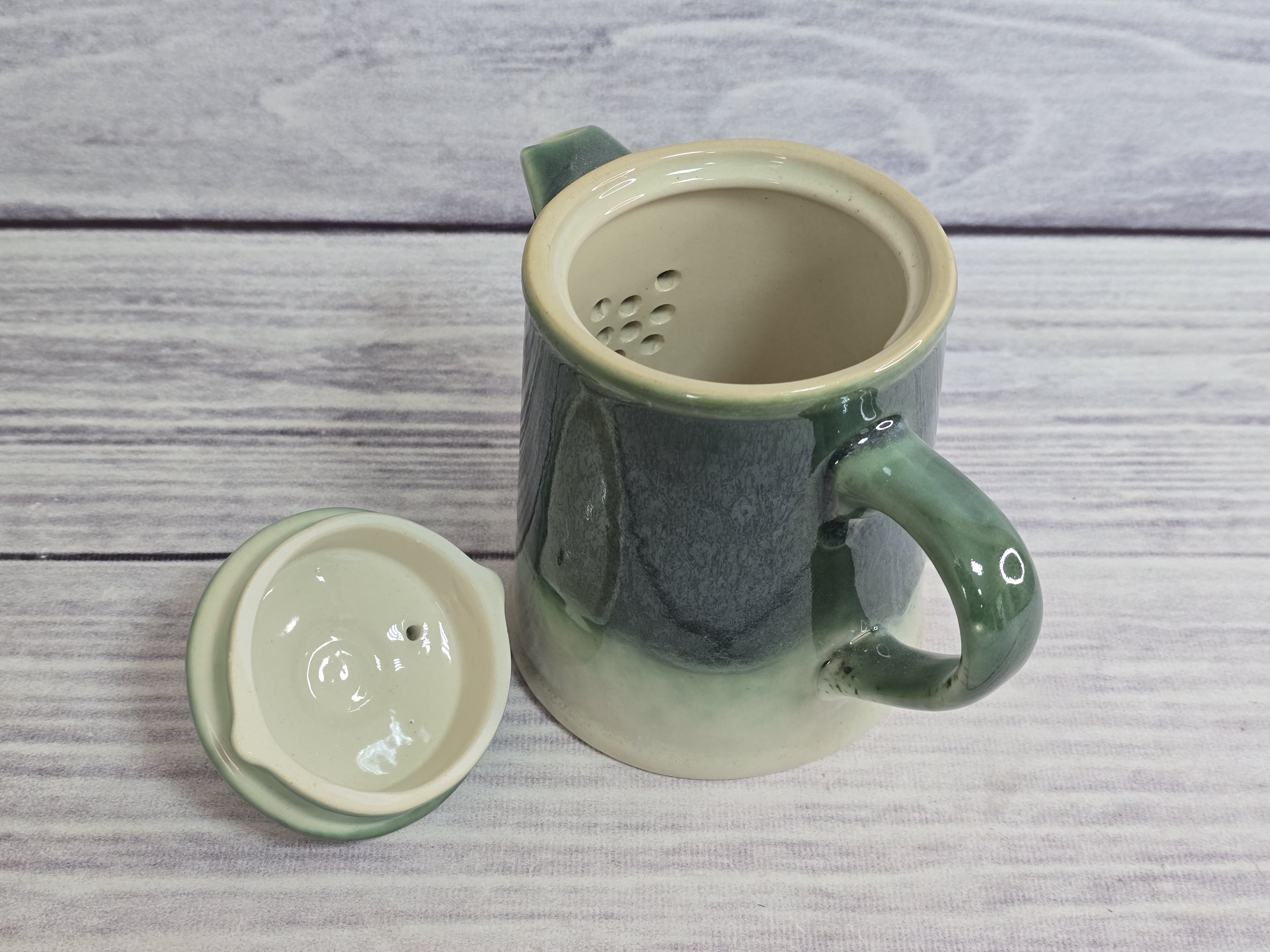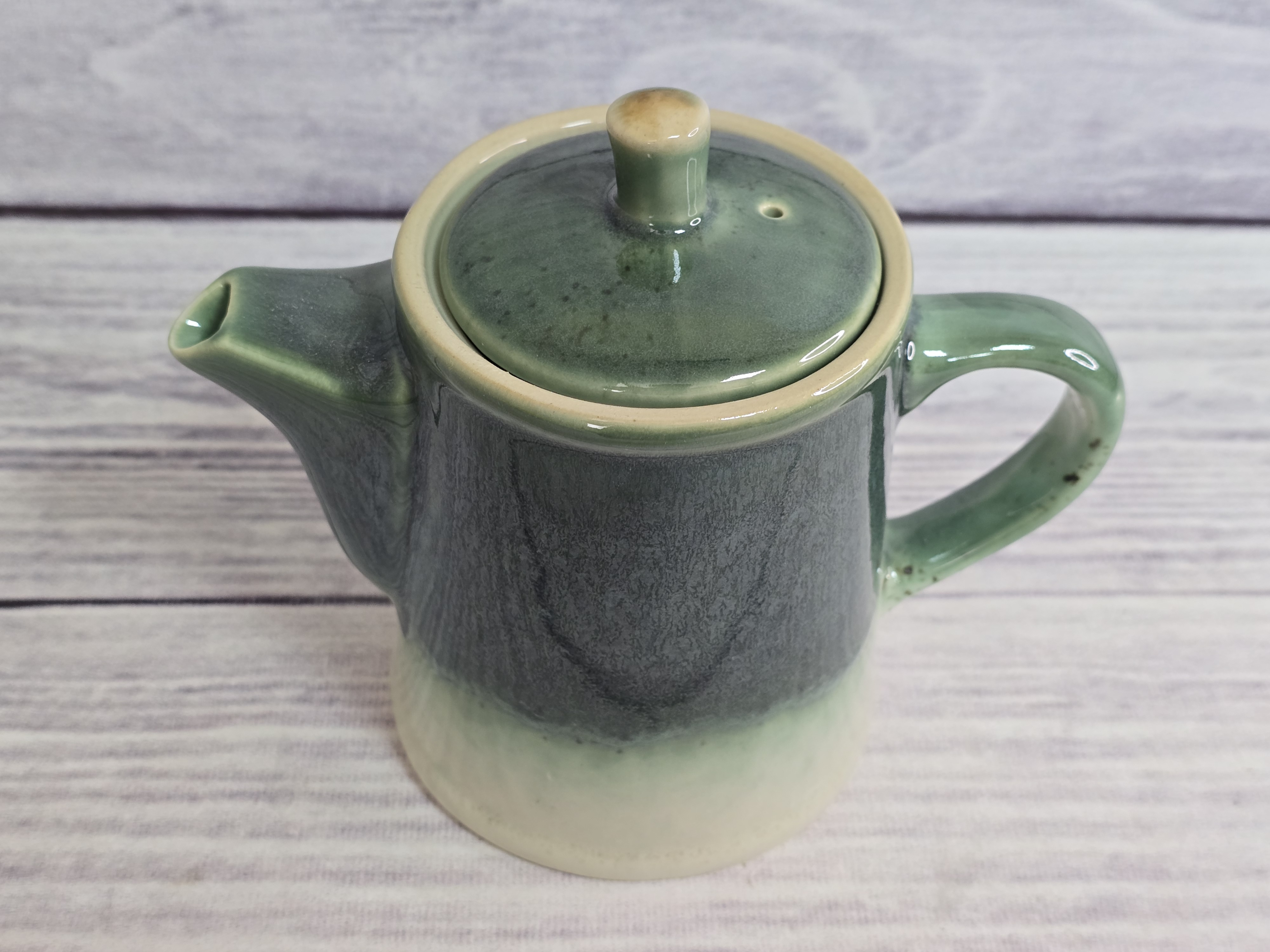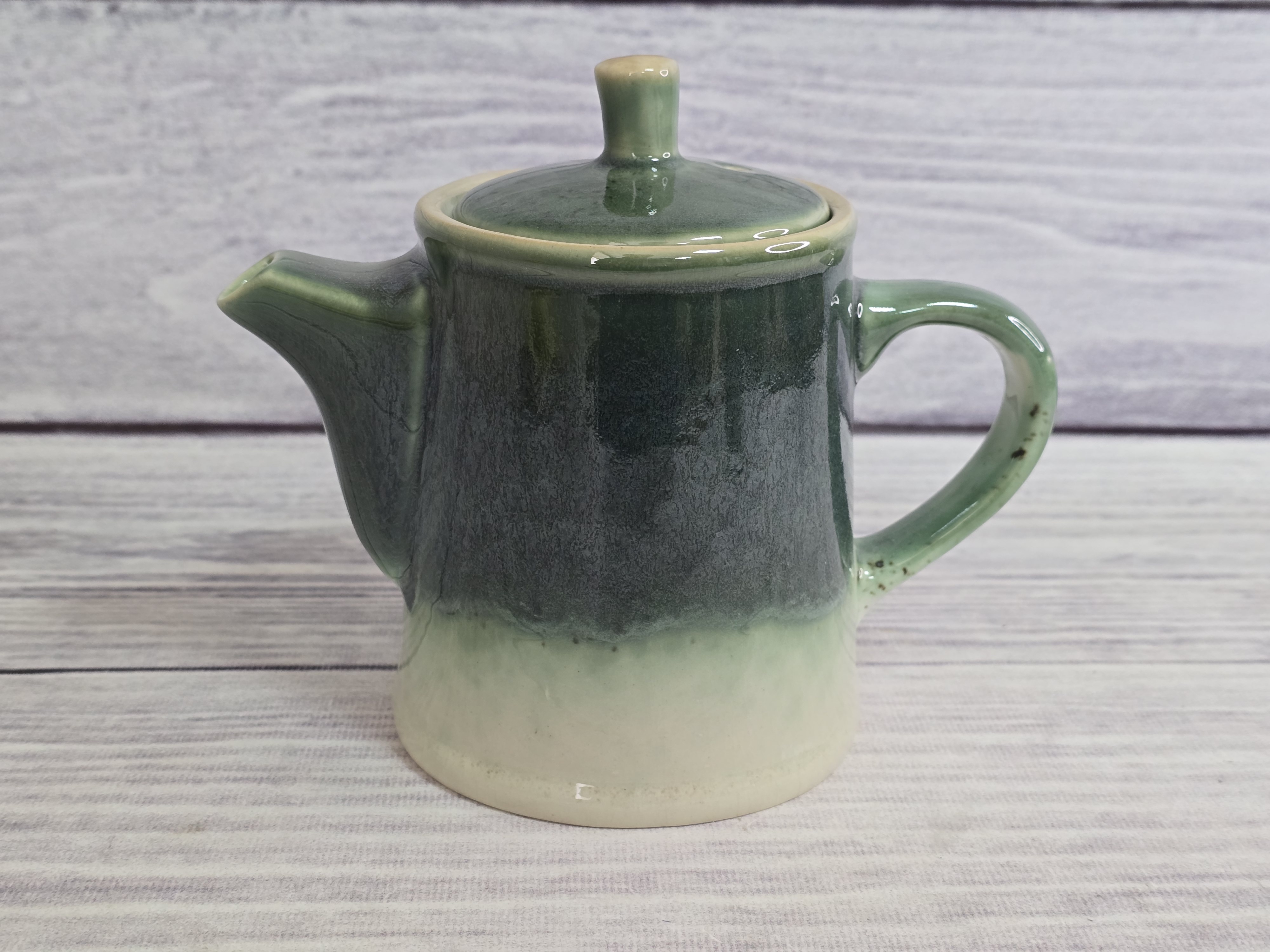 Чайник с большой удобной ручкой и с замком на крышке. Внутри имеются дырочки, которые препятствуют попаданию заварки в чашку. Пригоден для использования в посудомоечной машине и микроволновой печи. Зеркальная зеленая глянцевая поверхность на кремовом фоне с загадочными разводами, бликами и черными крапинами.