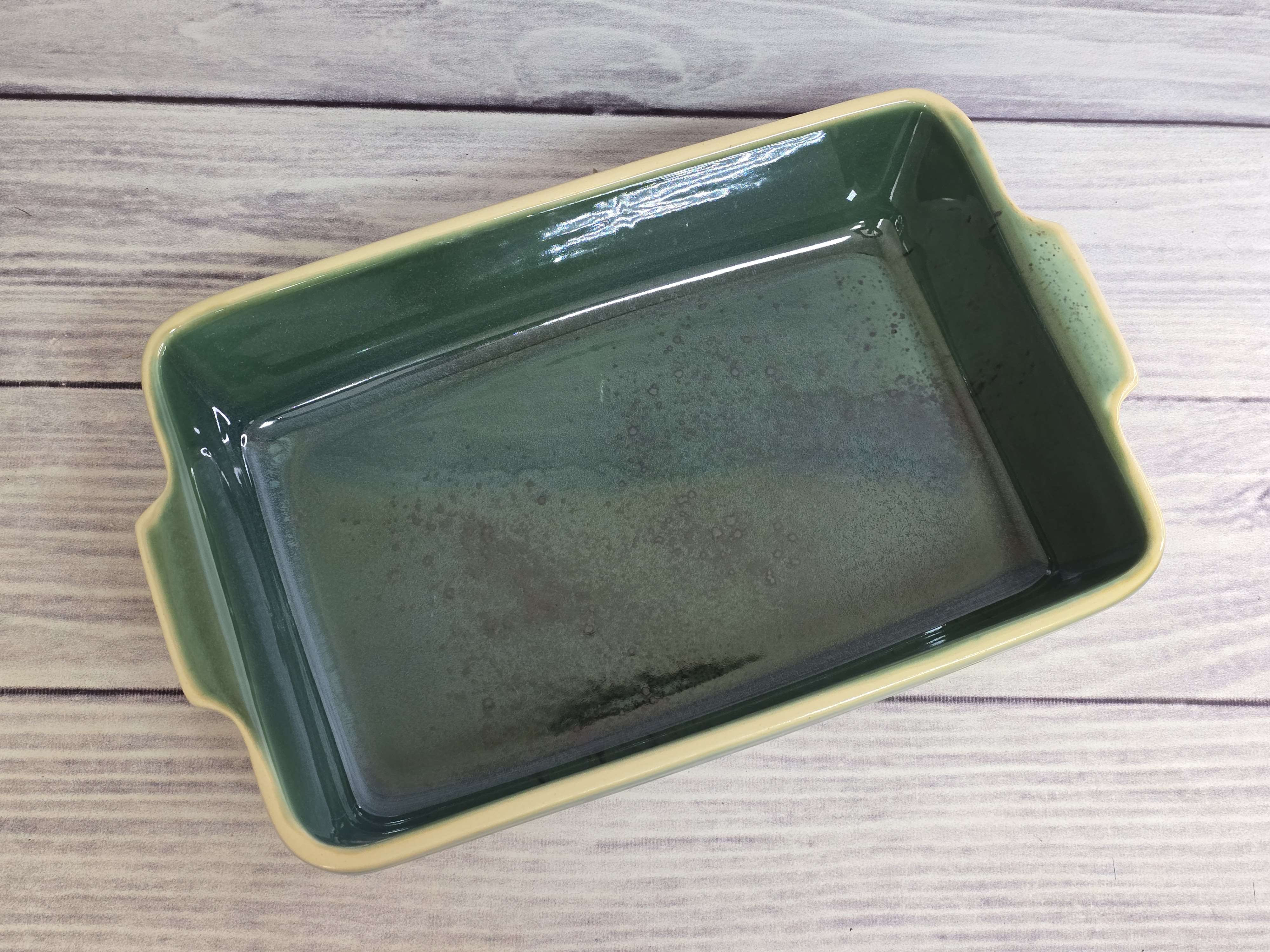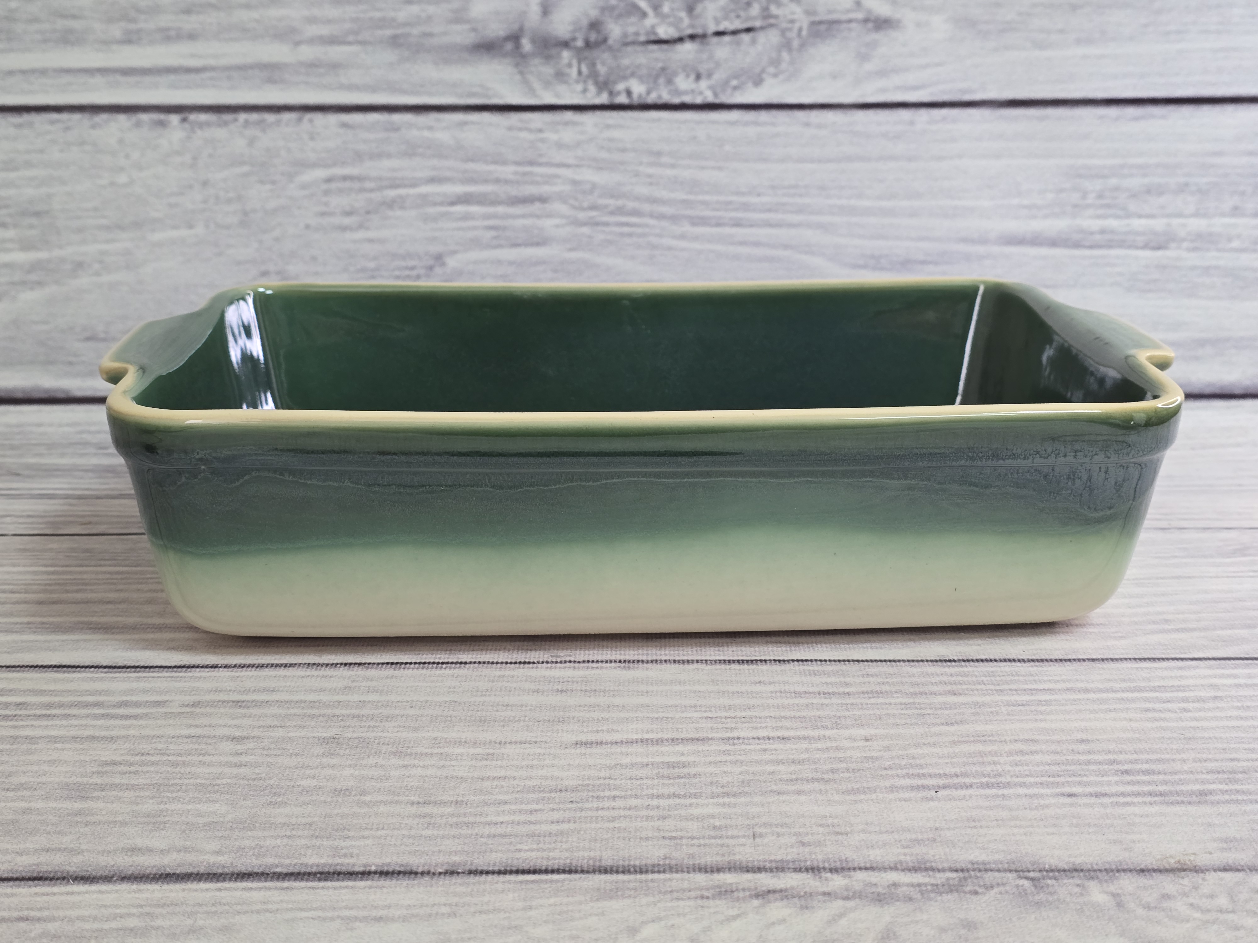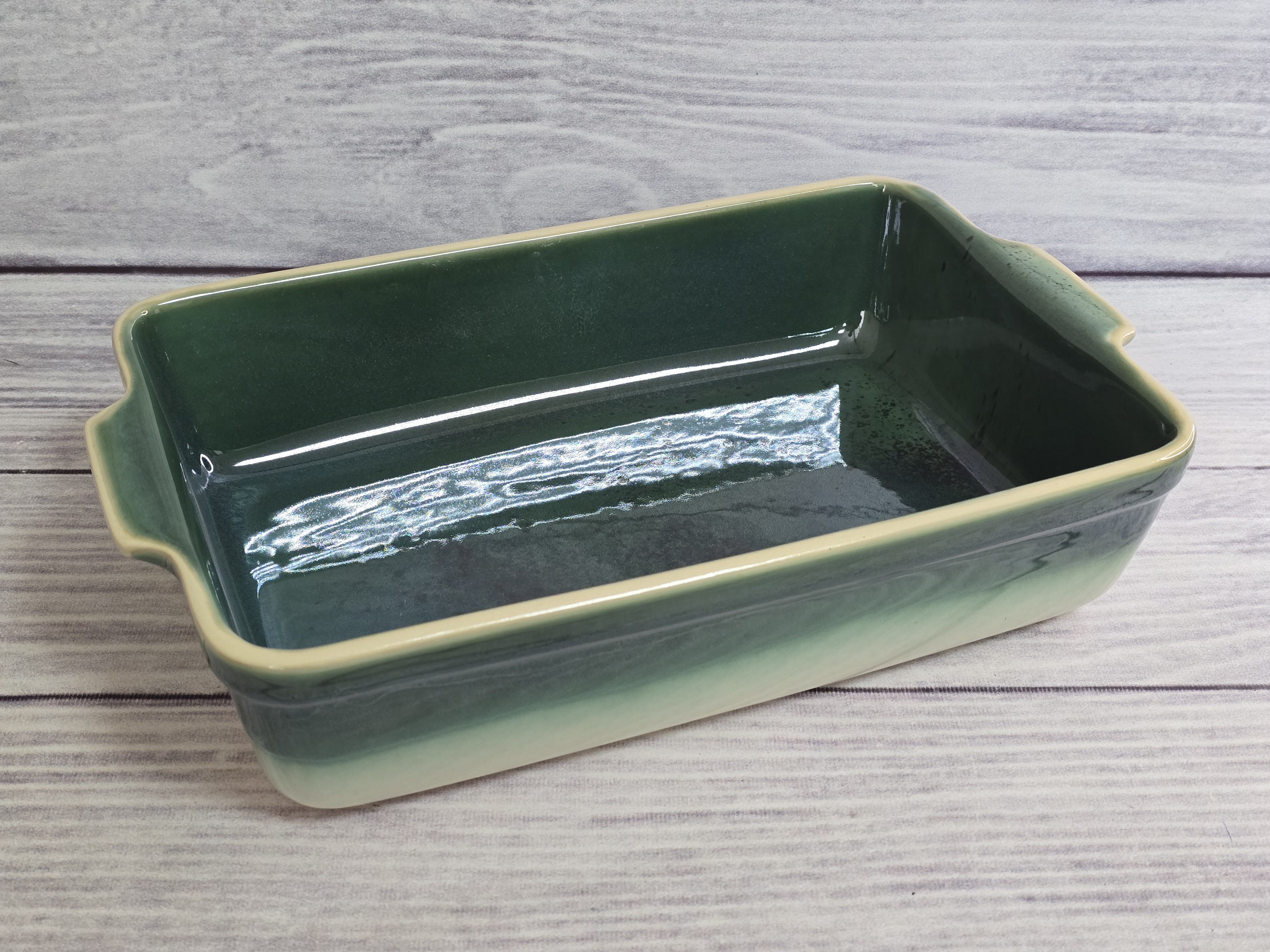 Форма для запекания Stampo смотрится очень стильно, и в ней действительно приятно готовить. Пища запекается быстро и не пригорает. Утолщённое дно и высокие бортики будут служить подспорьем в приготовлении кулинарных шедевров. В ней удобно готовить мясо, рыбу, овощи, в общем, всё, на что способно Ваше воображение и затем в ней же красиво подать на стол. Форма Stampo – изящное дополнение на кухне, которое может стать практичным помощником в приготовлении блюд и в сервировке как повседневного, так и праздничного стола. Зеркальная зеленая глянцевая поверхность на кремовом фоне с загадочными разводами, бликами и черными крапинами.