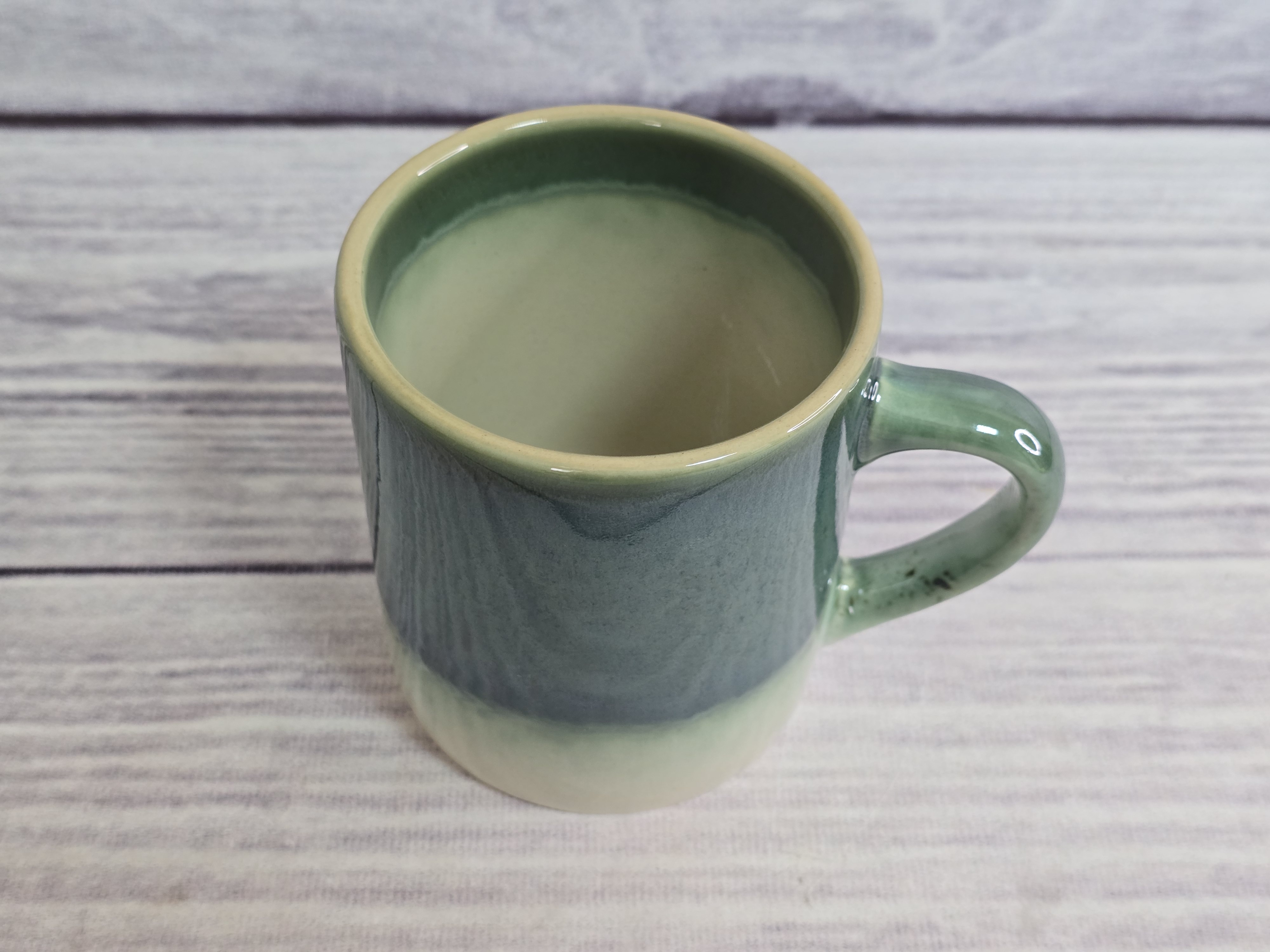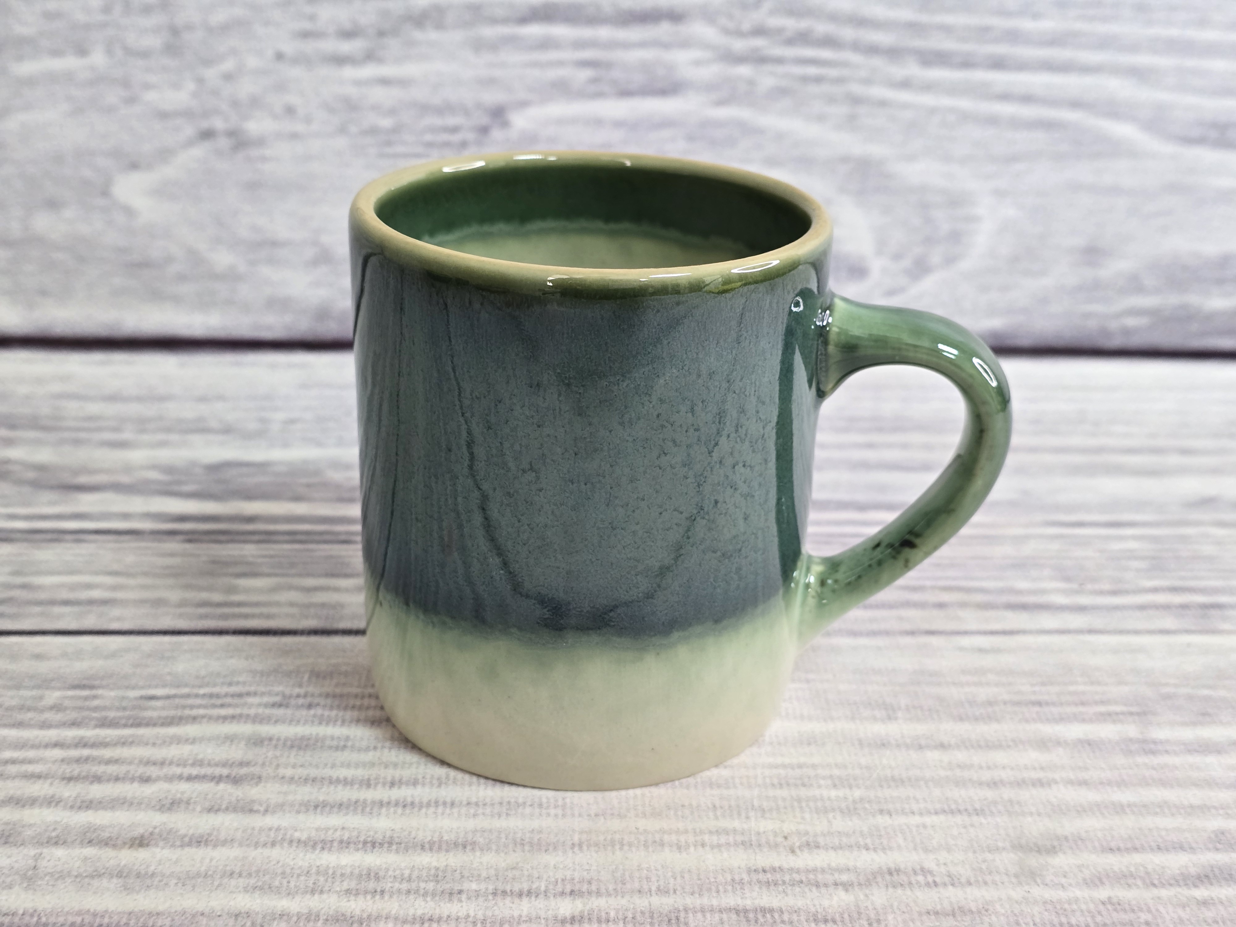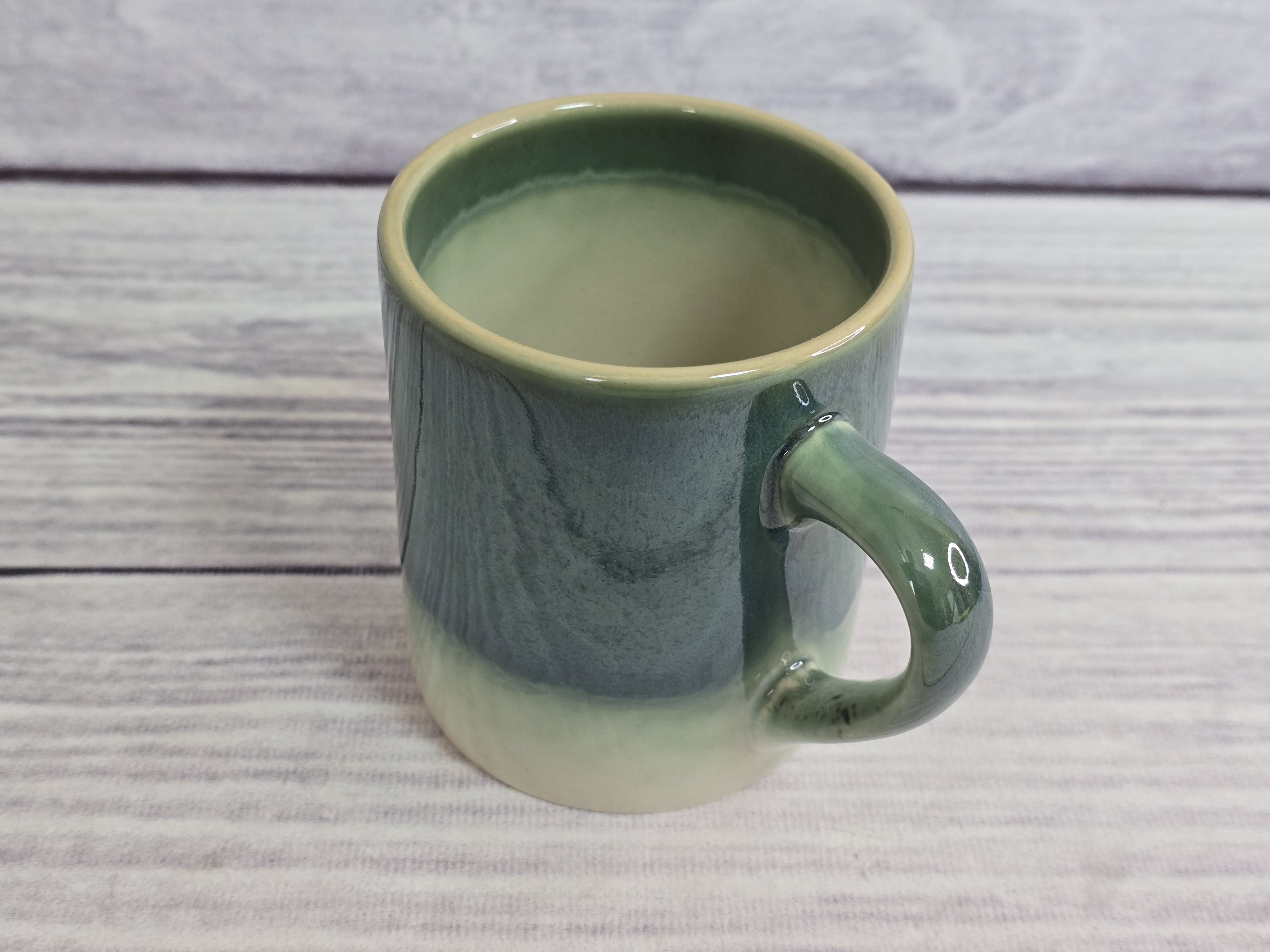 Классическая кружка объемом 0,35 л. Незаменима для подачи горячих и холодных напитков. Пригодна для использования в посудомоечной машине и микроволновой печи. Зеркальная зеленая глянцевая поверхность на кремовом фоне с загадочными разводами, бликами и черными крапинами.