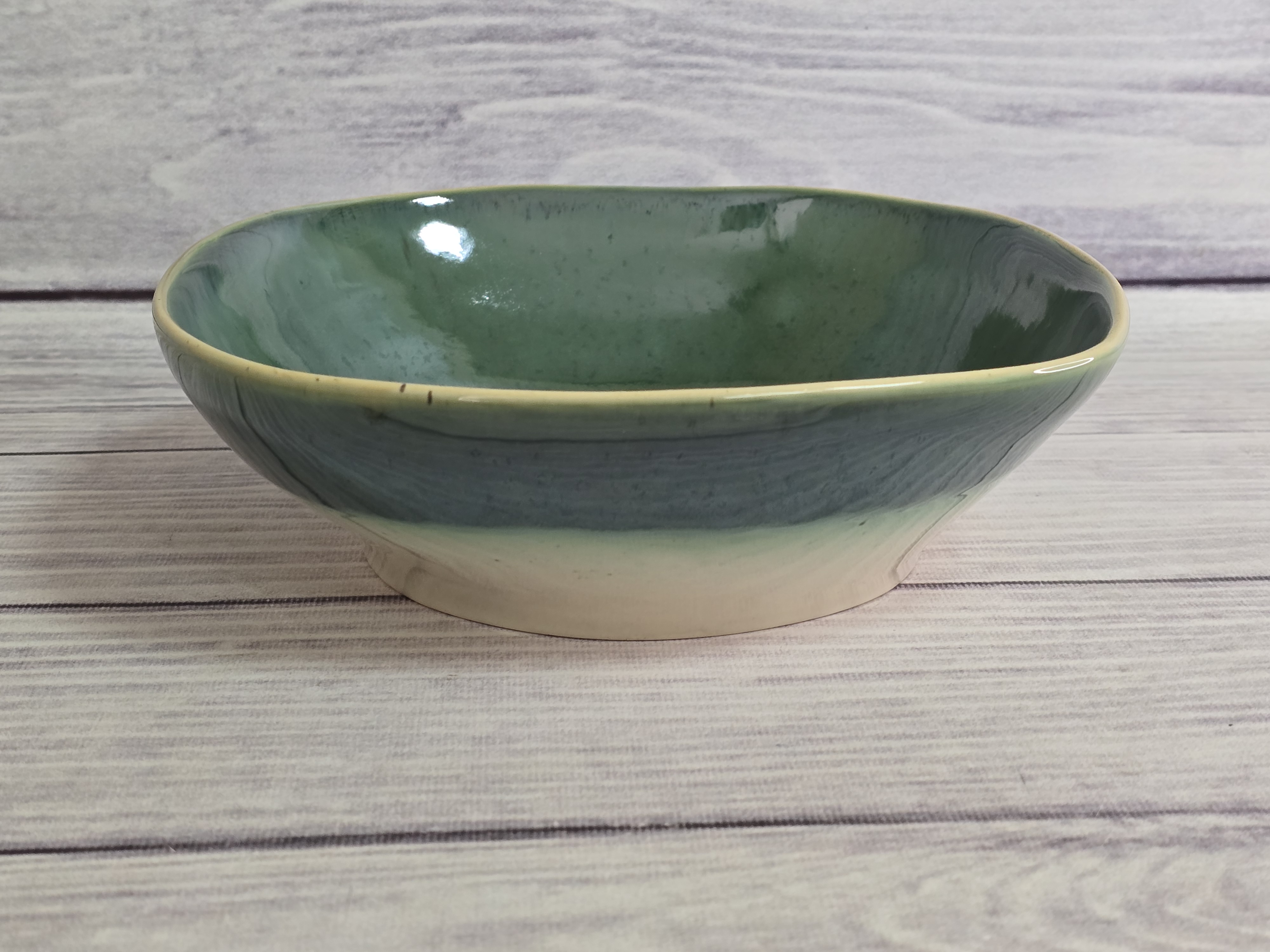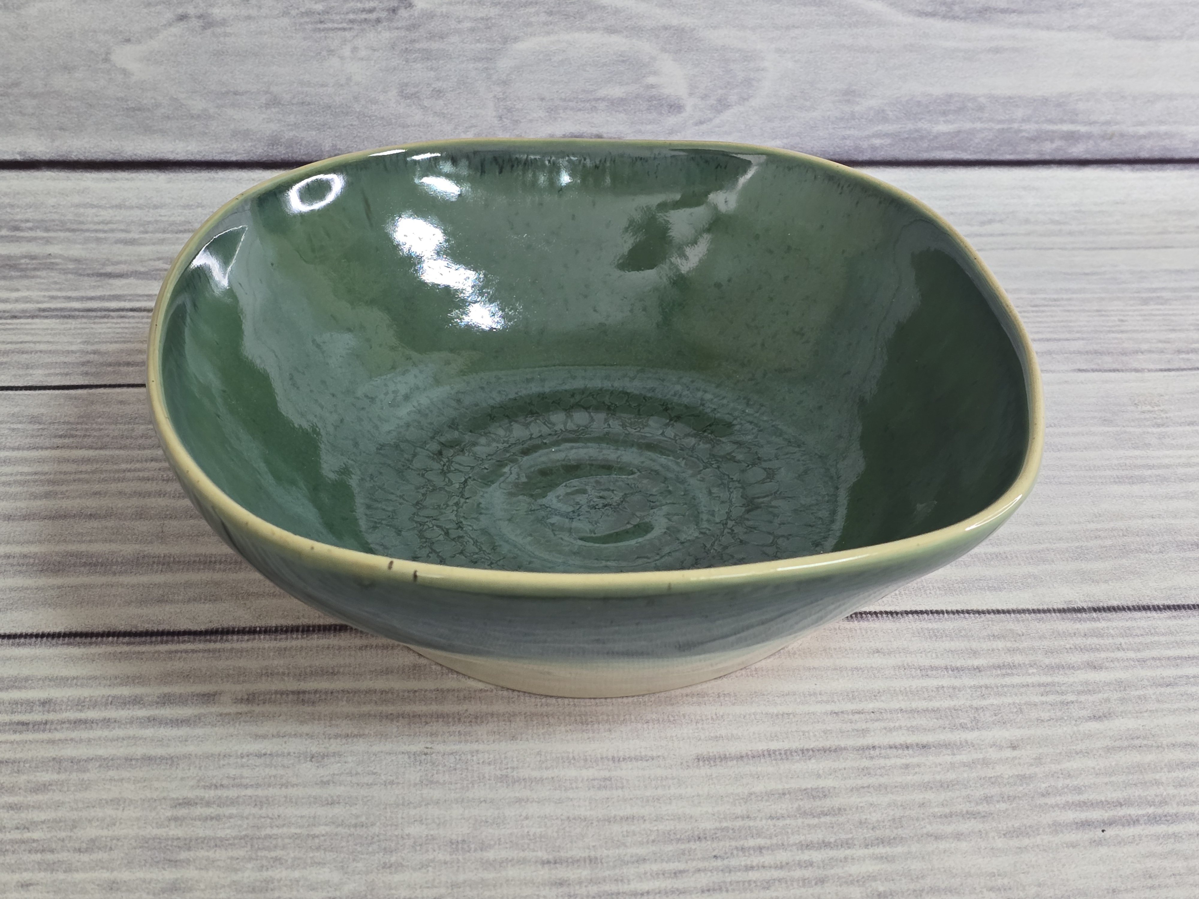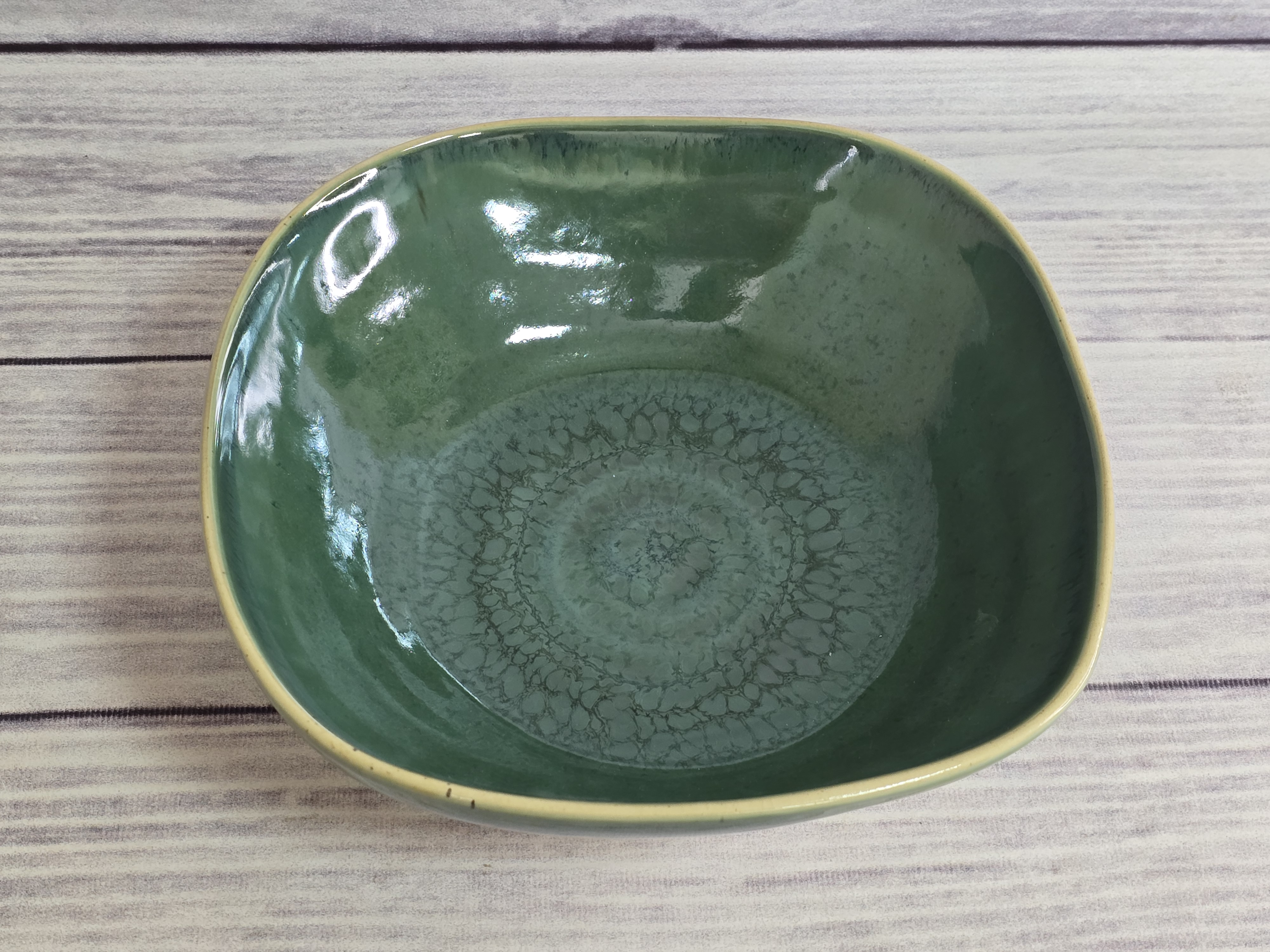 Фарфоровая тарелка с рельефной поверхностью, имитирующей гончарную работу. Идеально подойдет для подачи первых блюд и салатов. Послужит настоящим украшением вашего стола. Является дополнением к тарелке di modo и di modo campana. Можно использовать в микроволной печи и посудомоечной машине. Зеркальная зеленая глянцевая поверхность на кремовом фоне с загадочными разводами, бликами и черными крапинами.
