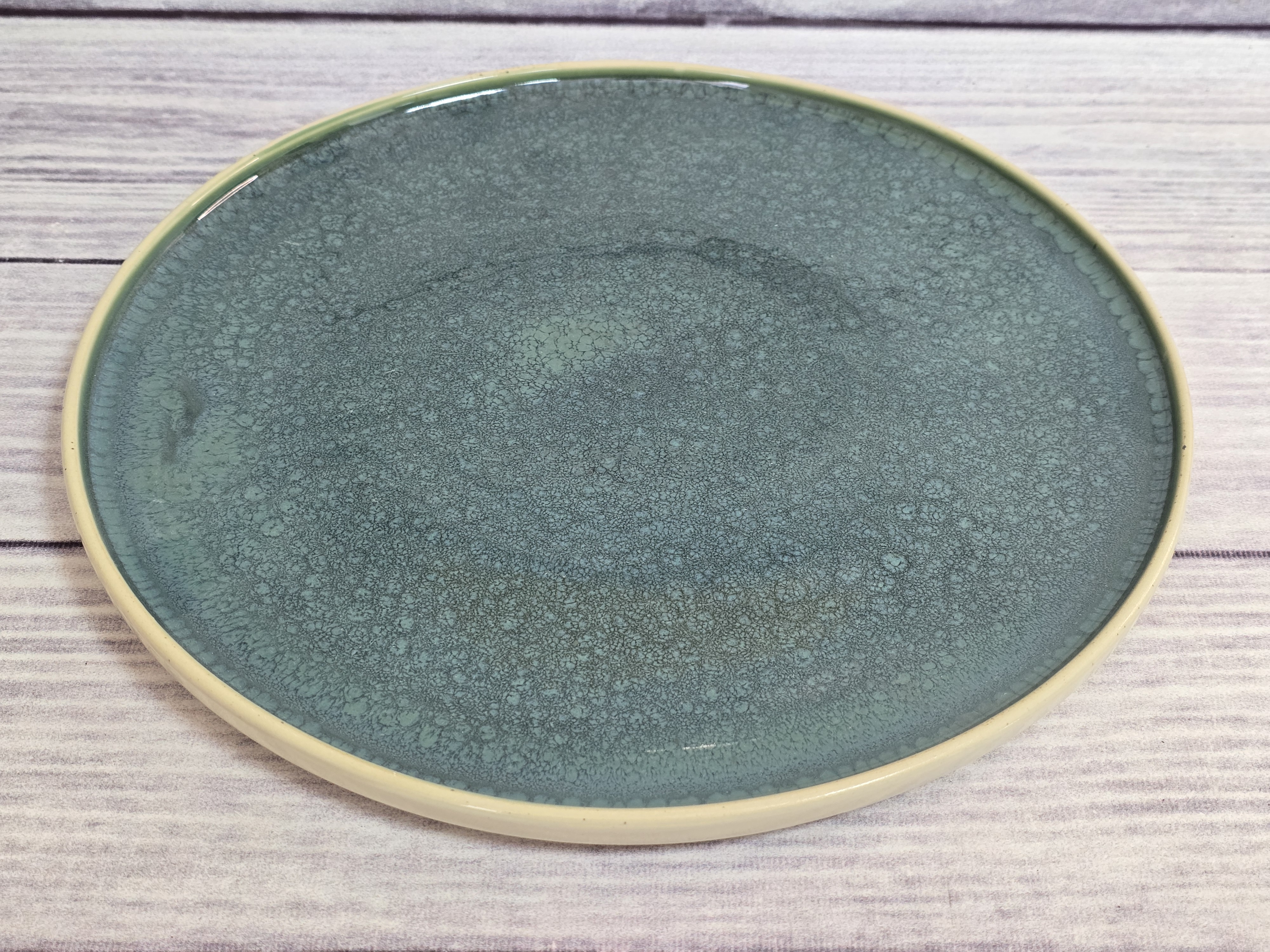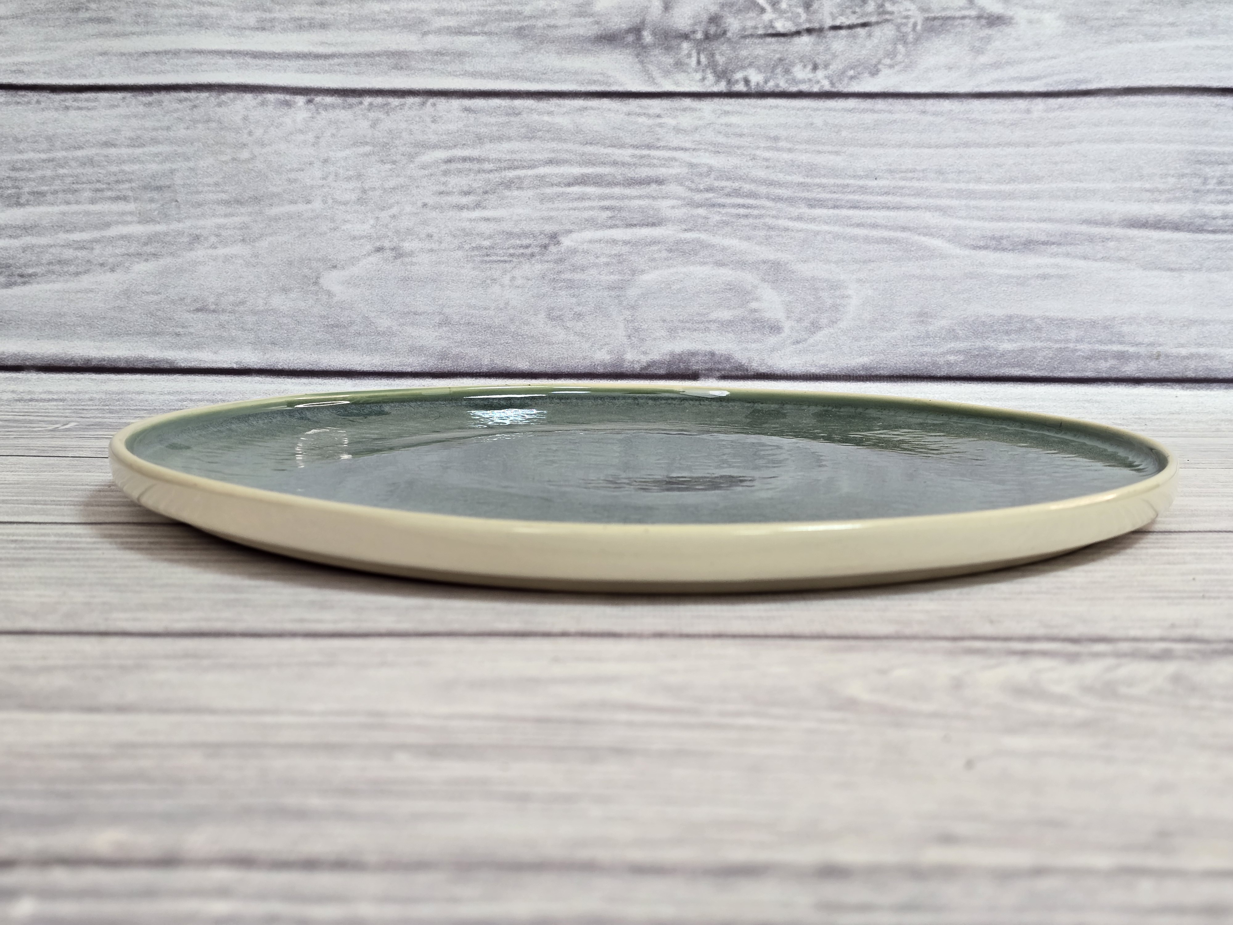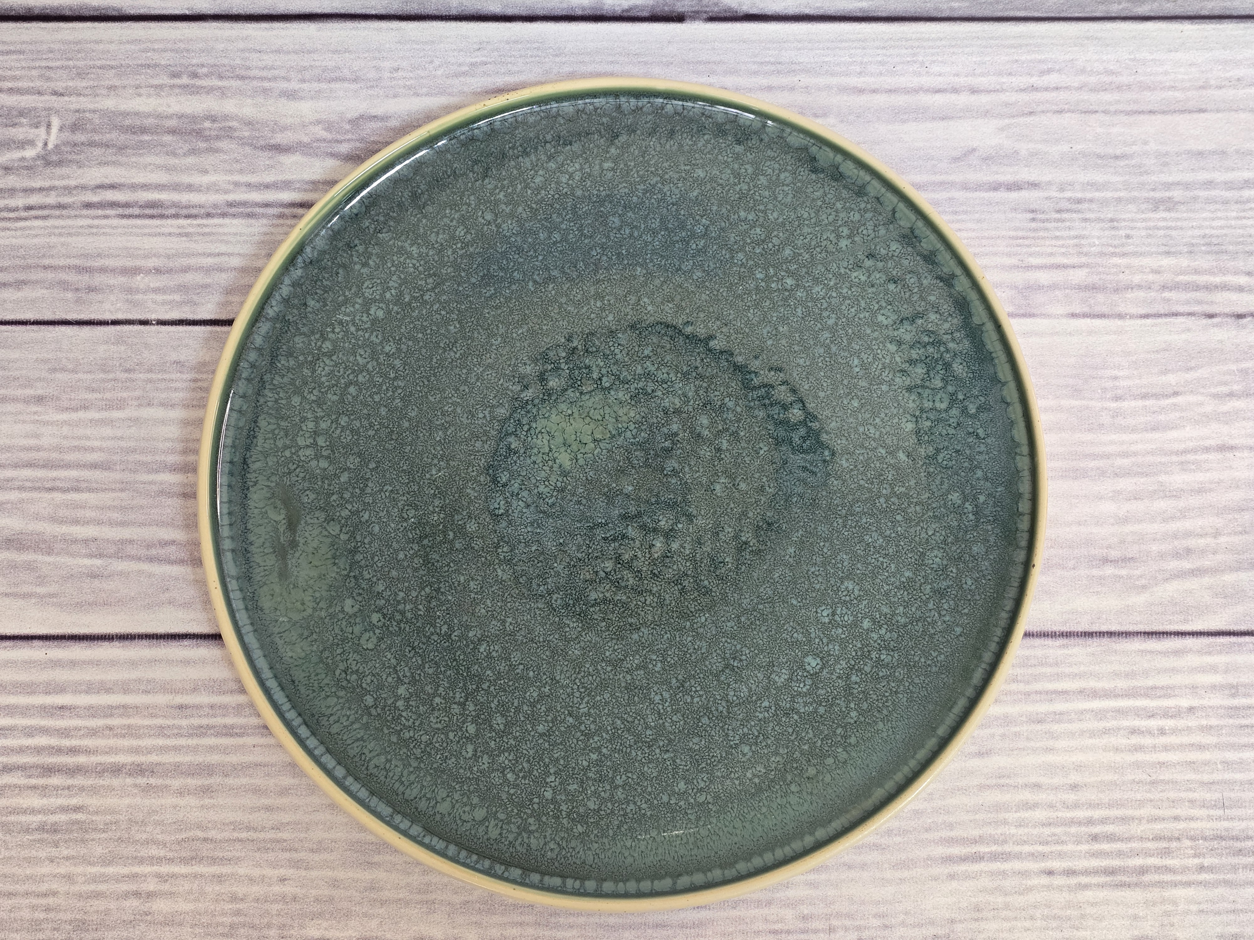 Тарелка под пиццу существенно отличается от остальной посуды, используемой для подачи горячих первых, вторых блюд и закусок. Она имеет плоскую форму со слегка загнутыми краями или невысокими бортиками. Плоское дно повторяет форму пиццы, а бортики предотвращают ее соскальзывание на стол в процессе нарезки. Пригодна для использования в посудомоечной машине и микроволновой печи. Зеркальная зеленая глянцевая поверхность на кремовом фоне с загадочными разводами, бликами и черными крапинами.