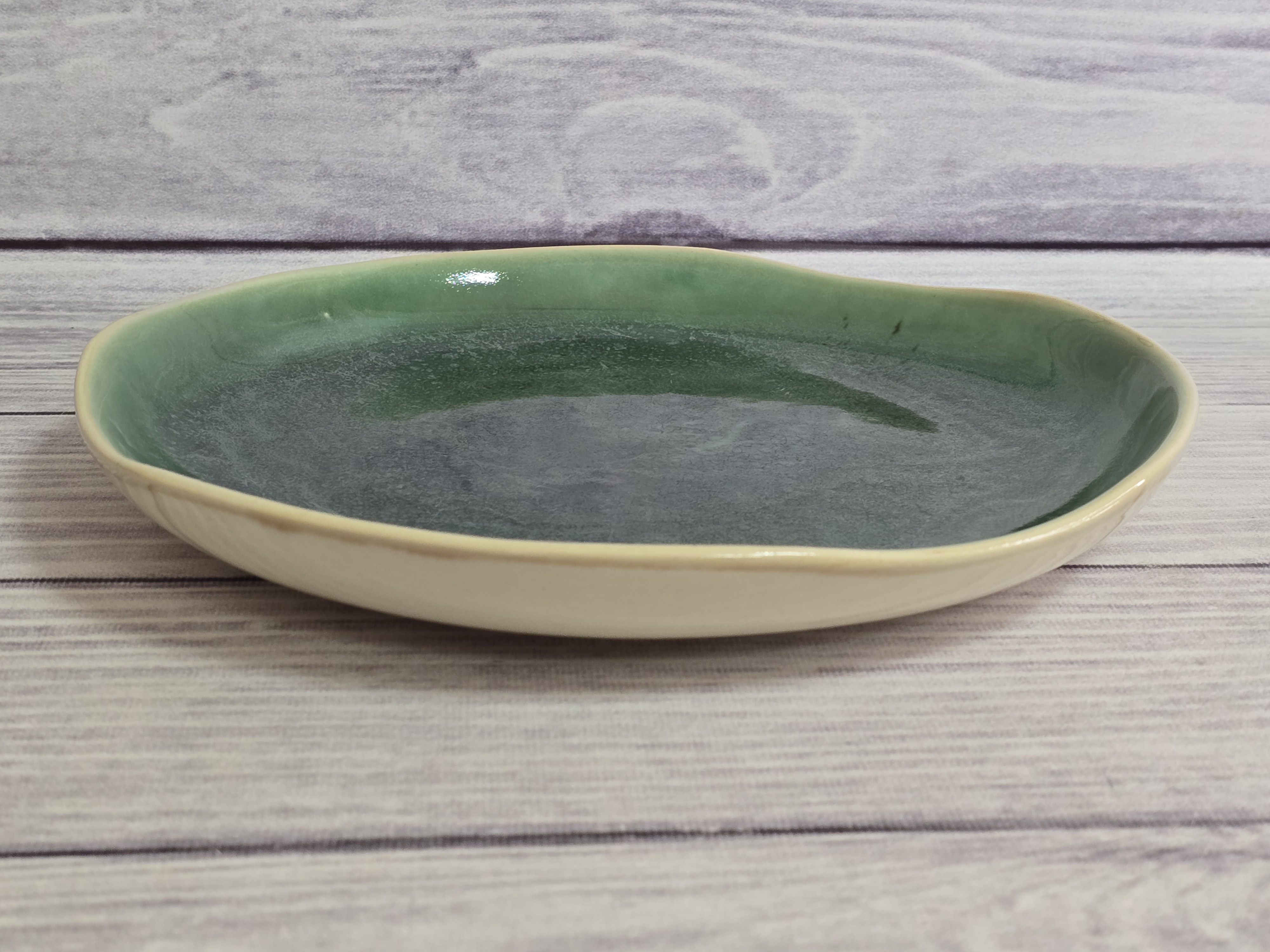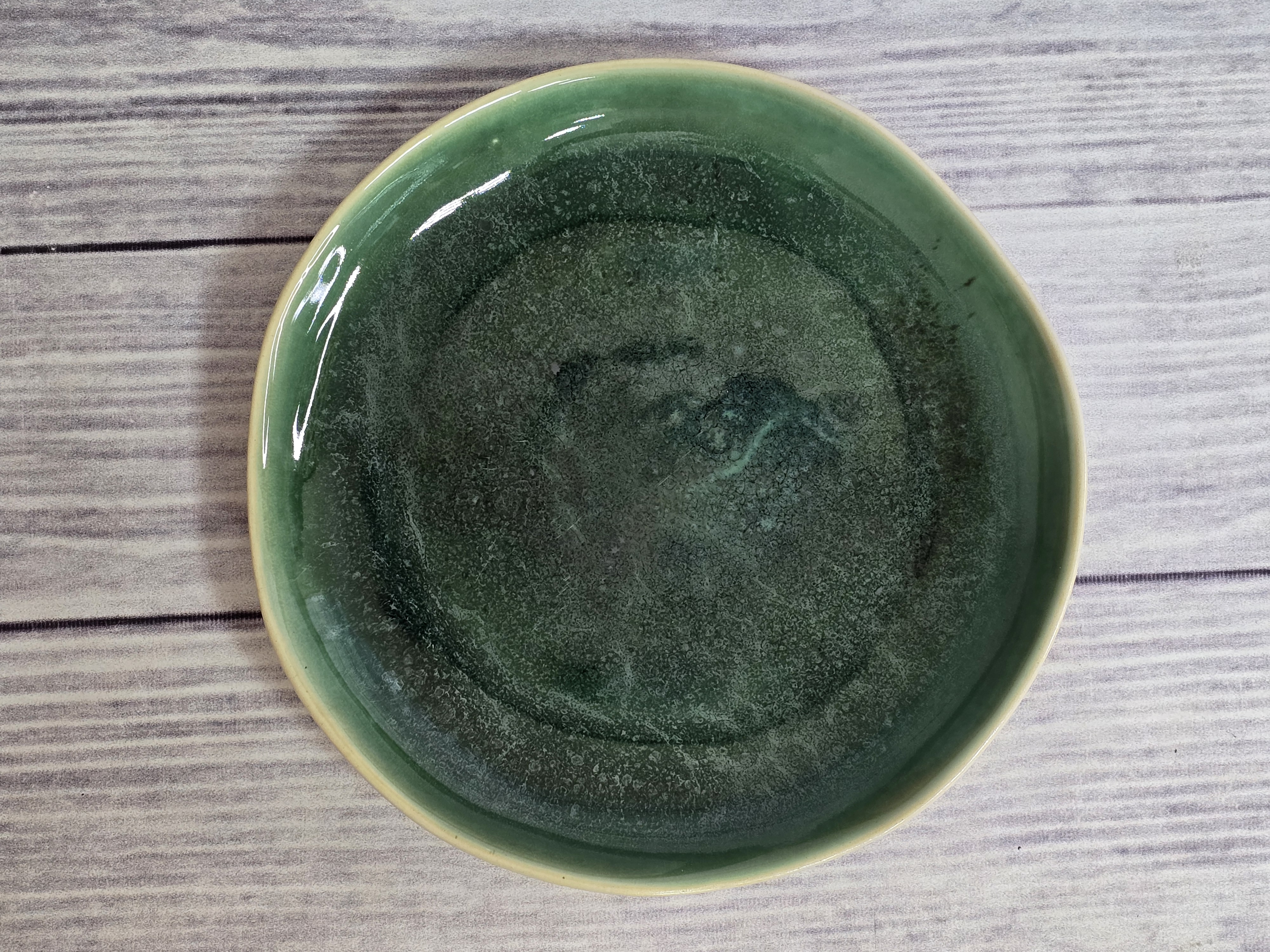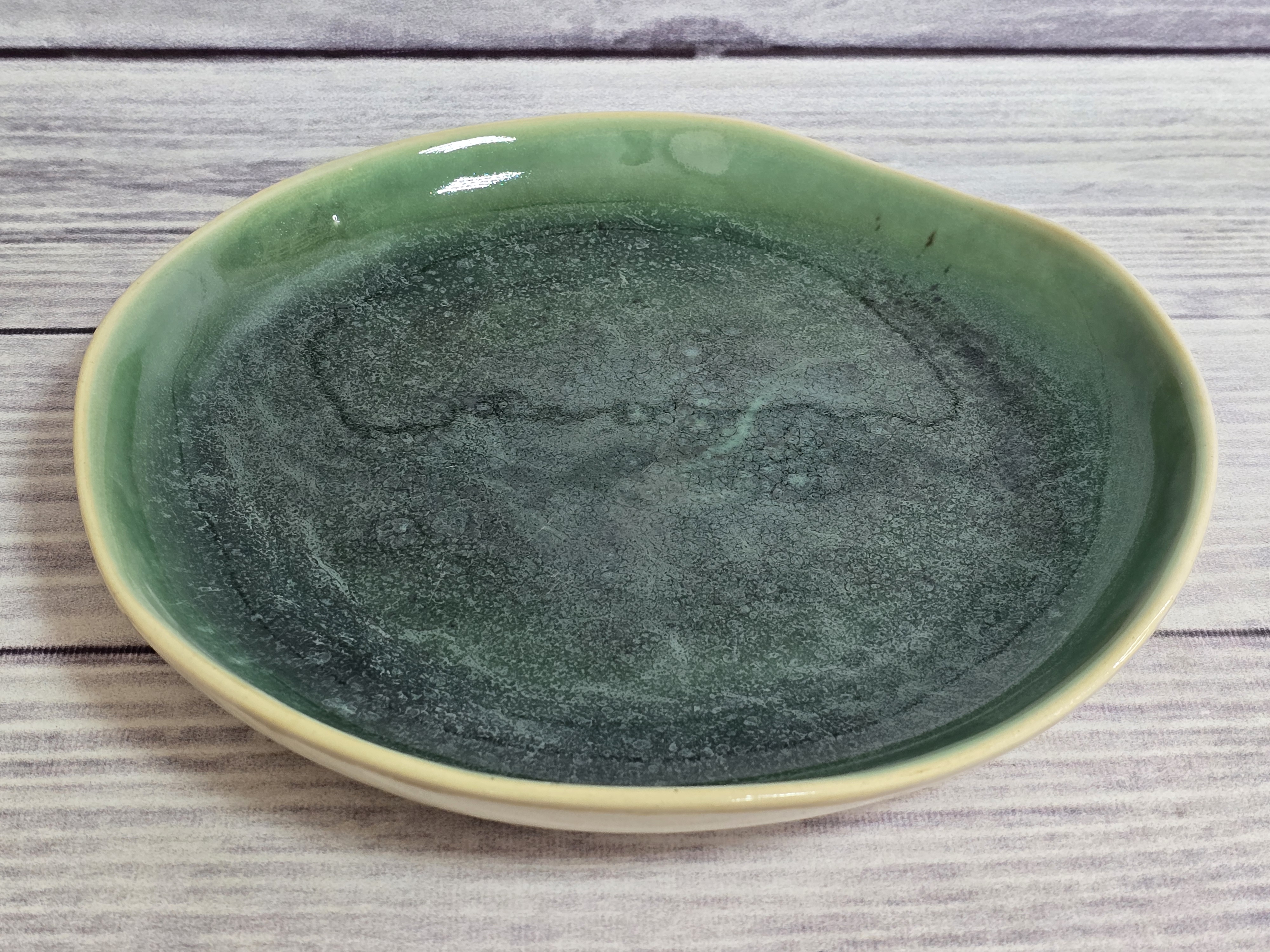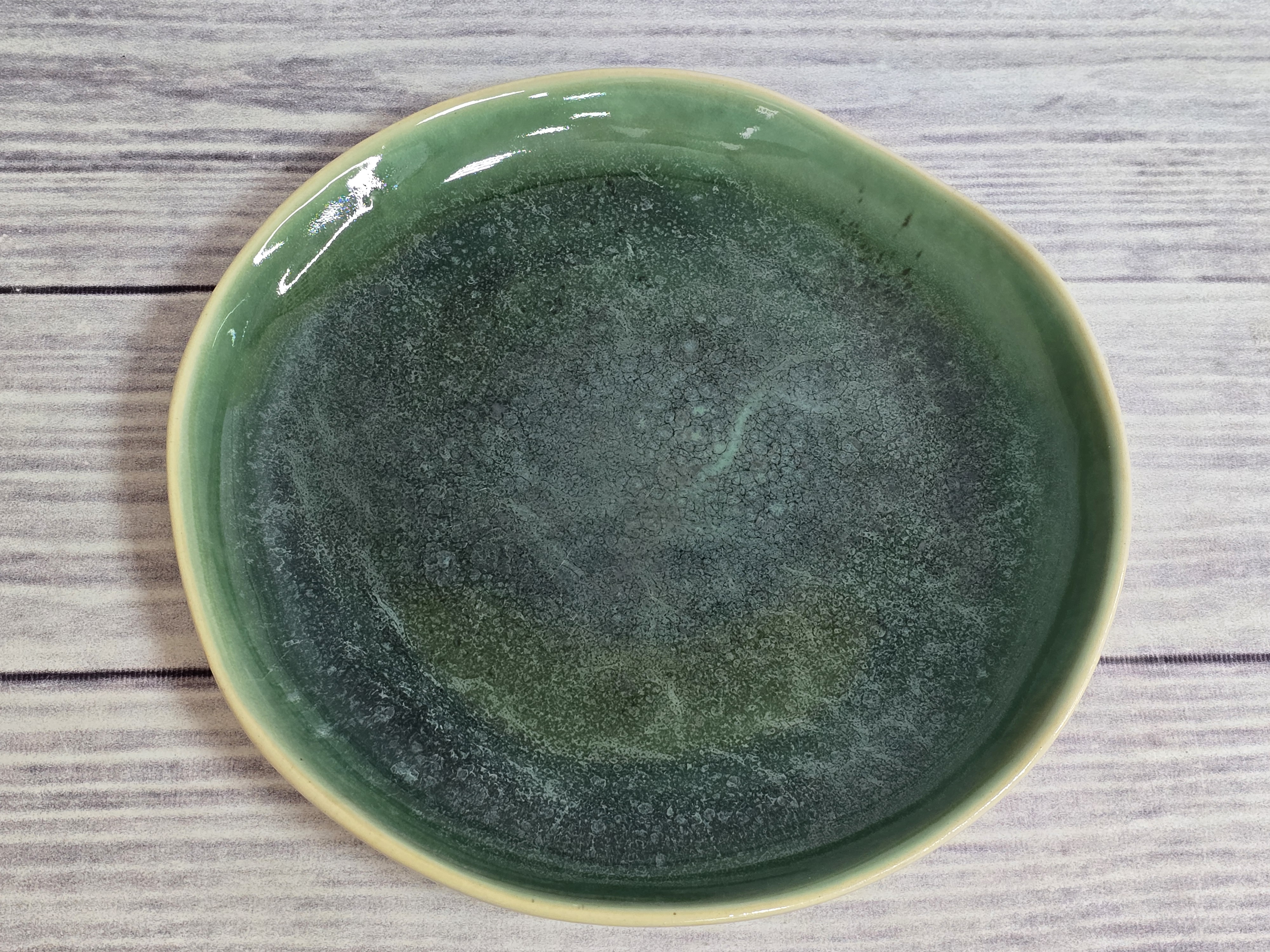 Компактная тарелка сочетает в себе изысканный дизайн с максимальной функциональностью. Воодушевит вас на создание новых блюд. Производится из современного и экологически чистого материала - фарфора. Подходит для использования в микроволновой печи и посудомоечной машине. Зеркальная зеленая глянцевая поверхность на кремовом фоне с загадочными разводами, бликами и черными крапинами.