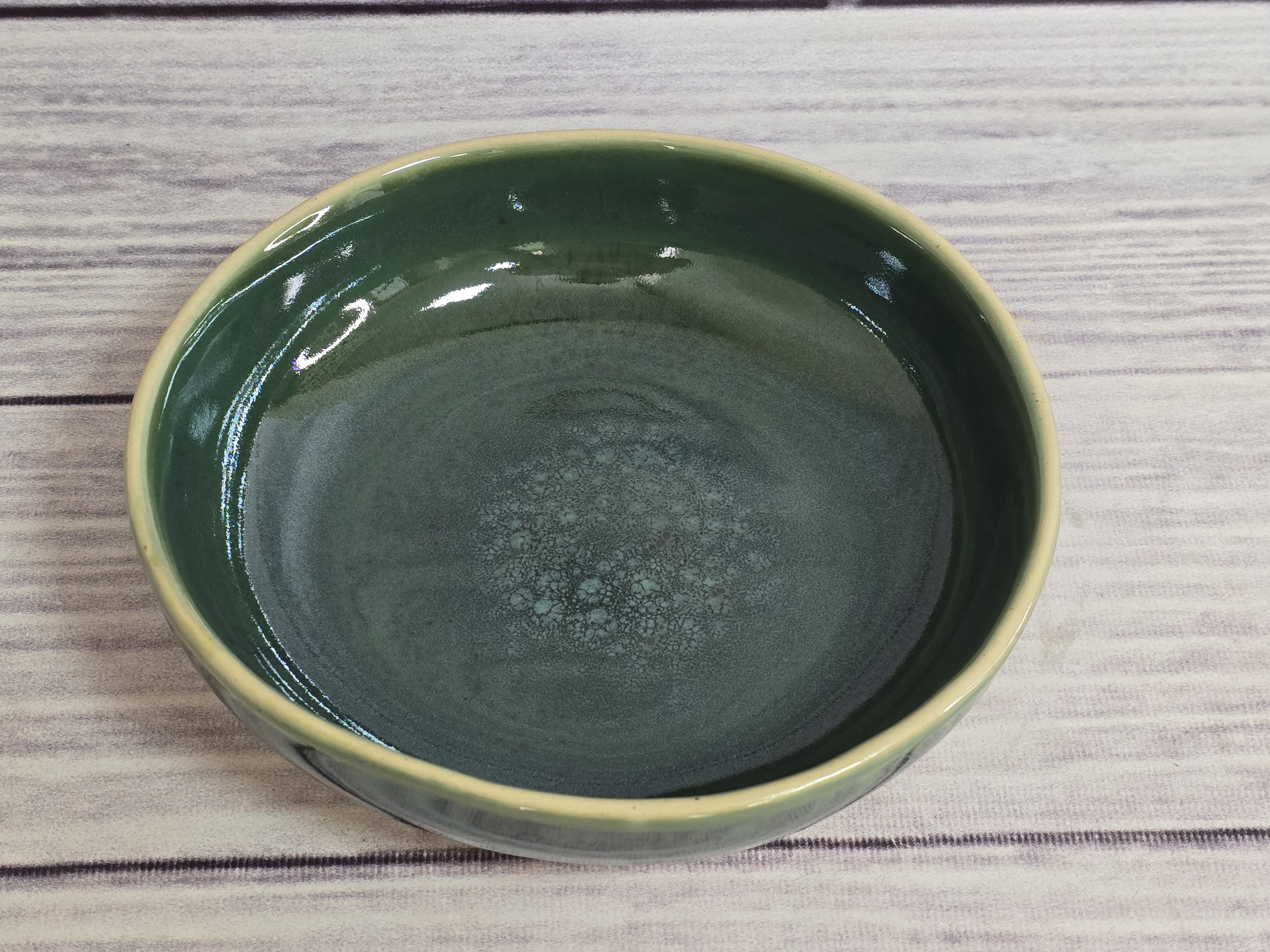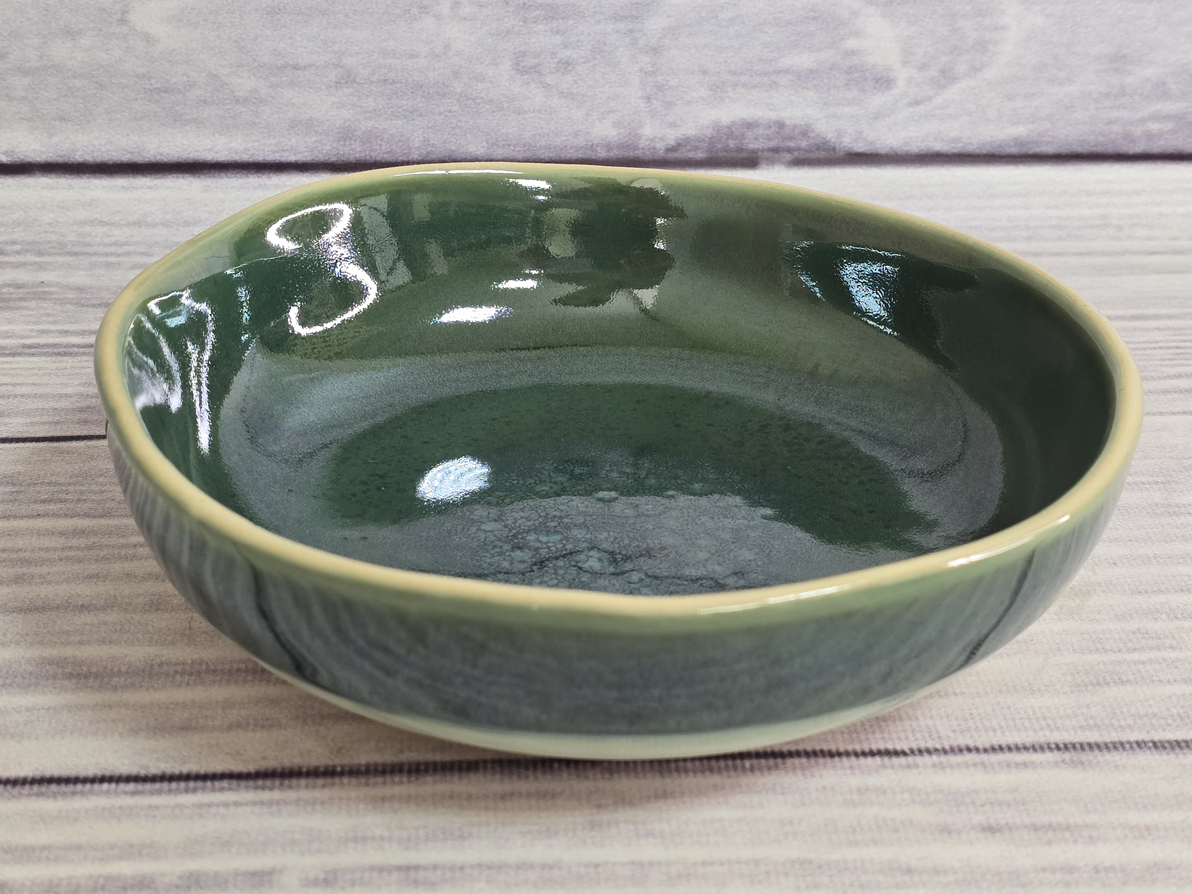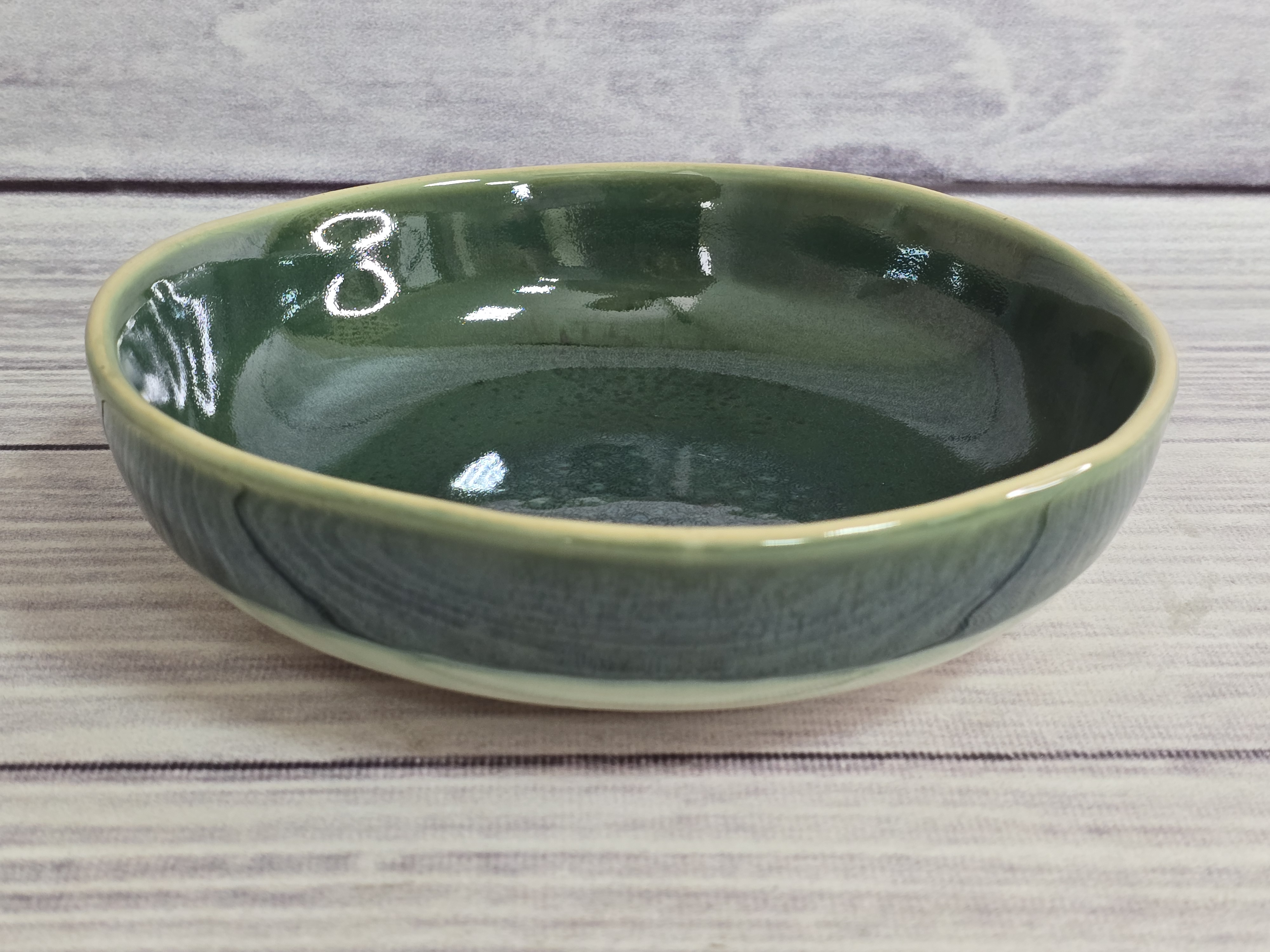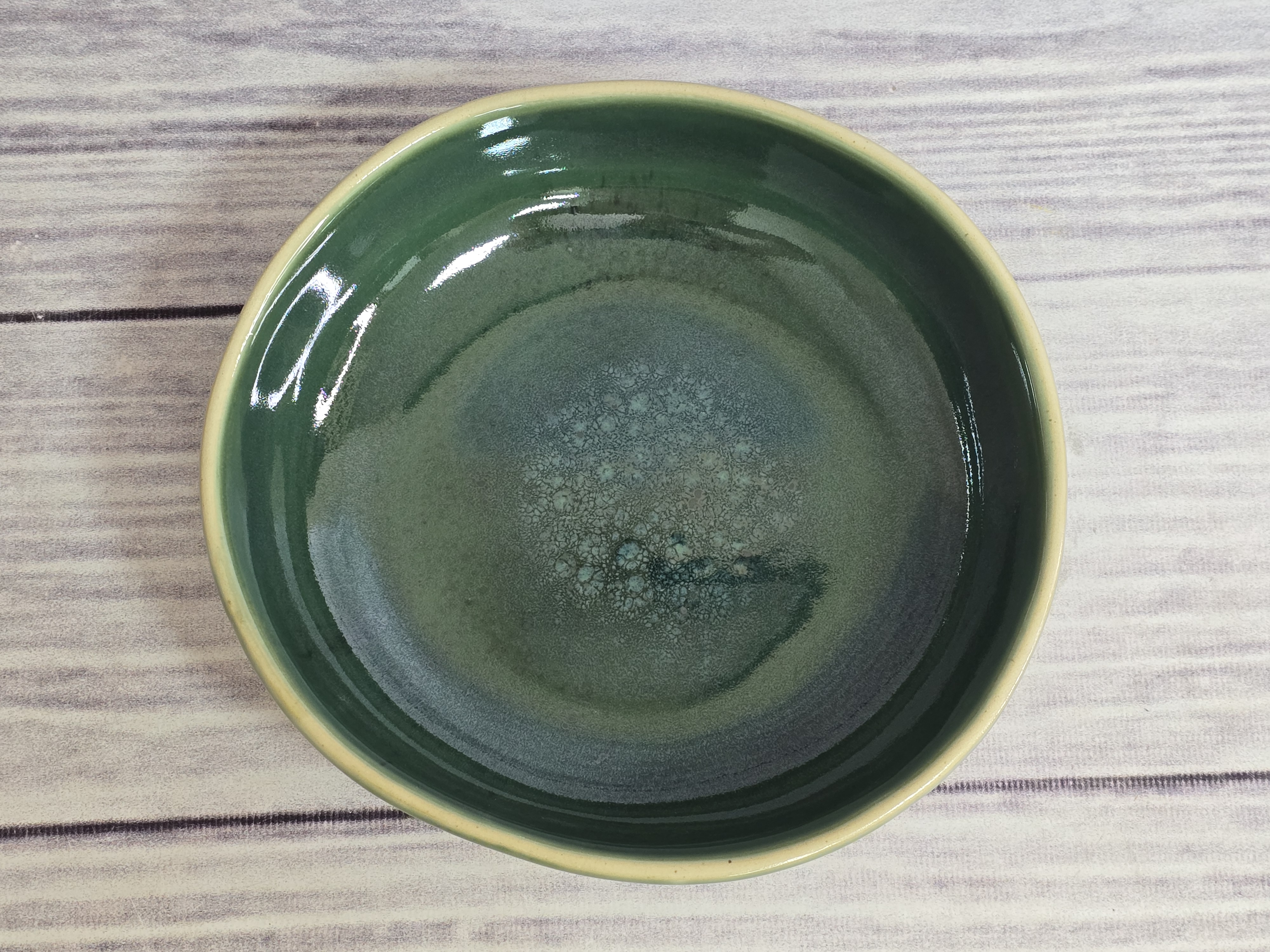 Компактная тарелка сочетает в себе изысканный дизайн с максимальной функциональностью. Специально неровные края, воодушевит шеф-повара на самобытные блюда. Производится из современного и экологически чистого материала - фарфора. Подходит для использования в микроволновой печи и посудомоечной машине. Зеркальная зеленая глянцевая поверхность на кремовом фоне с загадочными разводами, бликами и черными крапинами.
