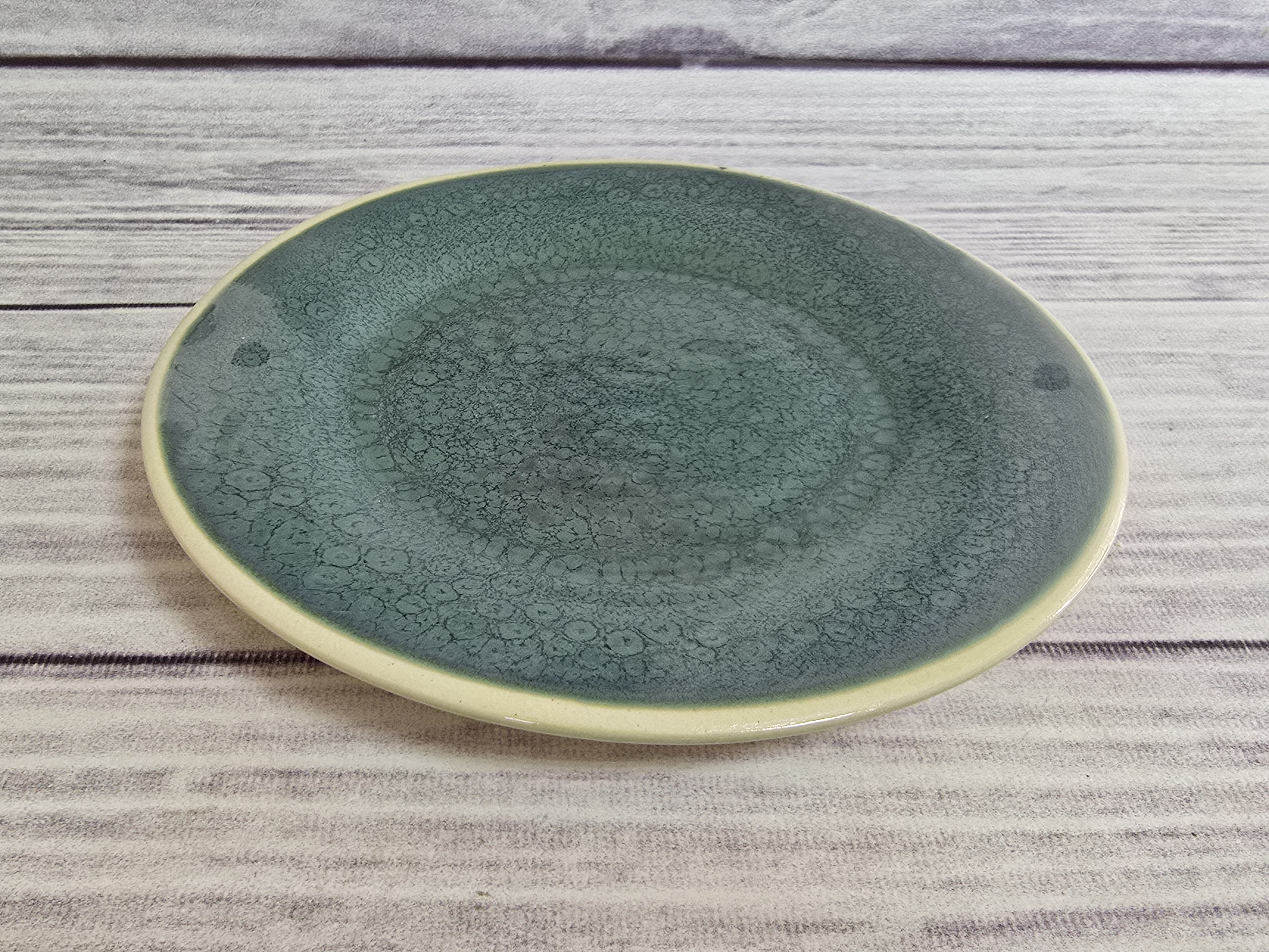 Удобная и практичная тарелка, имеющая утолщенный край. Пригодна для использования в посудомоечной машине и микроволновой печи. Зеркальная зеленая глянцевая поверхность на кремовом фоне с загадочными разводами, бликами и черными крапинами.