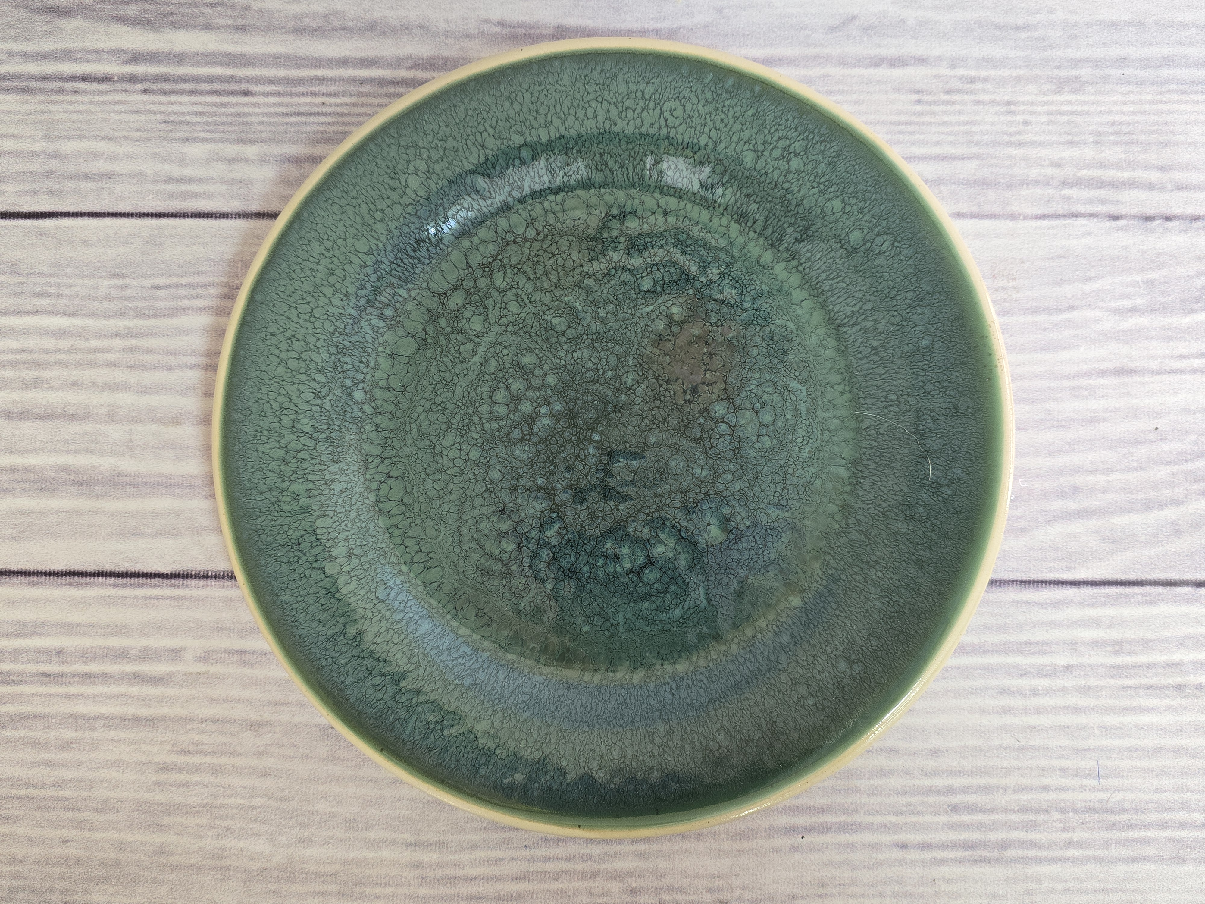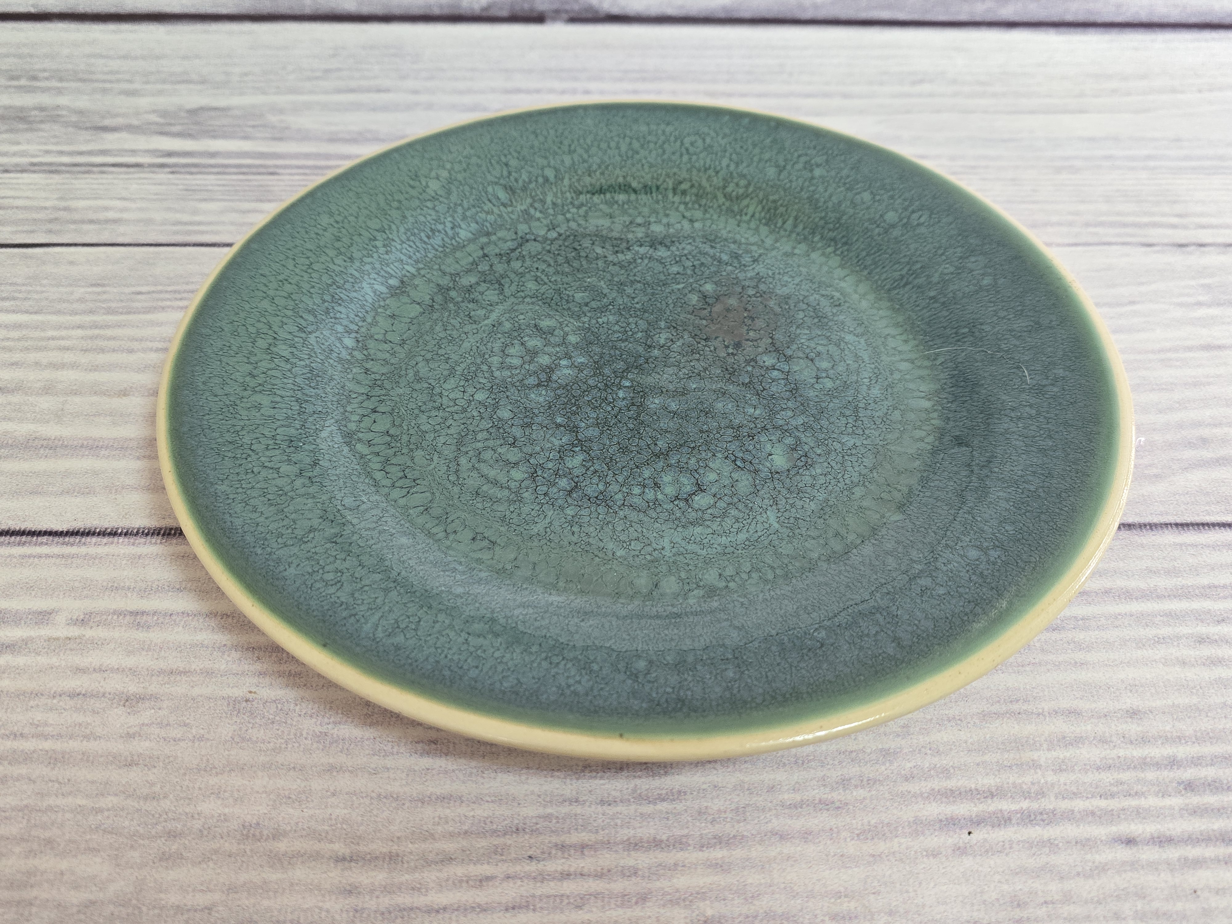 Яркий дизайн, удобная форма тарелки, имеющая утолщенный край. Блюдо, поданное на такой тарелке будет выглядеть вкуснее и придаст вам хорошую нотку настроения. Пригодна для использования в посудомоечной машине и микроволновой печи. Зеркальная зеленая глянцевая поверхность на кремовом фоне с загадочными разводами, бликами и черными крапинами.