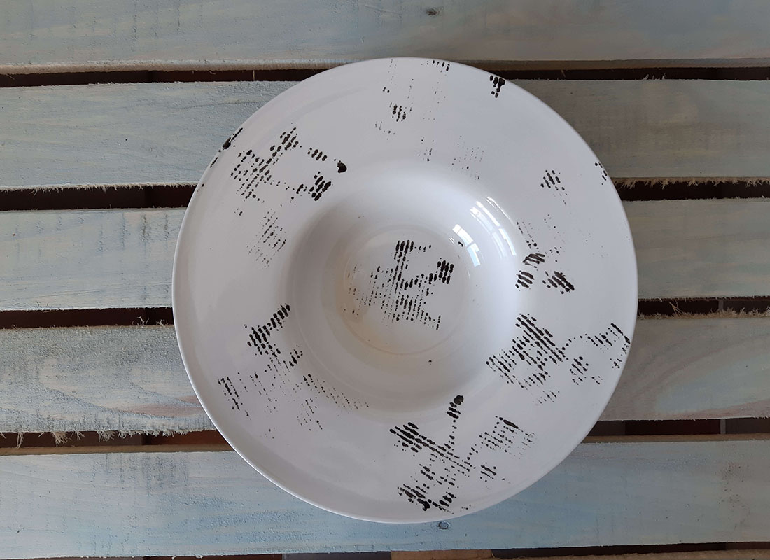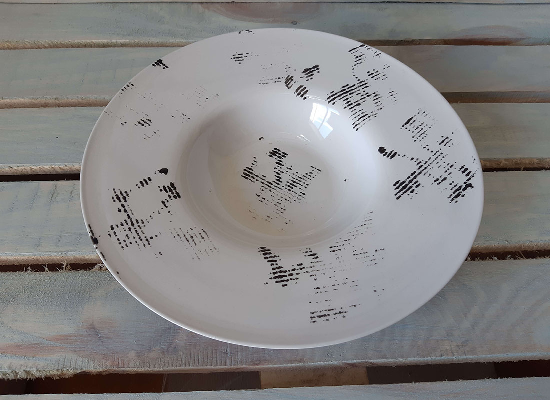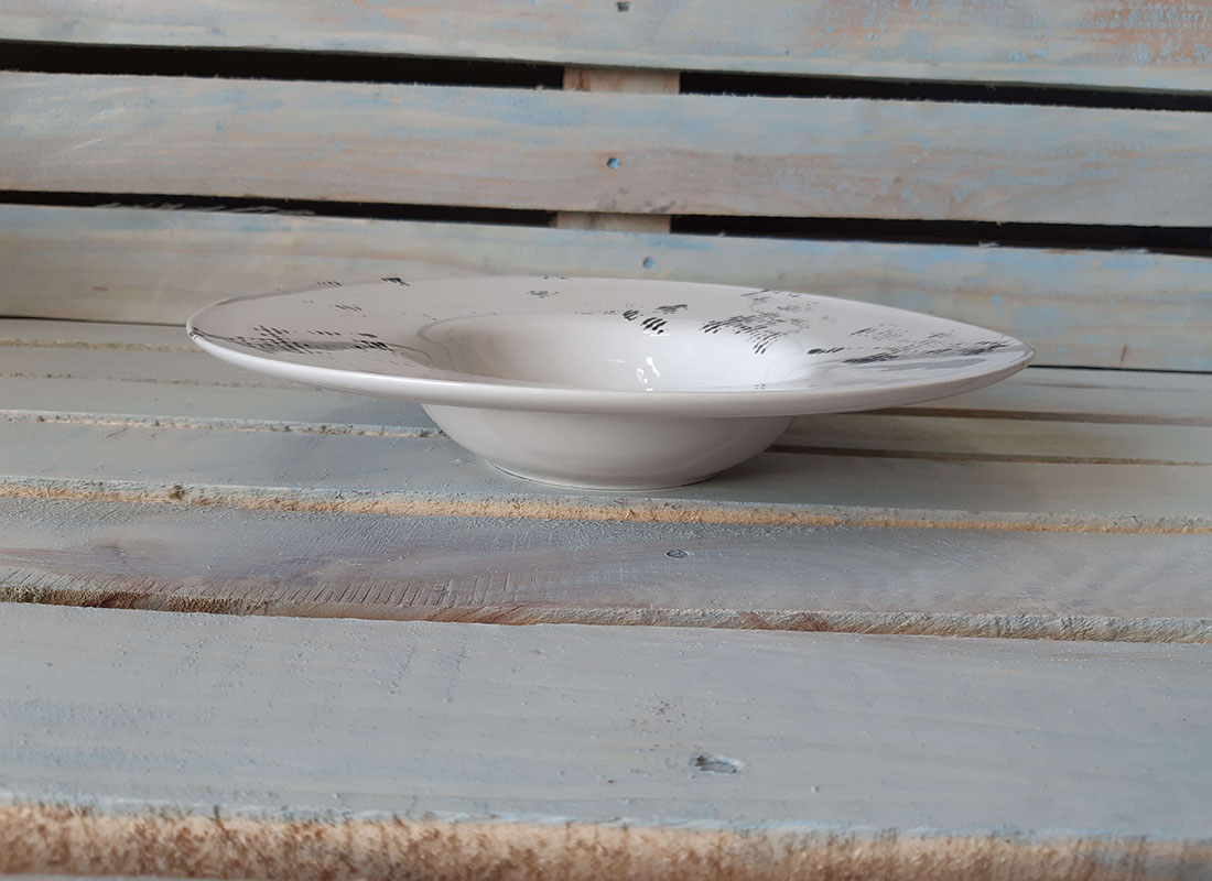 Большая тарелка-"шляпа" с широкими полями, очень модный вариант для современной подачи блюд. Подходит для подачи салата, супа и пасты. Глянцевая поверхность.