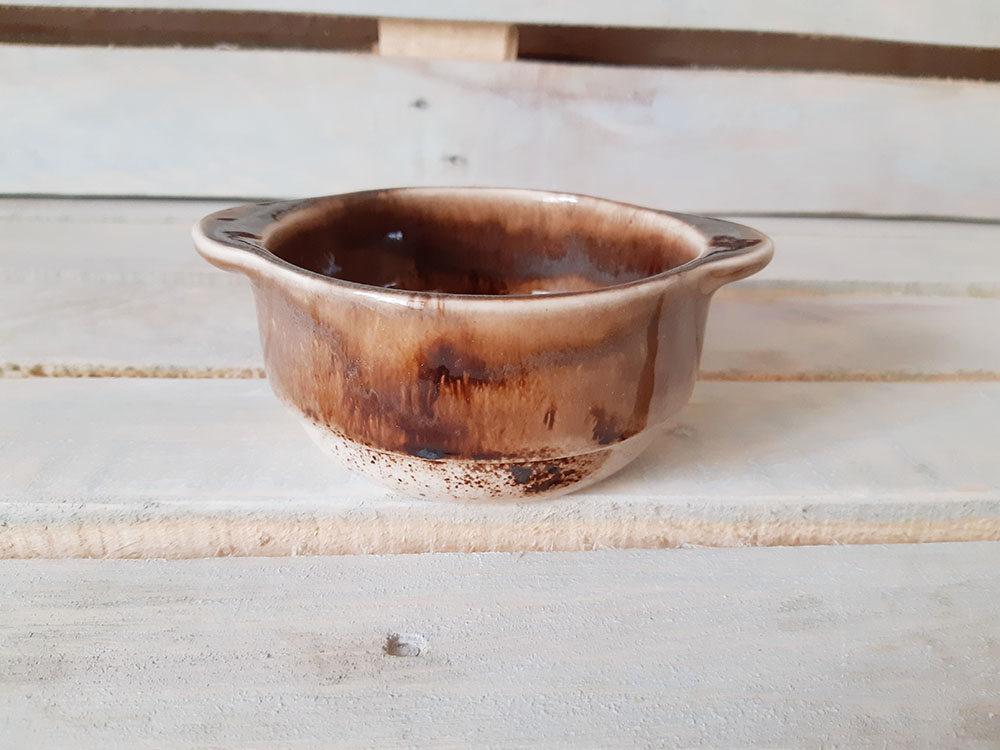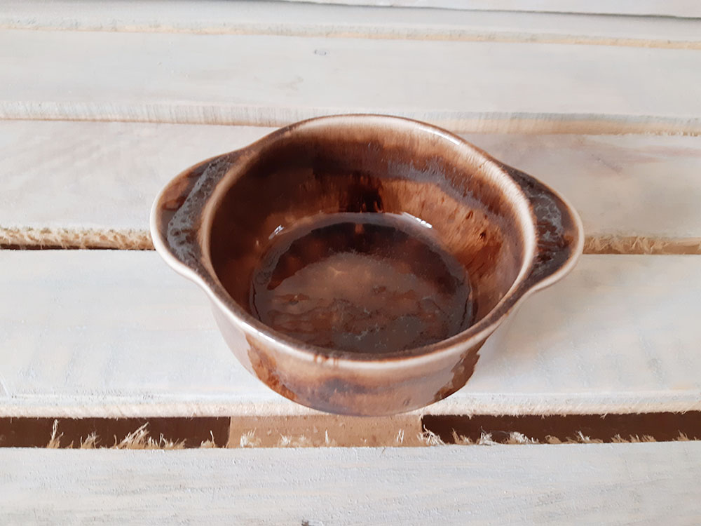 Оригинальная бульонница с ручками-ушками. Ручки такой формы менее подвержены сколам и реже отбиваются, бульонница прослужит дольше. Штабелируется одна на одну для экономии места. Пригодна для использования в посудомоечной машине и микроволновой печи. Зеркальная глянцевая поверхность c серо-коричнево-белыми загадочными разводами, бликами и черными крапинами.