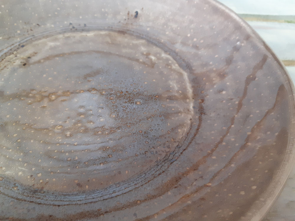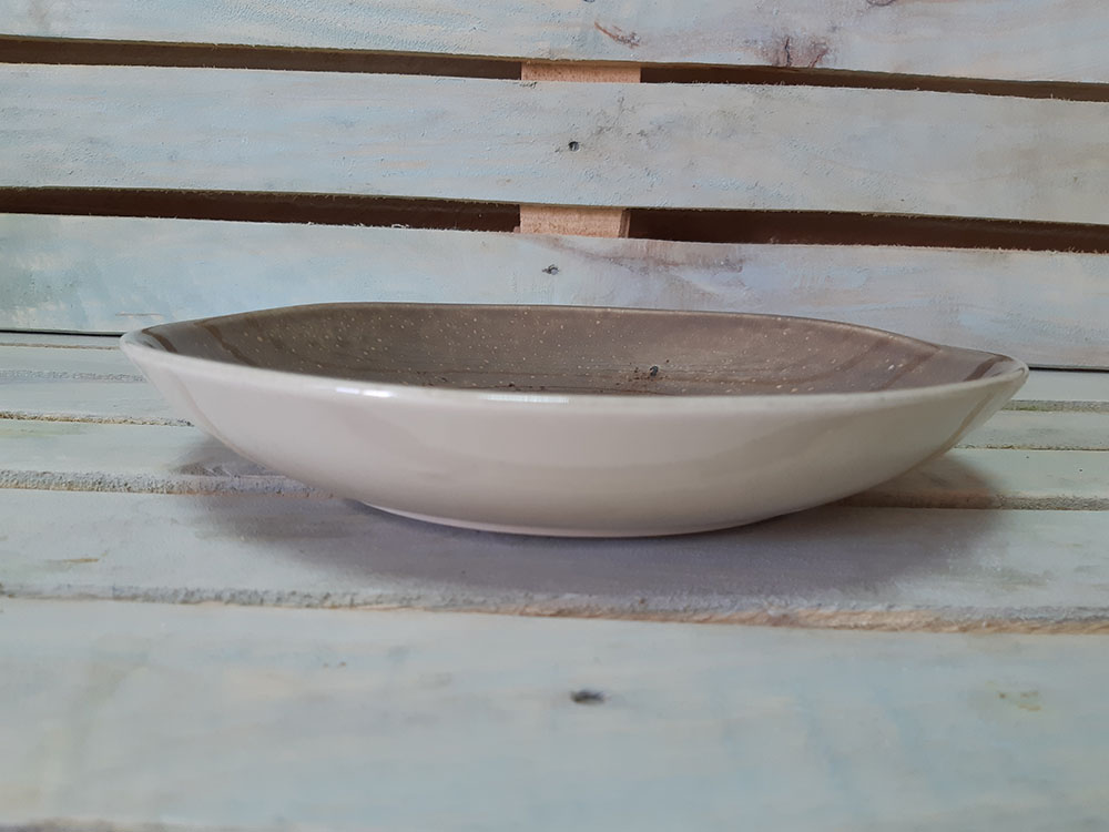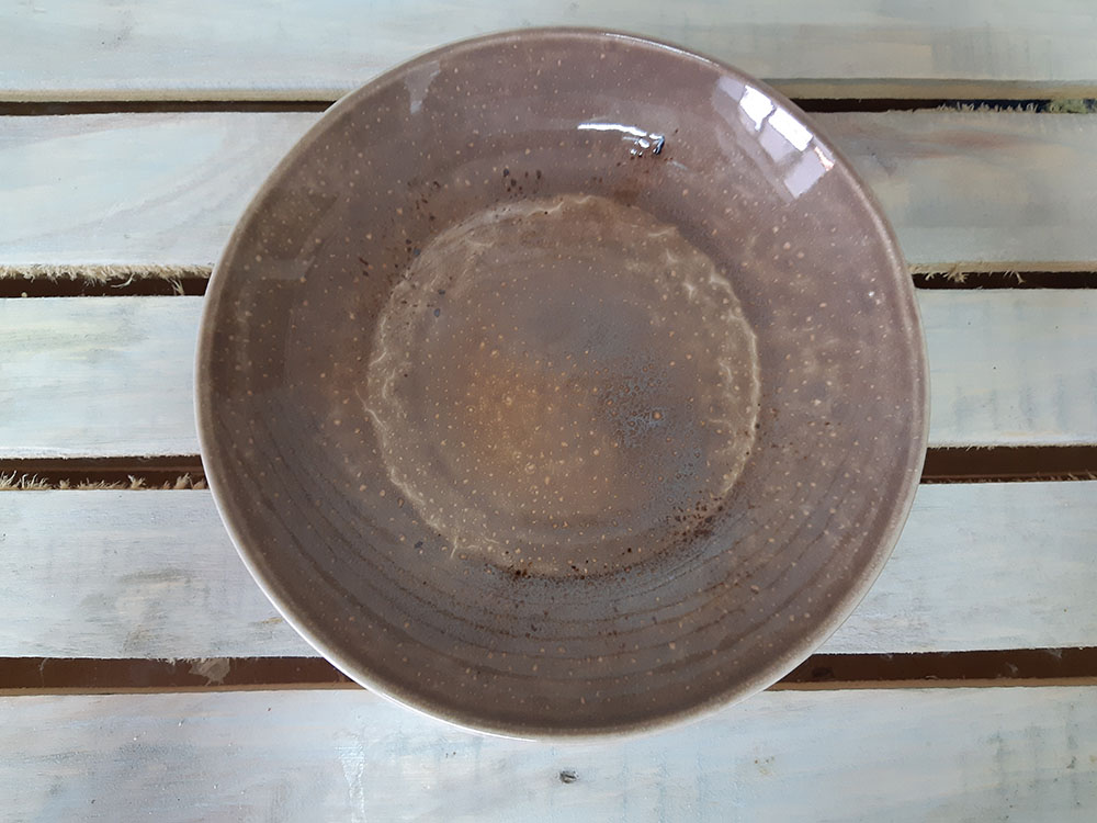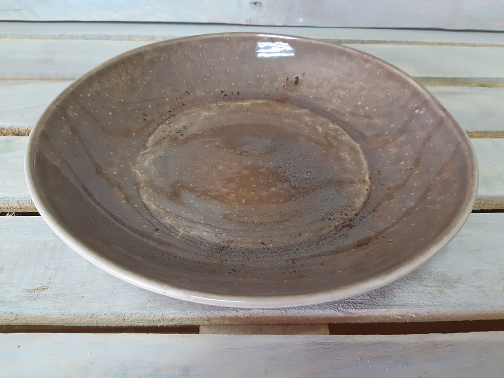 Тарелка большого диаметра с бортиками и широким дном позволяет сделать оригинальную выкладку блюда в соответствии с замыслом шеф-повара. Как говорится – ничего лишнего – поданное на такой тарелке блюдо не потеряется и будет выглядеть изысканно и аппетитно. Зеркальная глянцевая поверхность c серо-коричнево-белыми загадочными разводами, бликами и черными крапинами.